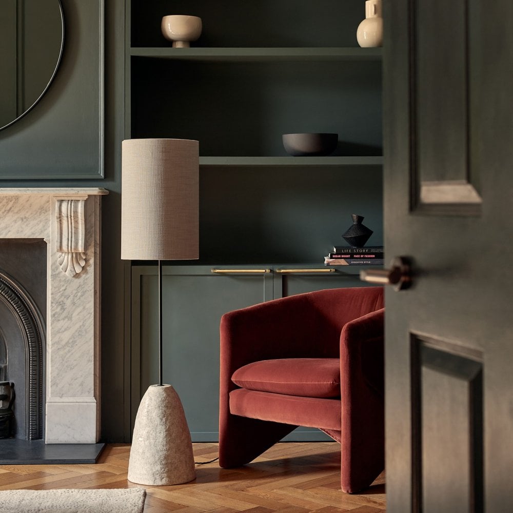 Blending modern design and organic qualities, the Finley midi floor lamp embraces a rough yet calm look. The bold ceramic base is both visually and physically textured and has been enhanced by a glossy glaze.