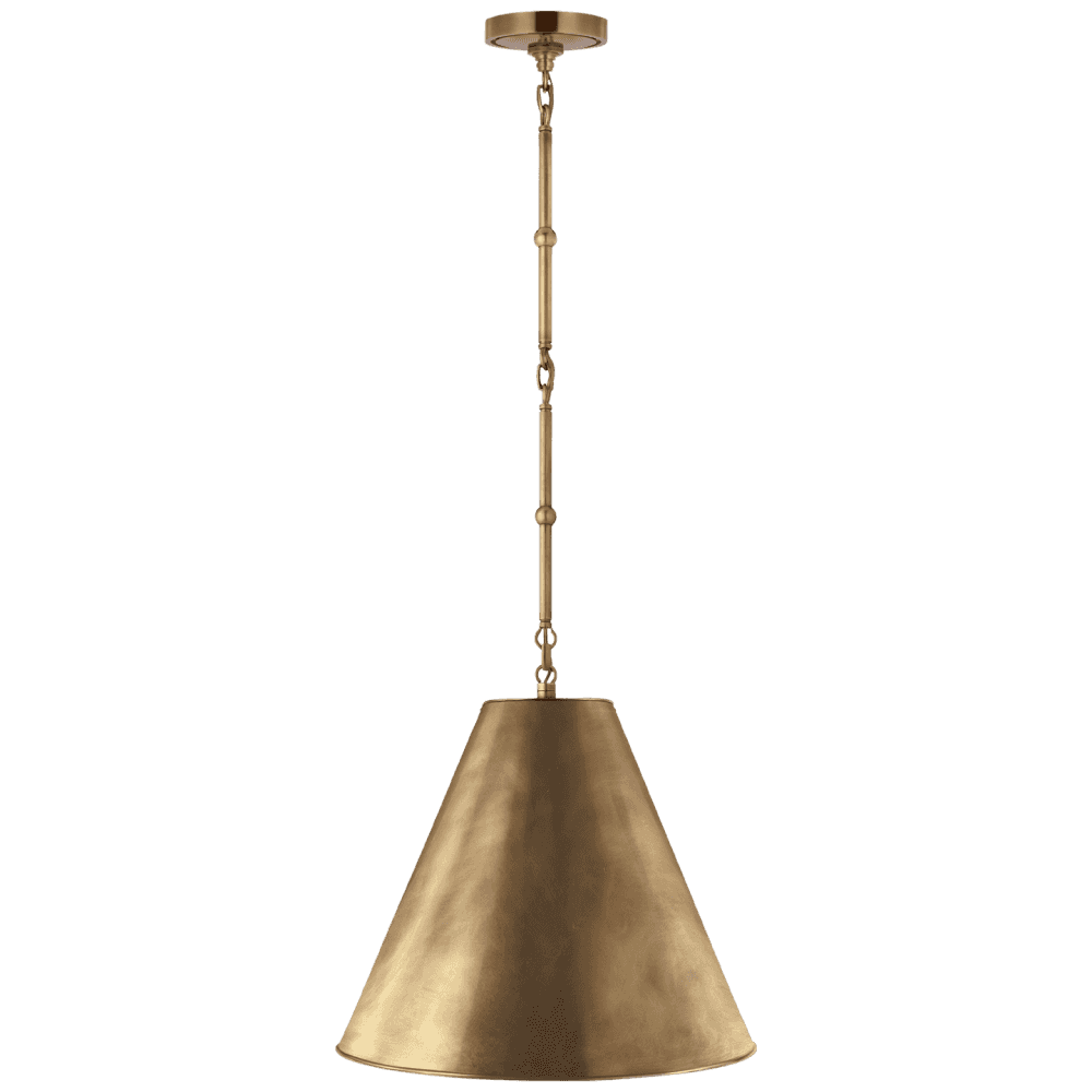 The Goodman Pendant Light is offered in a hand-rubbed antique brass finish, lending it a softly aged, warm golden tone with a handcrafted character. The shade shape is a tapered/conical drum‐style pendant, offering a broad downward light distribution while keeping the bulb somewhat hidden for a refined look. It is designed to be ceiling-mounted with a canopy and comes with either chain or down-rod suspension options, making it suitable for varied ceiling types including sloped ceilings.