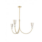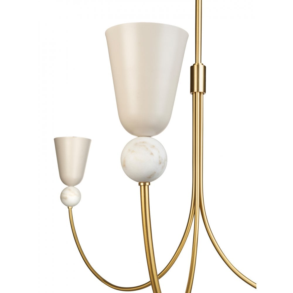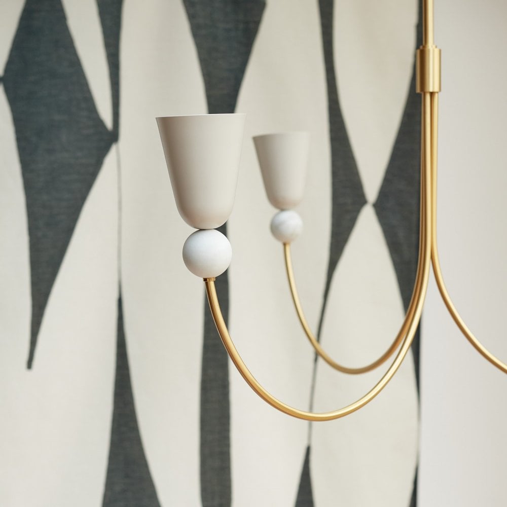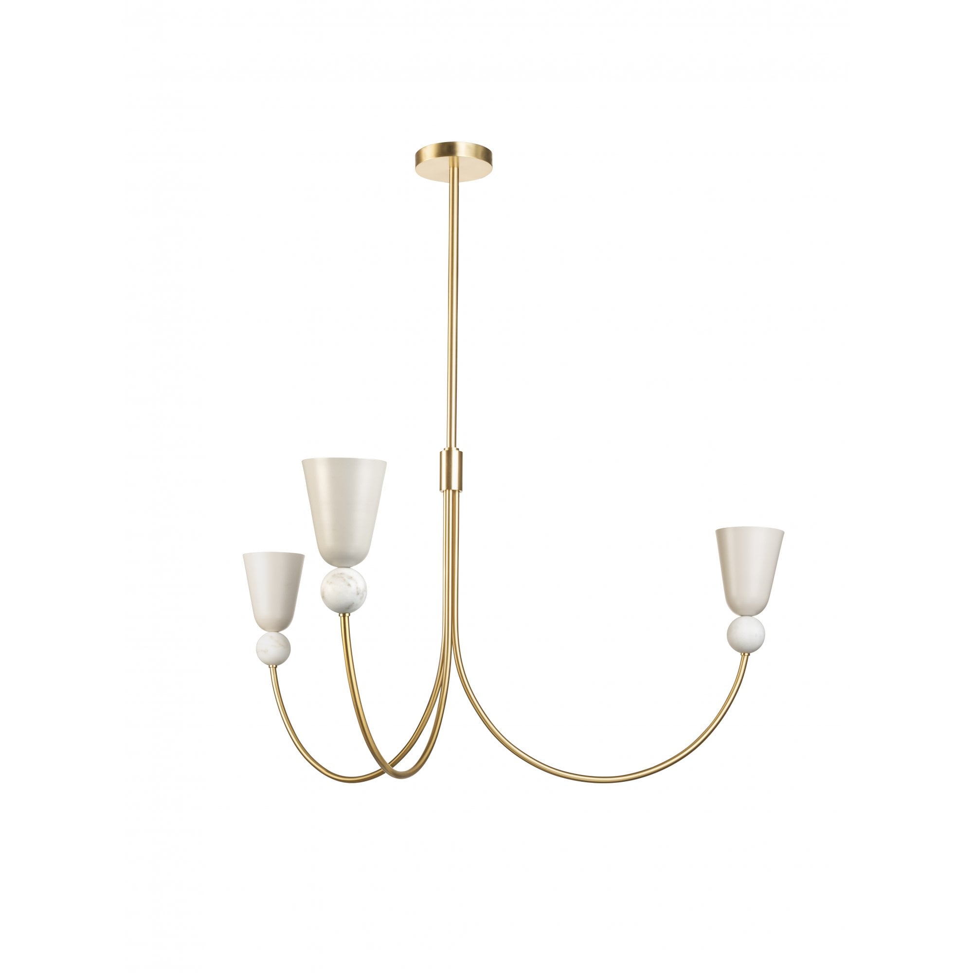 The Grayson 3 arm chandelier features three traditionally arched arms while sleek Brass metalwork creates a more modernised appearance. The inviting warmth of the powder-coated metal conical shades is further enhanced by a gold Calacatta marble ball underneath each for an extra touch of elegance.