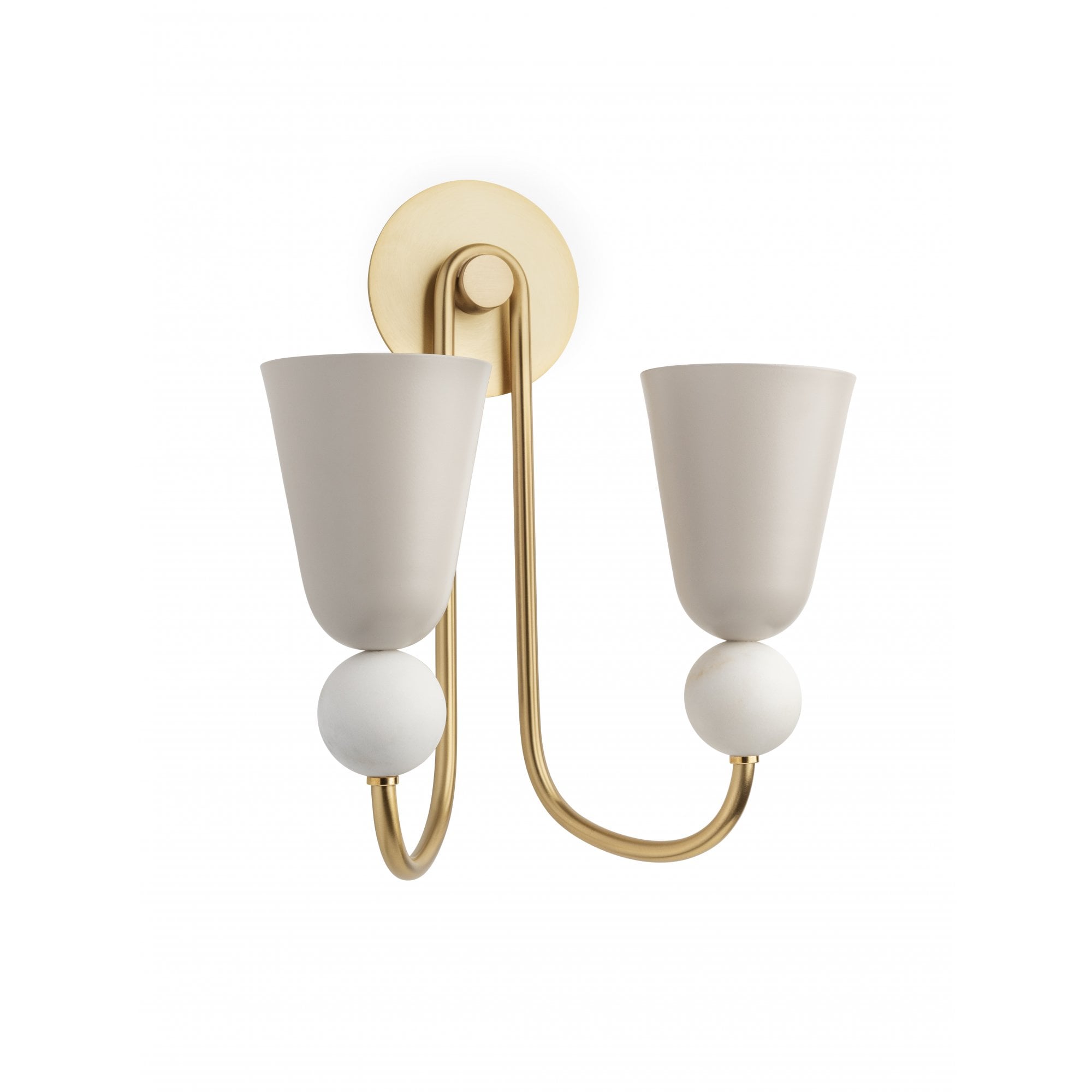 A simple yet elegant design, the Grayson double wall light features Satin Brass metalwork, and two powder-coated metal shades in an off-white finish that emit a soft, inviting glow. Adding an extra touch of luxury, Italian Gold Calacatta marble balls positioned beneath each shade elevate the refined form.