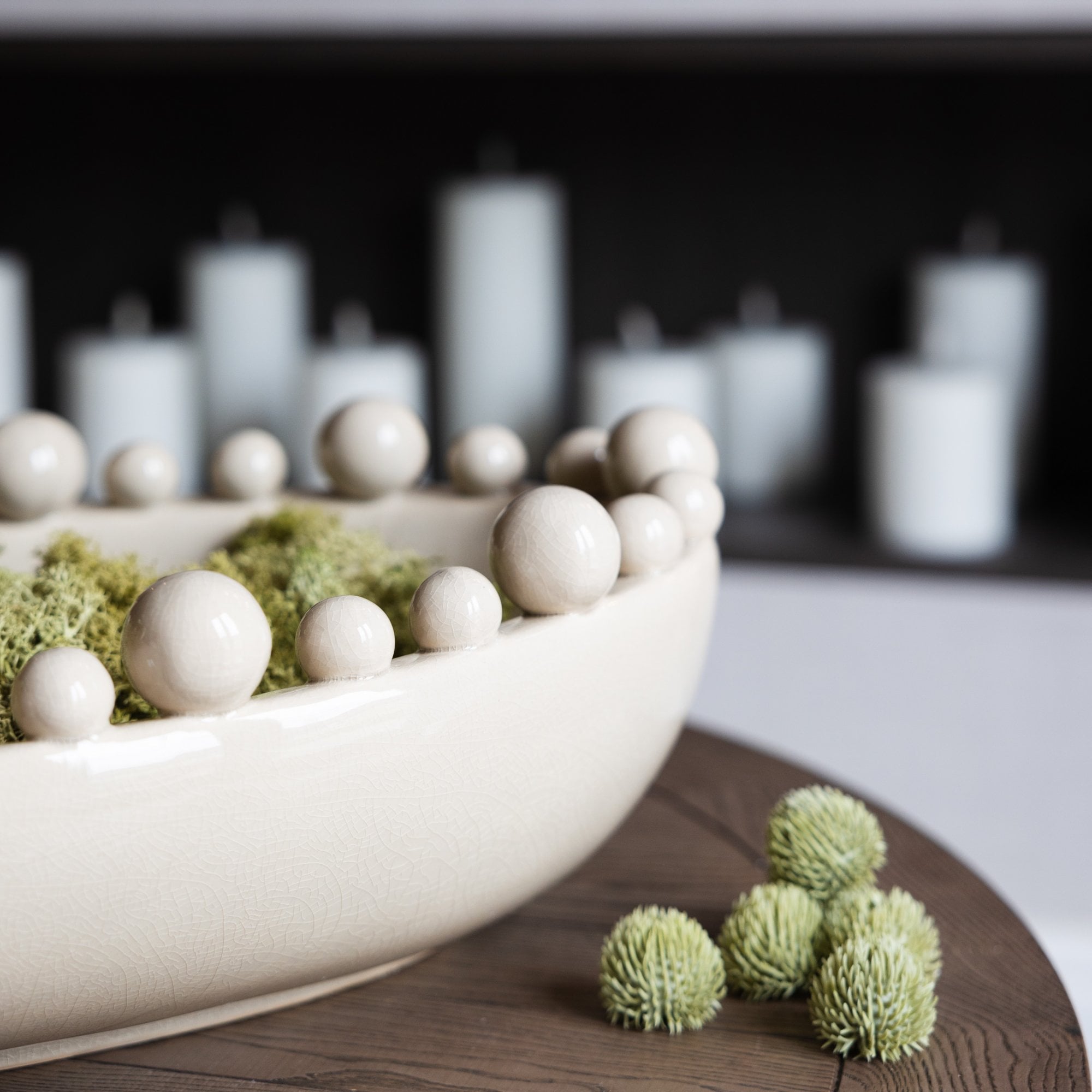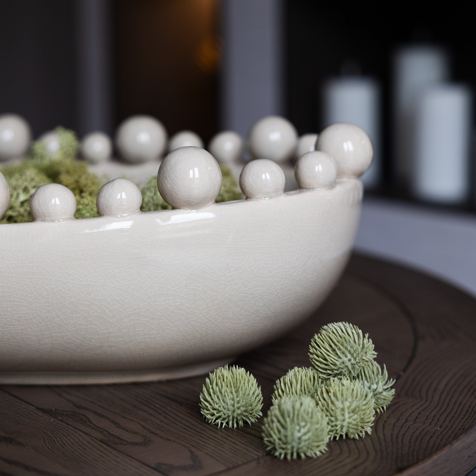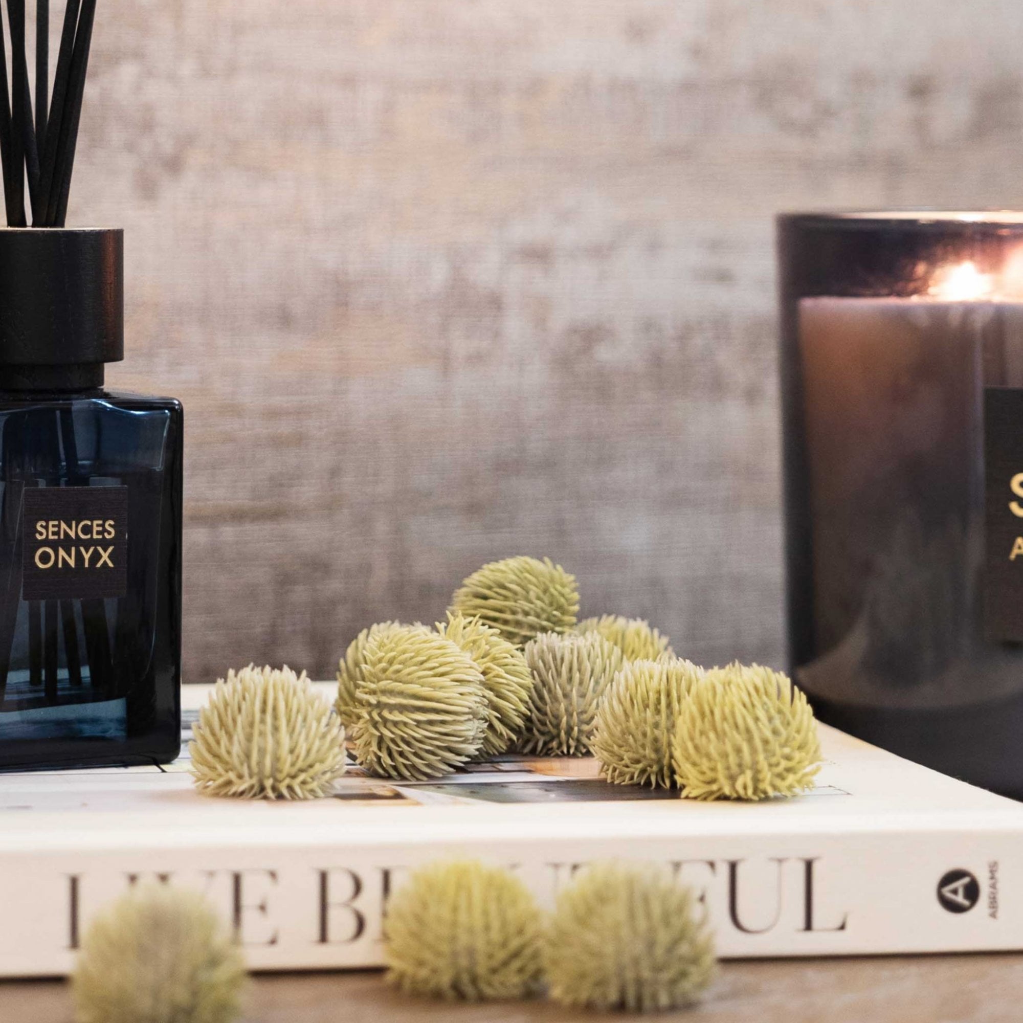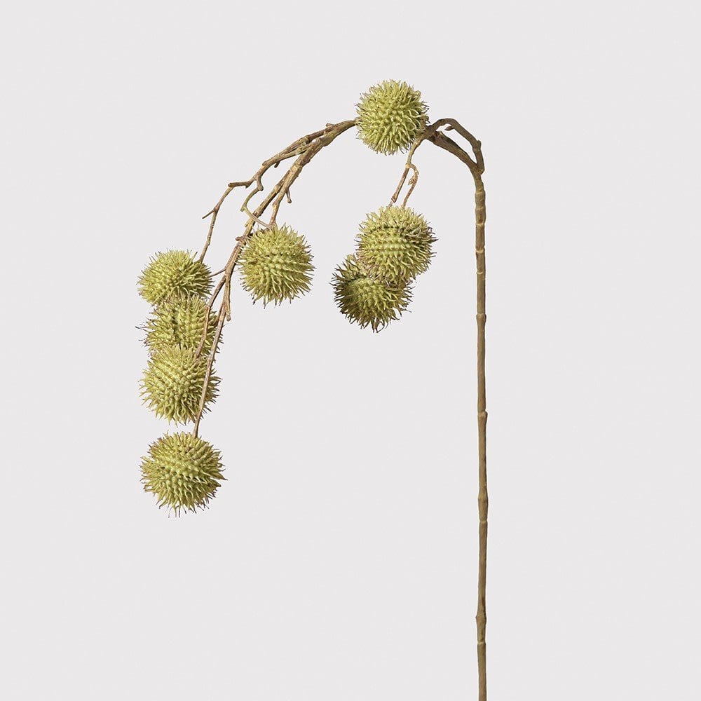 This single stem of faux Green Echinops Spray features a slender, 55cm long, and slightly textured green stalk. At the top of the stem, the focal point is a spherical cluster of spiky, globe-like flower heads, resembling thistles