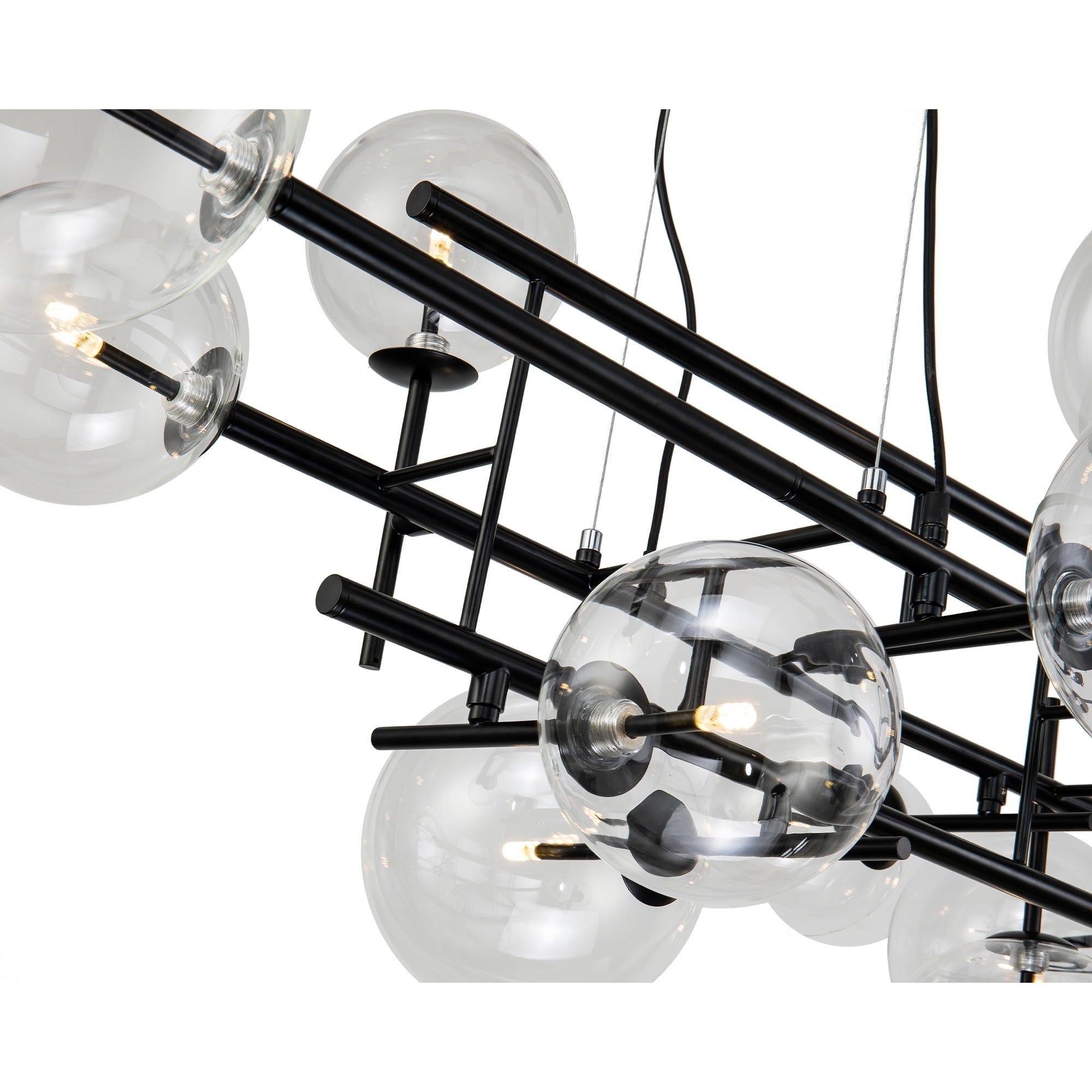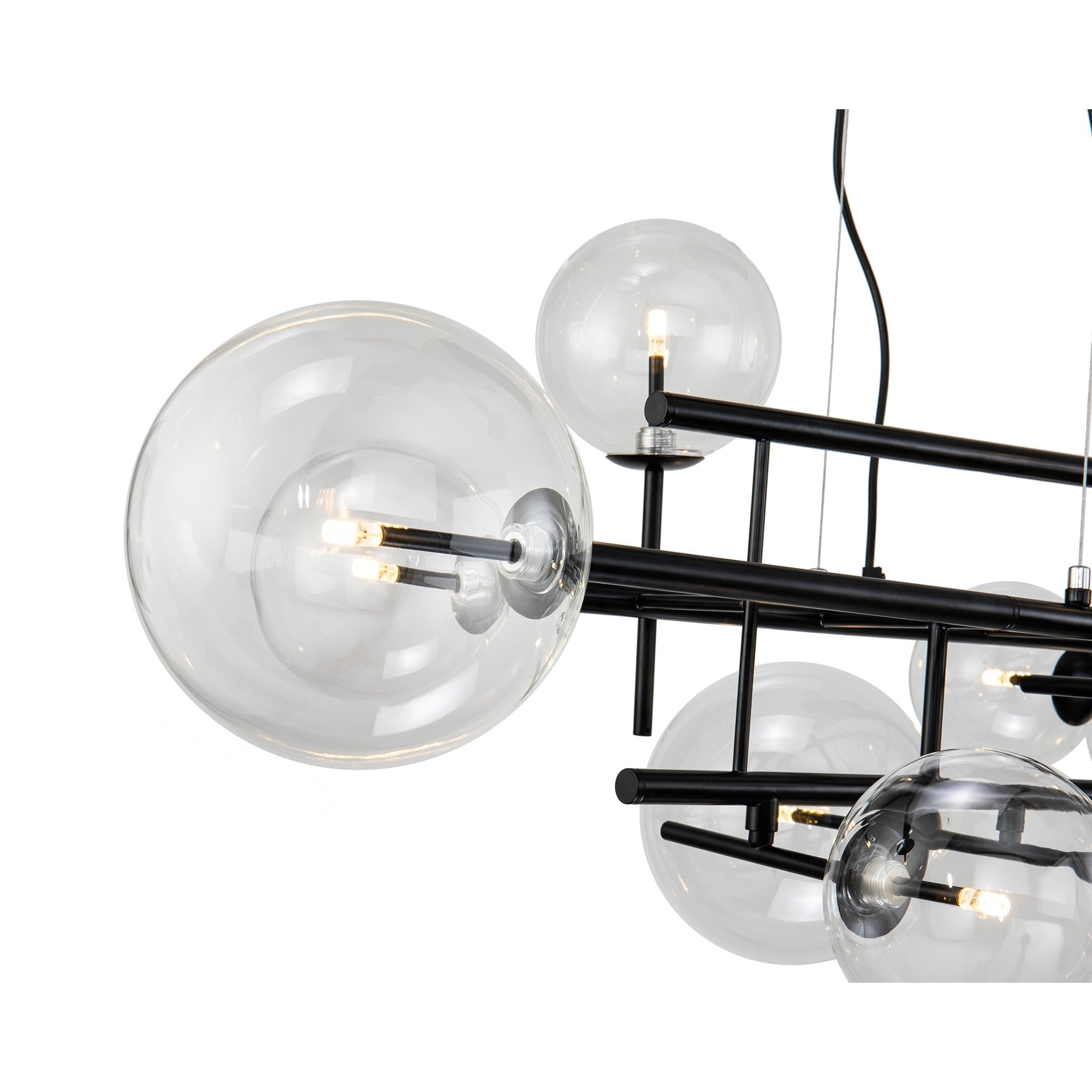 Elevate your dining room with the striking Icardi Pendant Light, featuring exquisite clear glass globes paired with a sleek matt black finish. This playful yet sophisticated design makes a bold statement, allowing your personal style to shine. Its hand-blown glass spheres float elegantly, creating an ethereal ambiance perfect for both residential and hospitality settings. (Light bulbs not included, requires 16 x G4 LED 3W. For dimmable functionality, please use compatible bulbs and switches.)