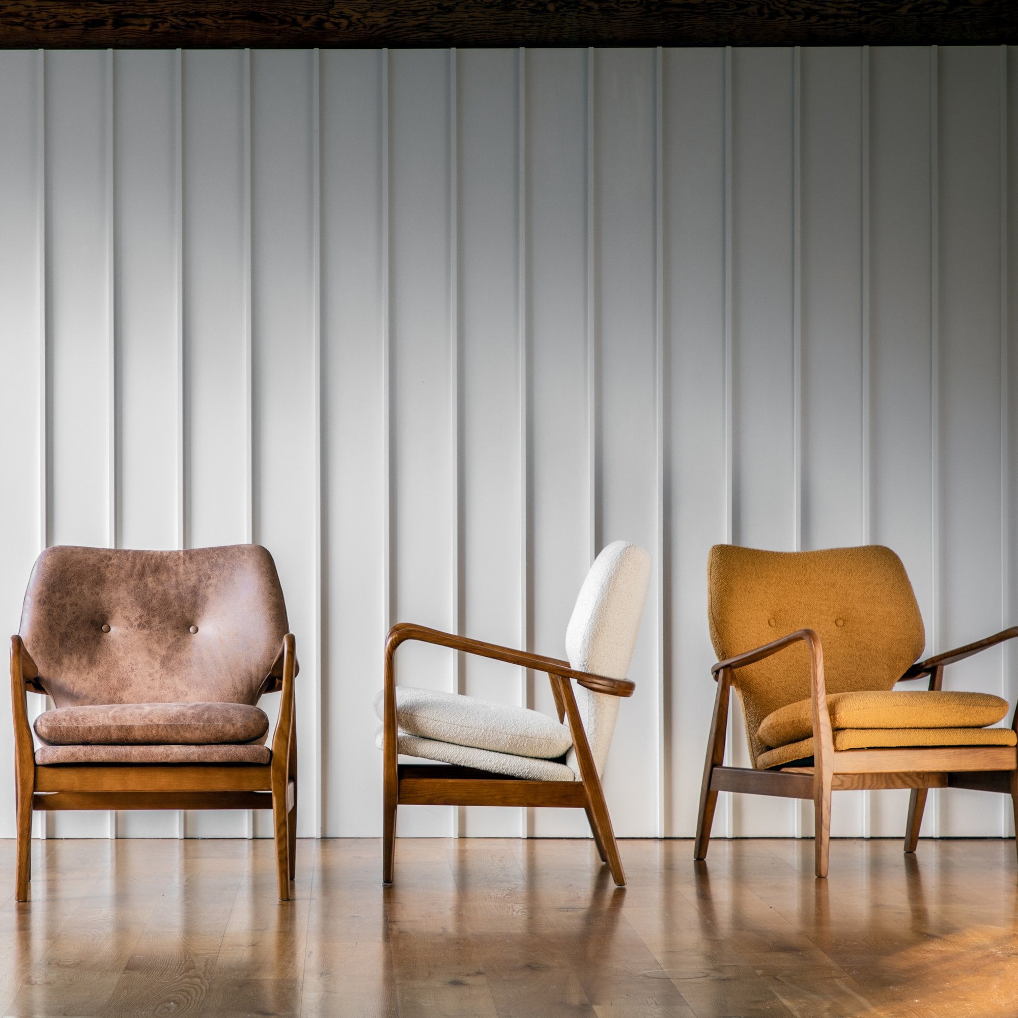 This remarkable Mid-Century style chair features an elegantly shaped solid oak wood frame which makes it a stand out piece in any interior. It is upholstered in cream boucle style fabric with button details and a soft cushion for comfort.