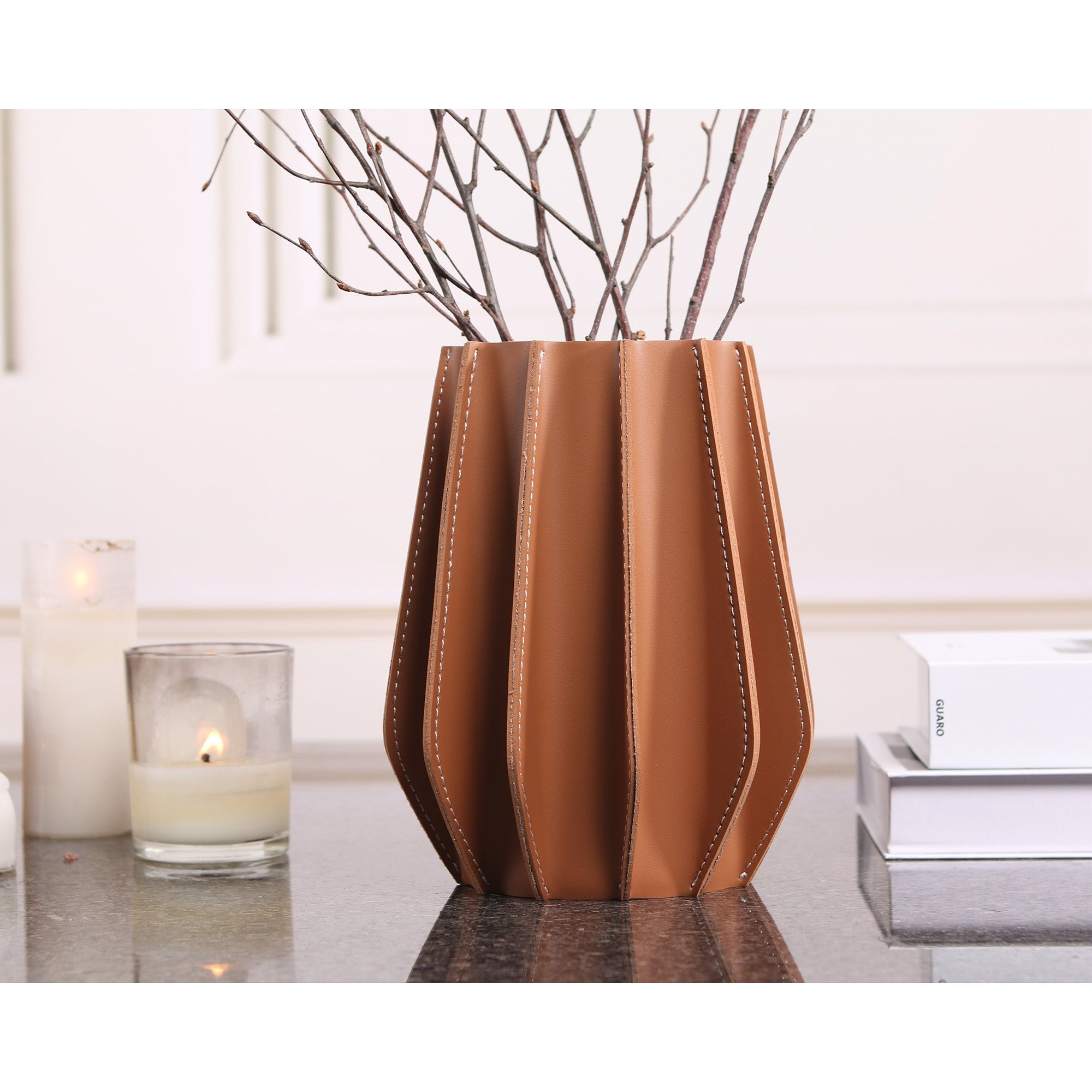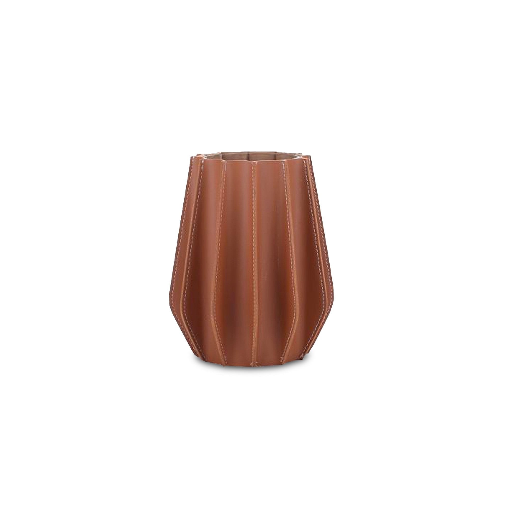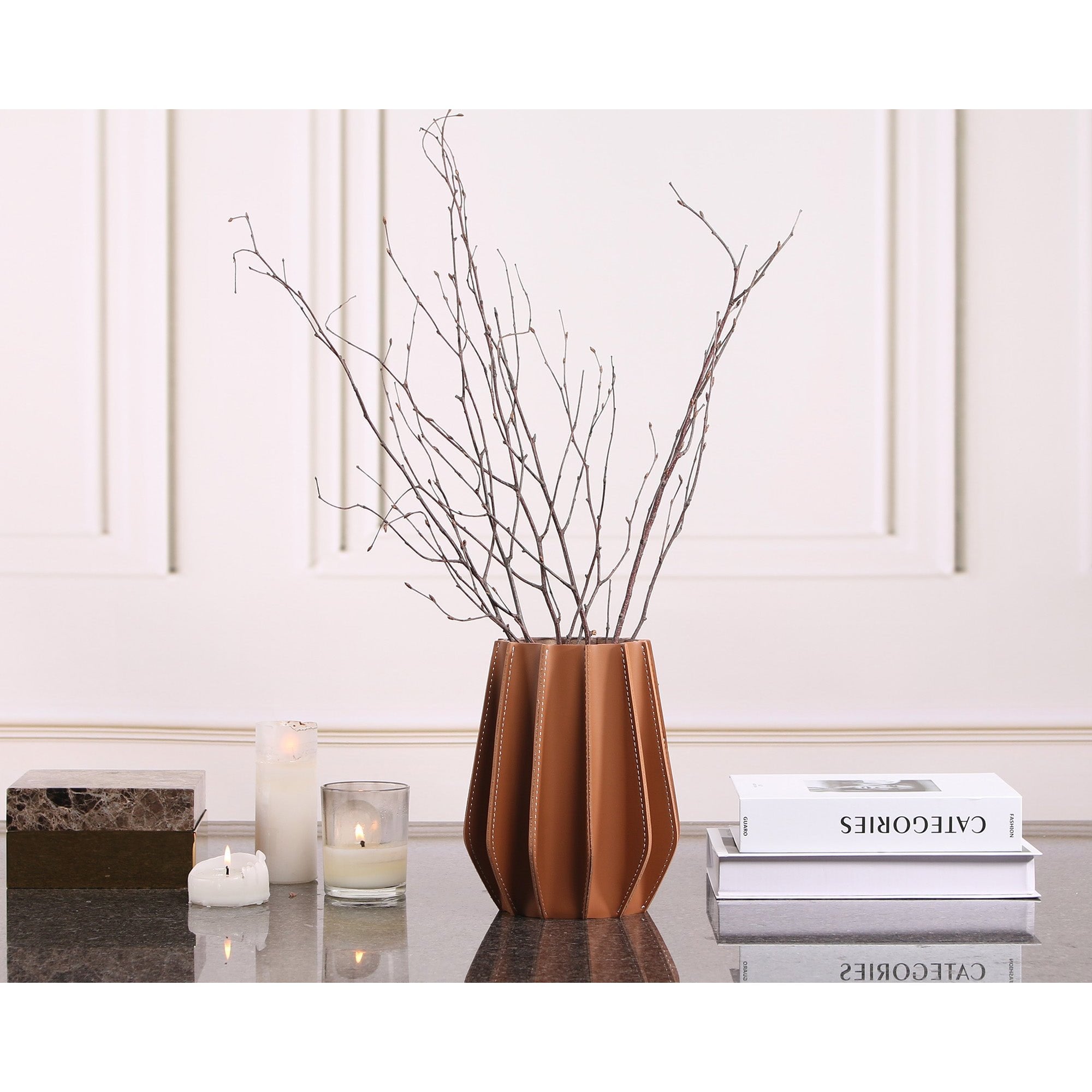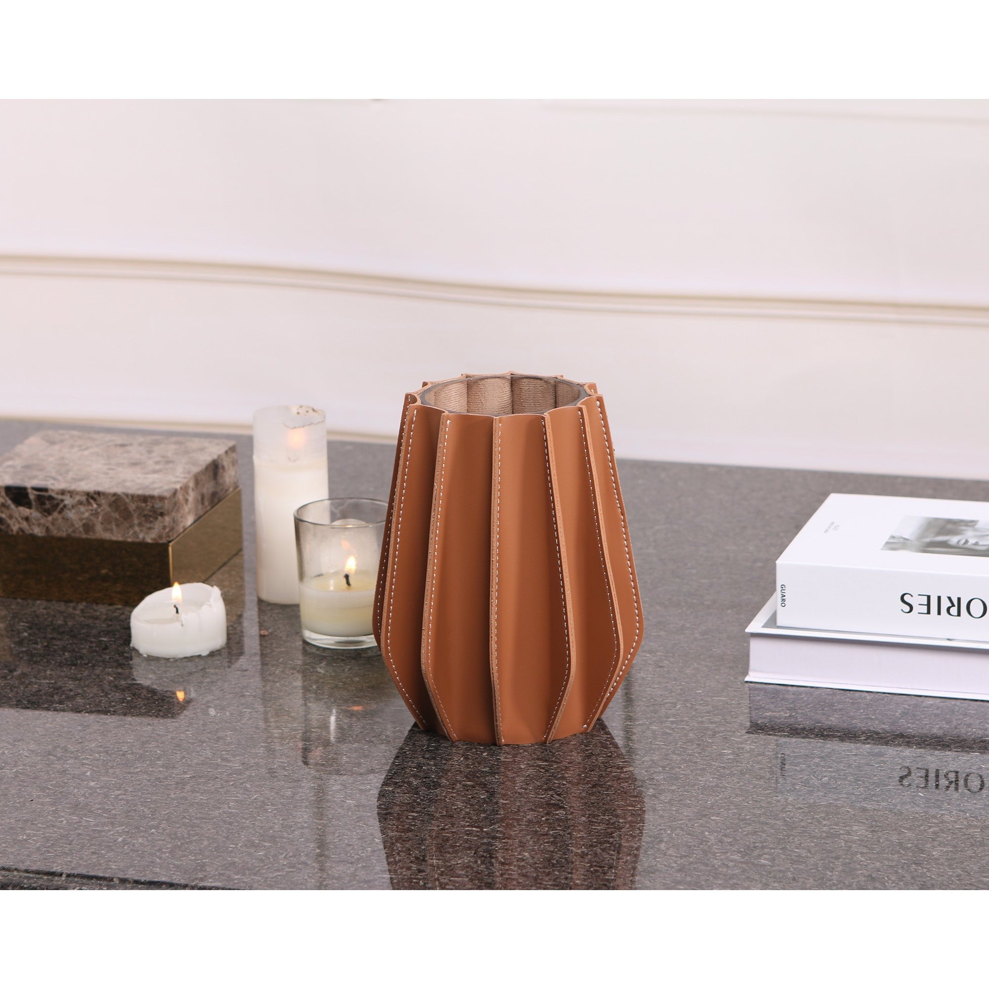 Crafted to enchant, the Juana Vase seamlessly fuses sumptuous brown PU leather with sleek glass. This eye-catching piece boasts a mesmerizing pattern and intricate design, effortlessly enhancing both modern and traditional decor. Perfect for residential and hospitality environments, the Juana serves as a distinct focal point that sparks curiosity and admiration. Whether nestled on a mantelpiece or adorning a coffee table, this charming vase invites appreciation and exploration, leaving a lasting impression on your guests.