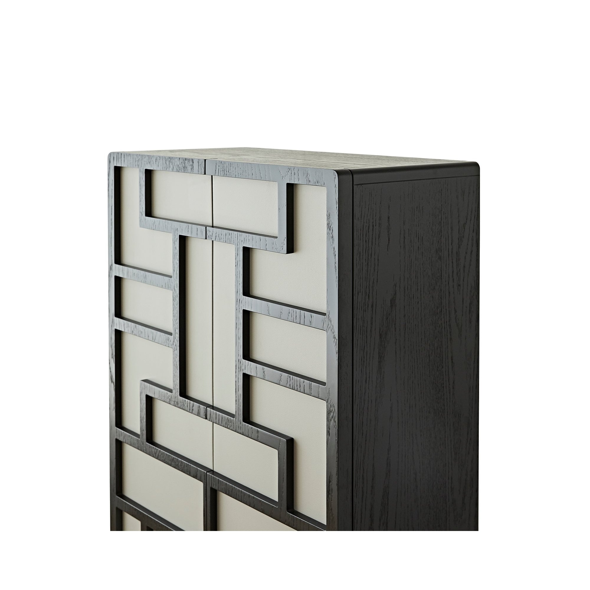 Introducing the Kamako Cabinet—an exquisite fusion of Art Deco elegance and modernist Asian aesthetics. Crafted from wenge-finished ash and textured grey embossed faux leather, this stylish bar cabinet features three shelves, perfect for showcasing your treasured items. Add character and sophistication to any home or hospitality setting with this stunning piece.