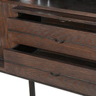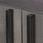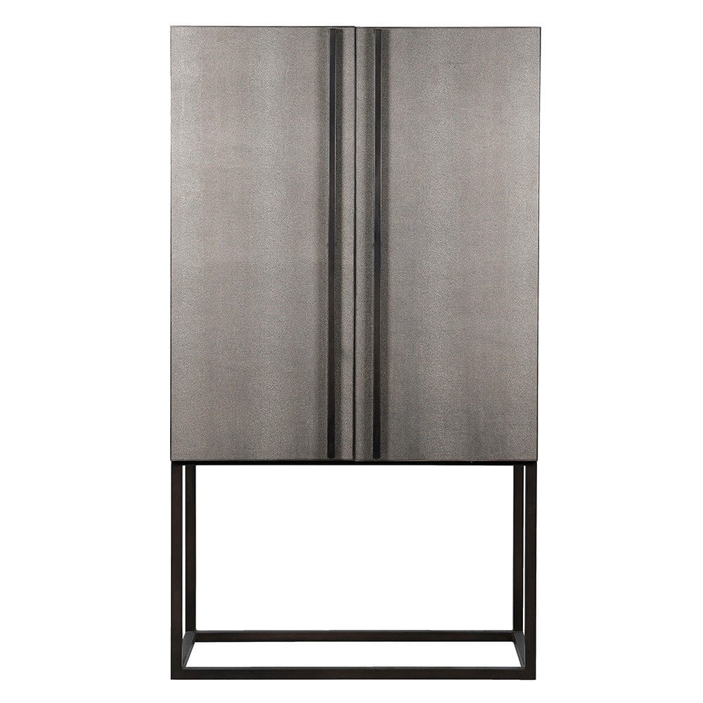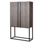 The Kent 2 Door Bar Cabinet is a stylish furniture piece crafted from textured grain oak. It features rustic iron handle and hardware with a wood interior, adding a touch of sophistication to its design. This sideboard offers both functional storage and aesthetic appeal, making it a versatile and attractive addition to any room.