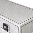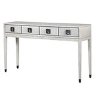 The Kora console table features a clean white finish and is adorned with square black handles on its four drawers, adding a touch of contrast and sophistication to its design. This console table is not only functional with ample storage but also aesthetically pleasing, making it a versatile addition to any room's décor.