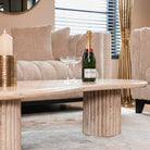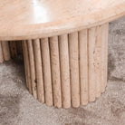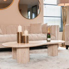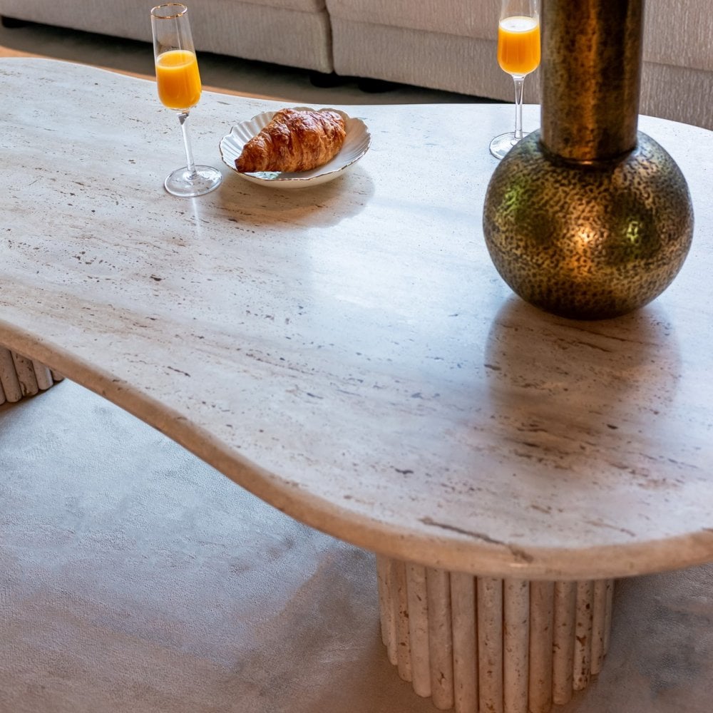The La Contera coffee table is a beautiful piece of furniture that perfectly fits in your living room. The table has a modern design with textured legs and an organic travertine and plywood finish.