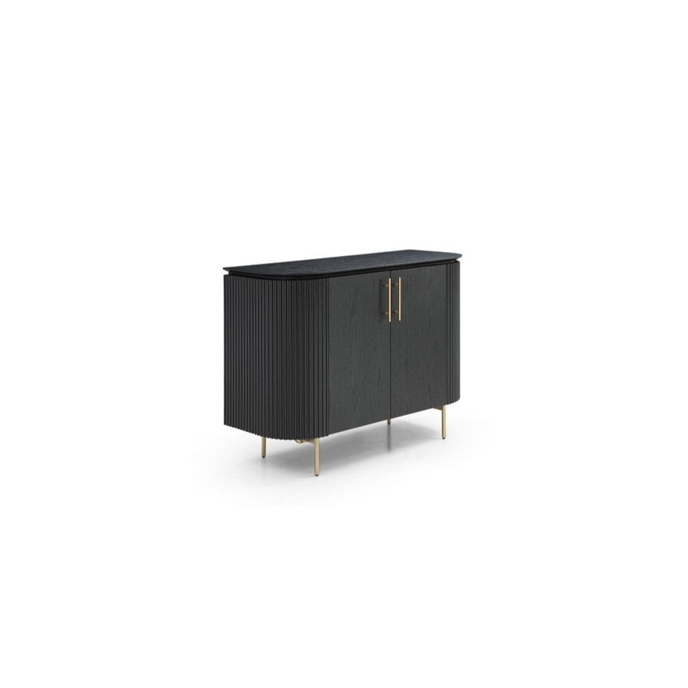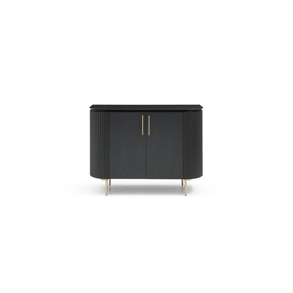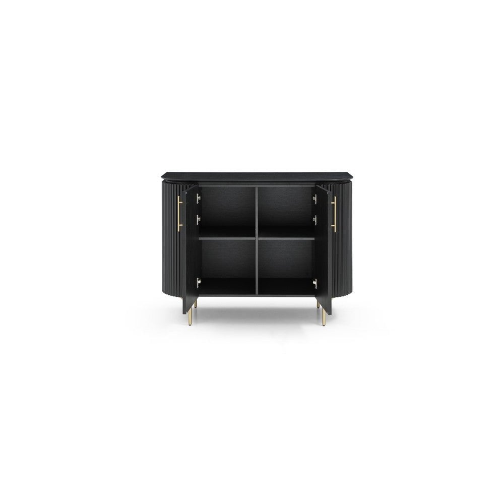 The Lantine 2 Door Cabinet is a stylish and functional addition to any home. Featuring a Matte black oak finish on the table top and doors, ribbed end panels, brass legs and handles, this cabinet is sure to make a statement in your home. With an internal 4-part shelving system for storage, the Lantine 2 Door Cabinet is the perfect piece to complete any space.