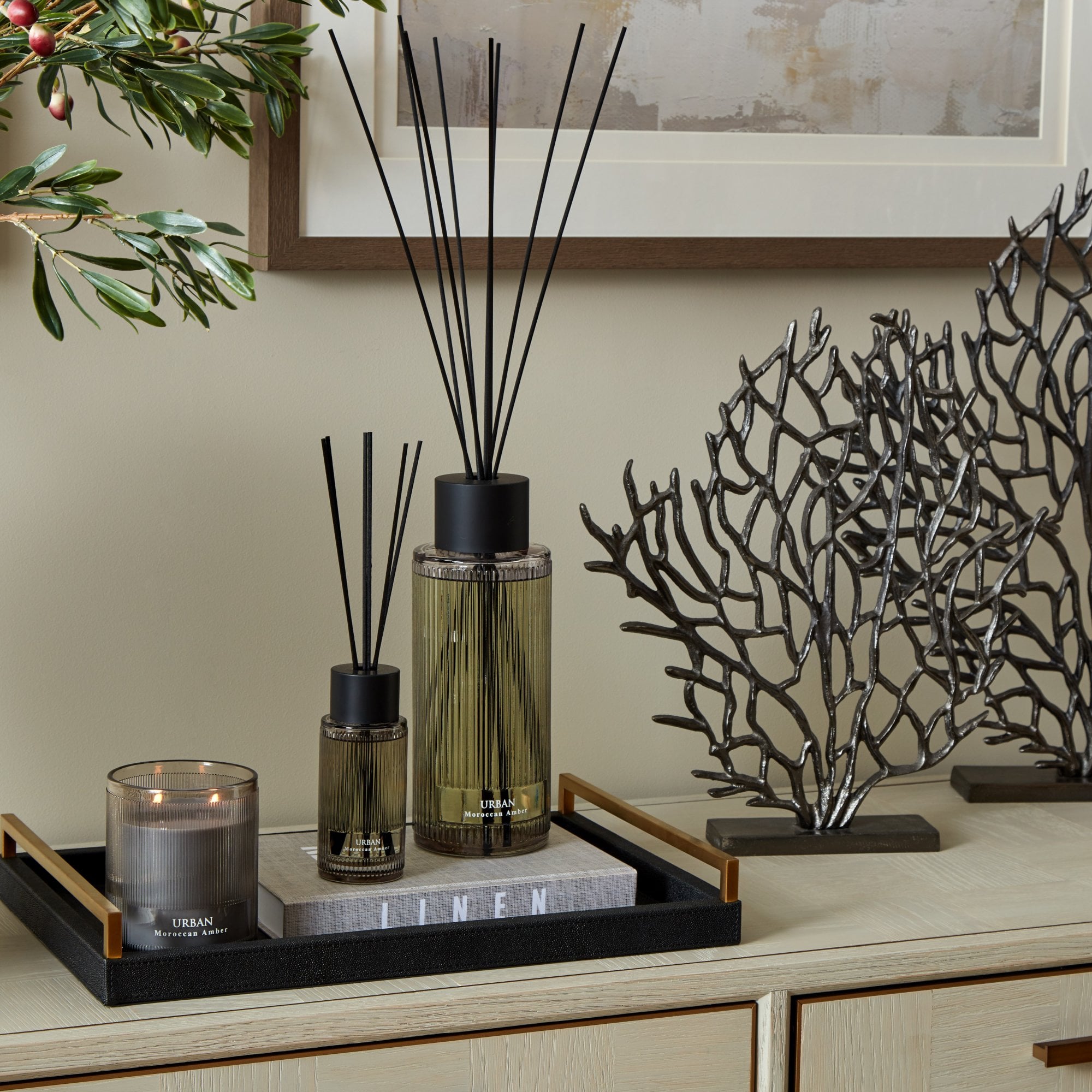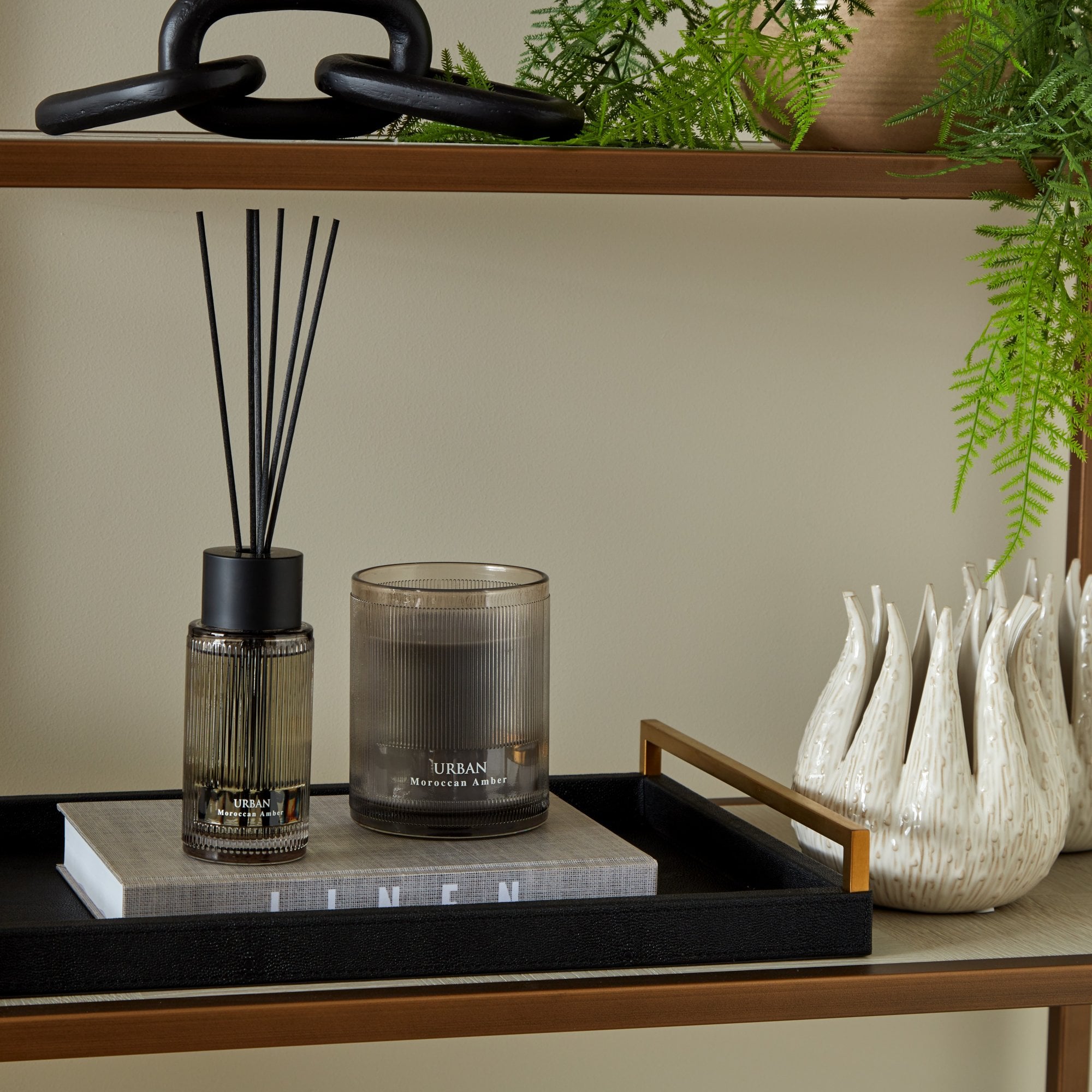The Large Urban Amber Diffuser comes in a grey ribbed glass bottle with black accents. This masculine look has the same fragrance as our Sences Amber Alang Alang 500 & 2200ml reed diffusers but with a sleeker bottle and cooler toned finish.