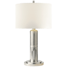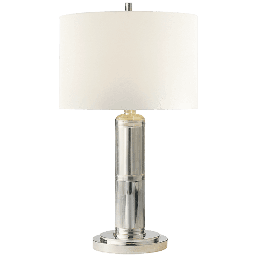 The Longacre Table Lamp, designed by Thomas O'Brien for Visual Comfort Signature, is a refined table lamp that combines Art Deco-inspired elegance with modern functionality. Its polished nickel base features a finely ribbed stem and stepped round base, exuding a timeless sophistication. The soft linen shade complements the metallic finish, emitting a warm and inviting glow.