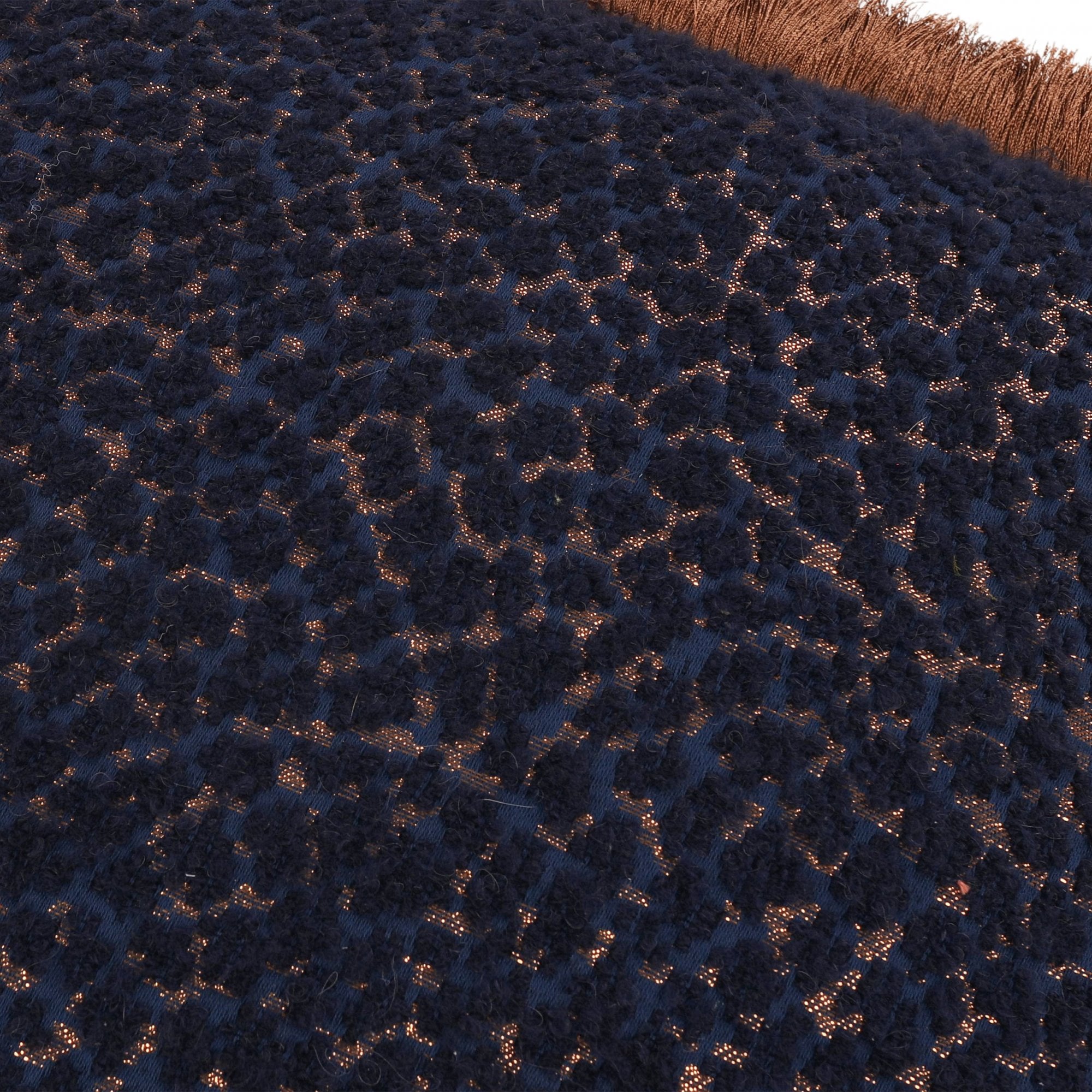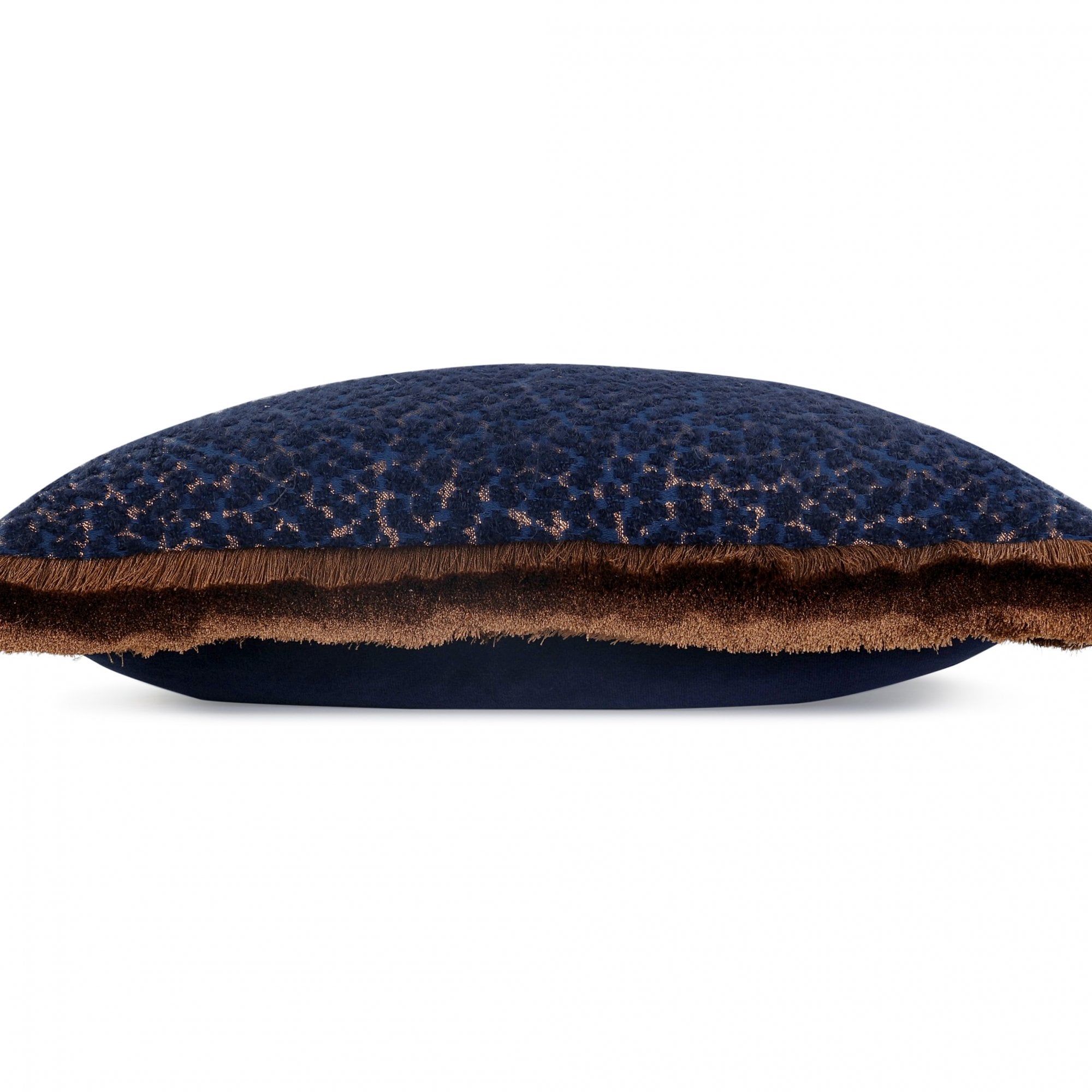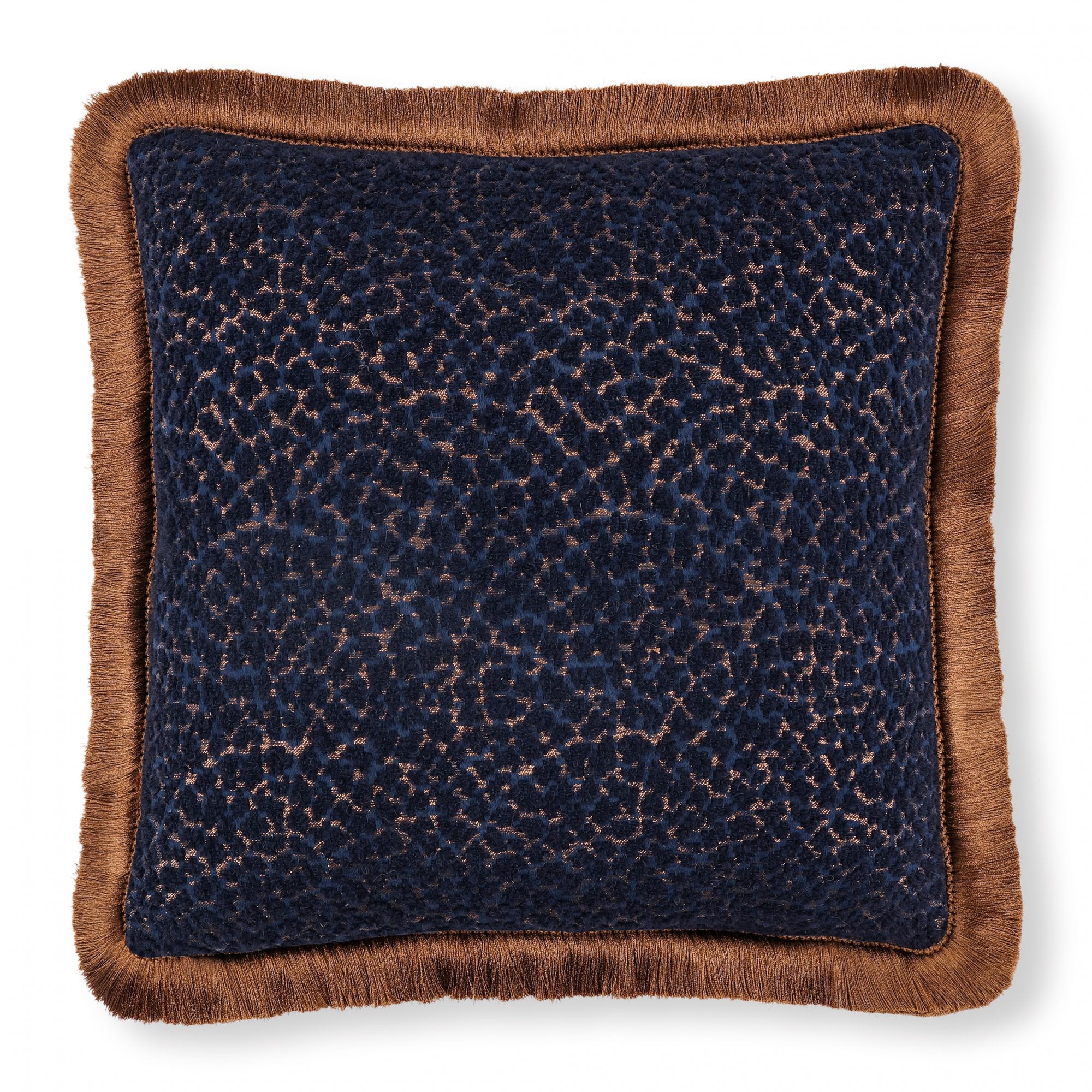 An incredibly soft, textural wool bouclé cushion with a dash of leopard vivacity and a hint of sparkly metallic, embellished by a beautiful, sumptuous cut ruche fringe.
