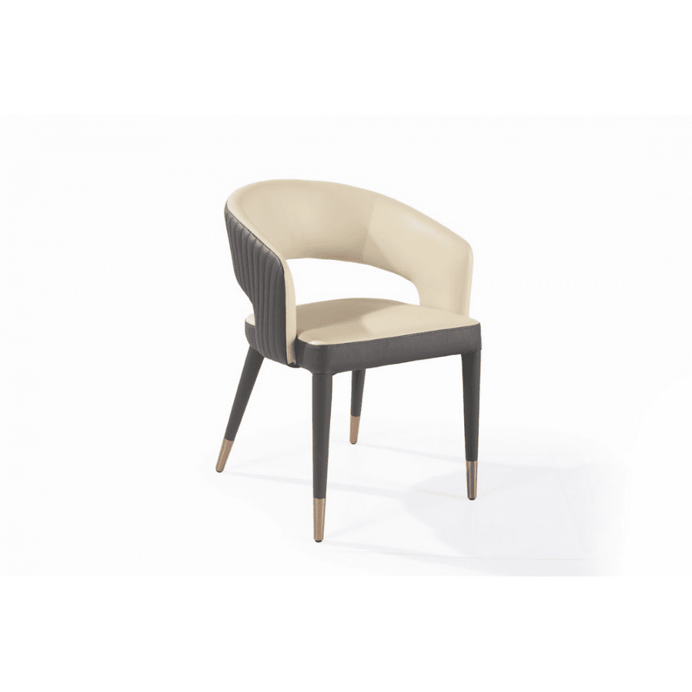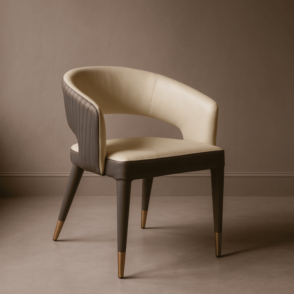 The Lydia Dining Arm Chair blends classical elegance with contemporary refinement. Its gently rounded shape hugs the body, while the dual-tone palette adds depth and nuance. Cream tones create softness and warmth, while the contrasting shell introduces a cooler, architectural note. This is a chair that balances tradition and modernity with perfect precision. Subtle rose-gold detailing at the feet gives Lydia a final flourish — a barely-there touch of glamour that elevates the piece even further. It works beautifully in fine dining settings, luxury hospitality environments, or as a refined accent piece in residential interiors.