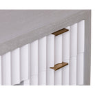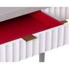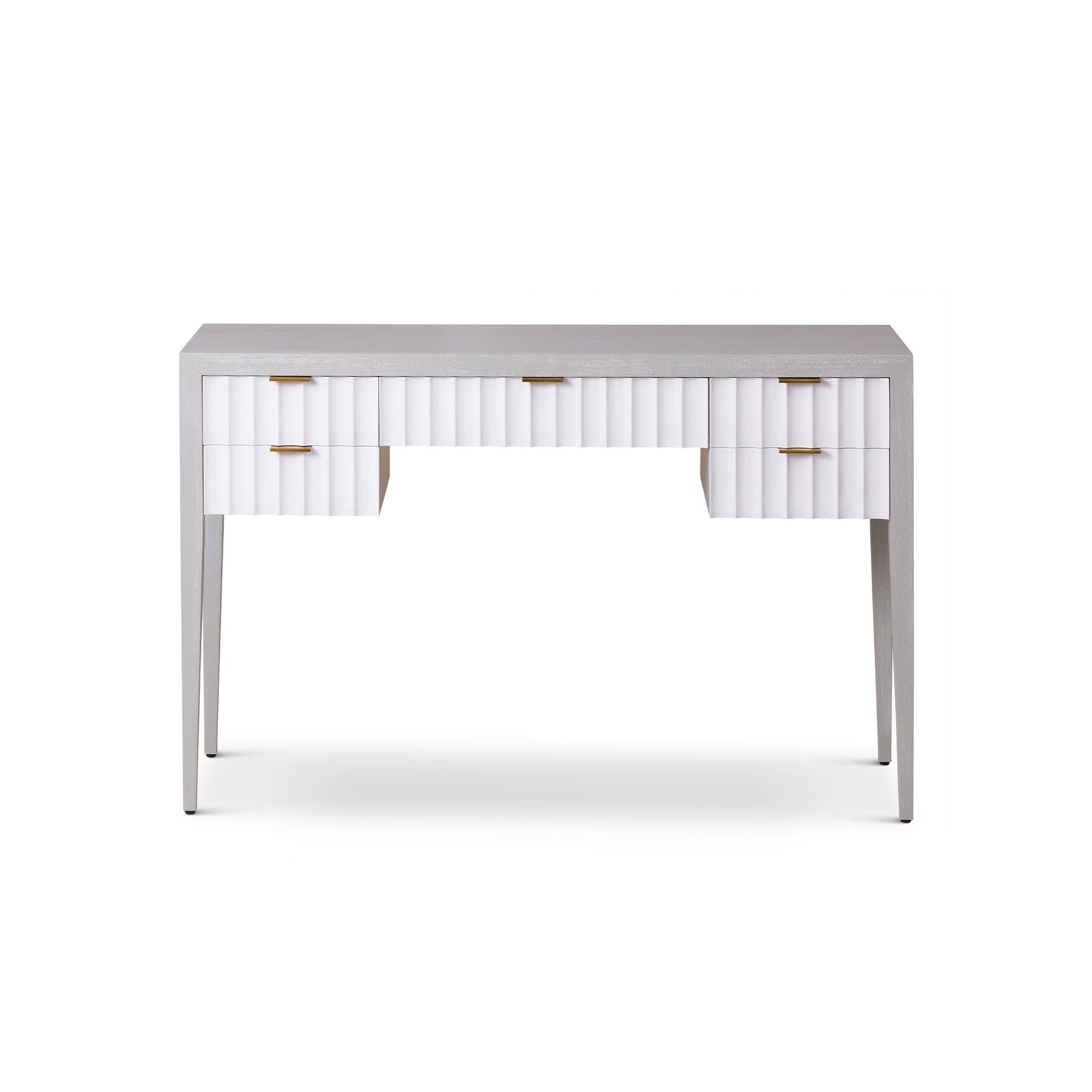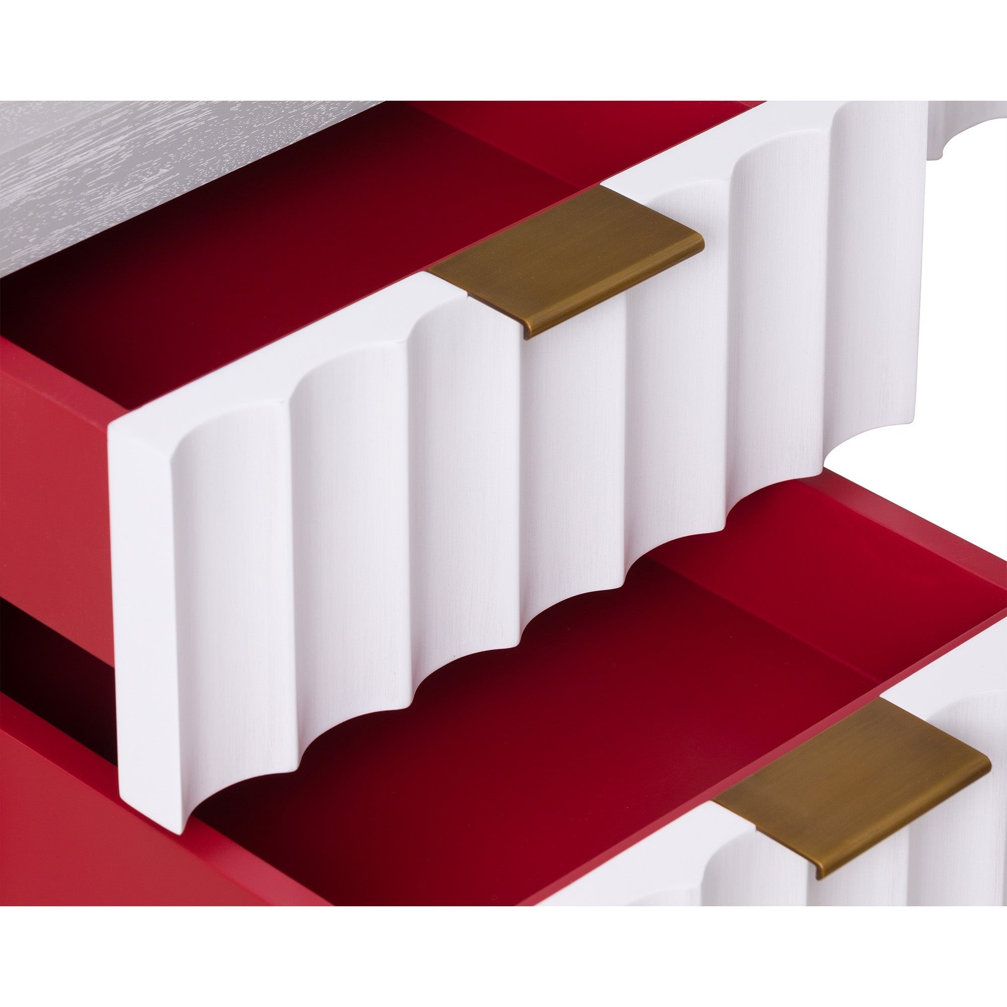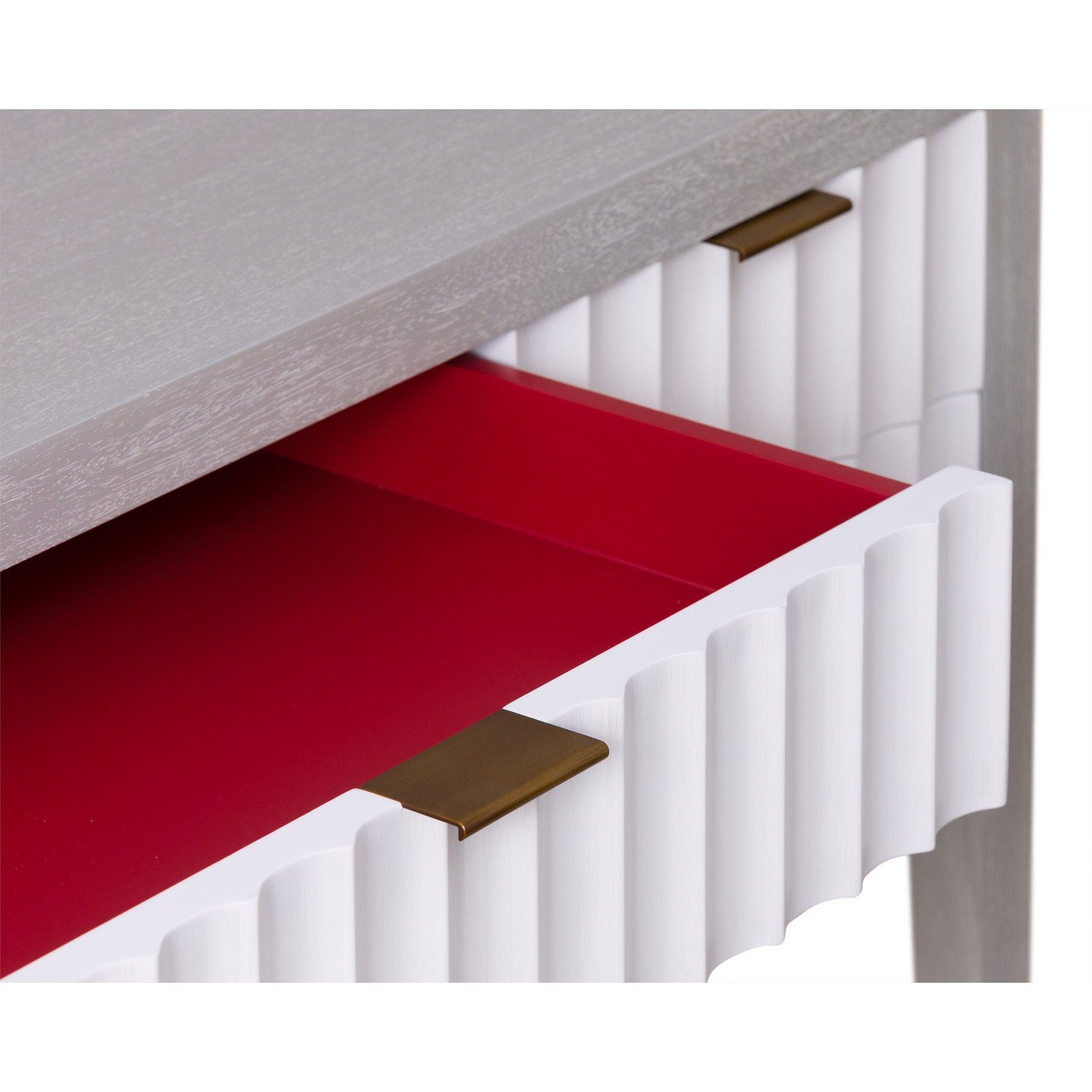 The Malibu Console Table captivates with its understated luxury, combining exquisite grey satin veneer and hairline antique white detailing. Brushed brass accents add sophistication, while red-lined drawers introduce a striking contrast. This versatile table is an ideal blend of style and function for residential and hospitality spaces, making it a perfect choice for showcasing decor or organizing essentials. Elevate any room with the Malibu Console Table's contemporary flair and timeless charm.