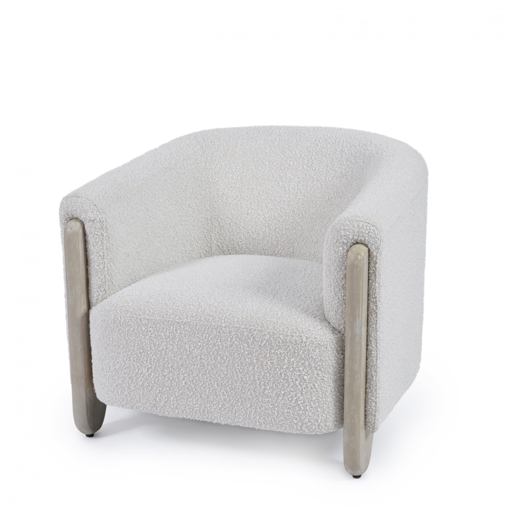 Introducing the Ivory Armchair, designed with an organic-shaped silhouette and white-washed solid oak legs. This chair is covered in soft Bouclé fabric, providing a comfortable medium-hard sitting experience with foam-filled seat and back. Sitting slightly lower than a standard accent chair, it makes a striking addition to any area in your home.
