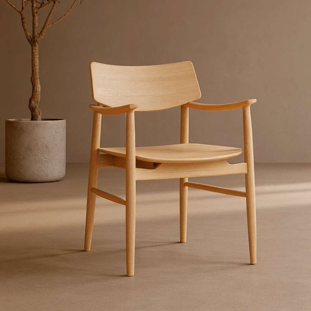 Defined by its restrained detailing and clean silhouette, the Mono Dining Arm Chair offers sculptural refinement in solid oak. The curved back support with negative inlay gives the piece a sense of movement, while the integrated armrests extend the lines of the frame with clarity and precision. Nothing is excessive — every curve and edge is considered, creating a chair that feels equally suited to calm, minimalist interiors or warm, textural dining spaces. Quiet in form, confident in presence.
