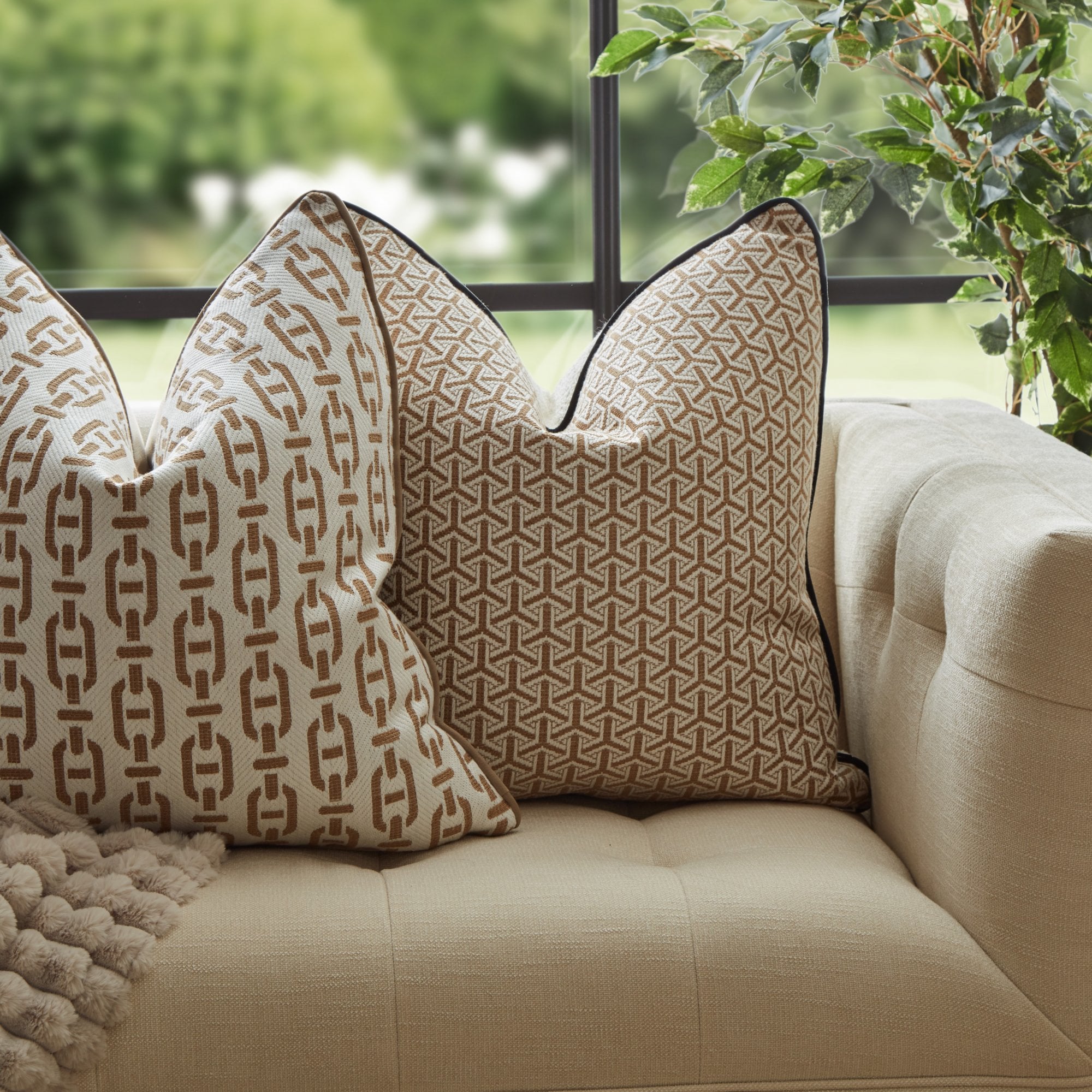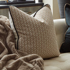 These cushions come with luxury duck feather inserts. Bold interlocking geometric pattern in Almond with Ivory Boucle reverse and contrasting soft, Black Velvet piping. The Decorum collection of cushions is an elegant and sophisticated palette that is perfect for layering with the other prints from our collection, or simply adding subtle patterns to a neutral scheme.