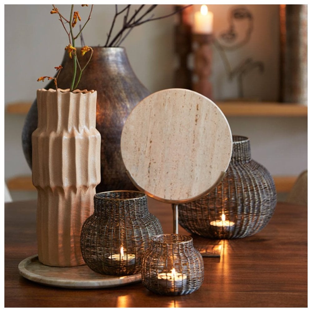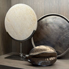 Sand Travertine ring on a luxurious bronze stand. Perfect for console table styling to add depth and drama to your interior.