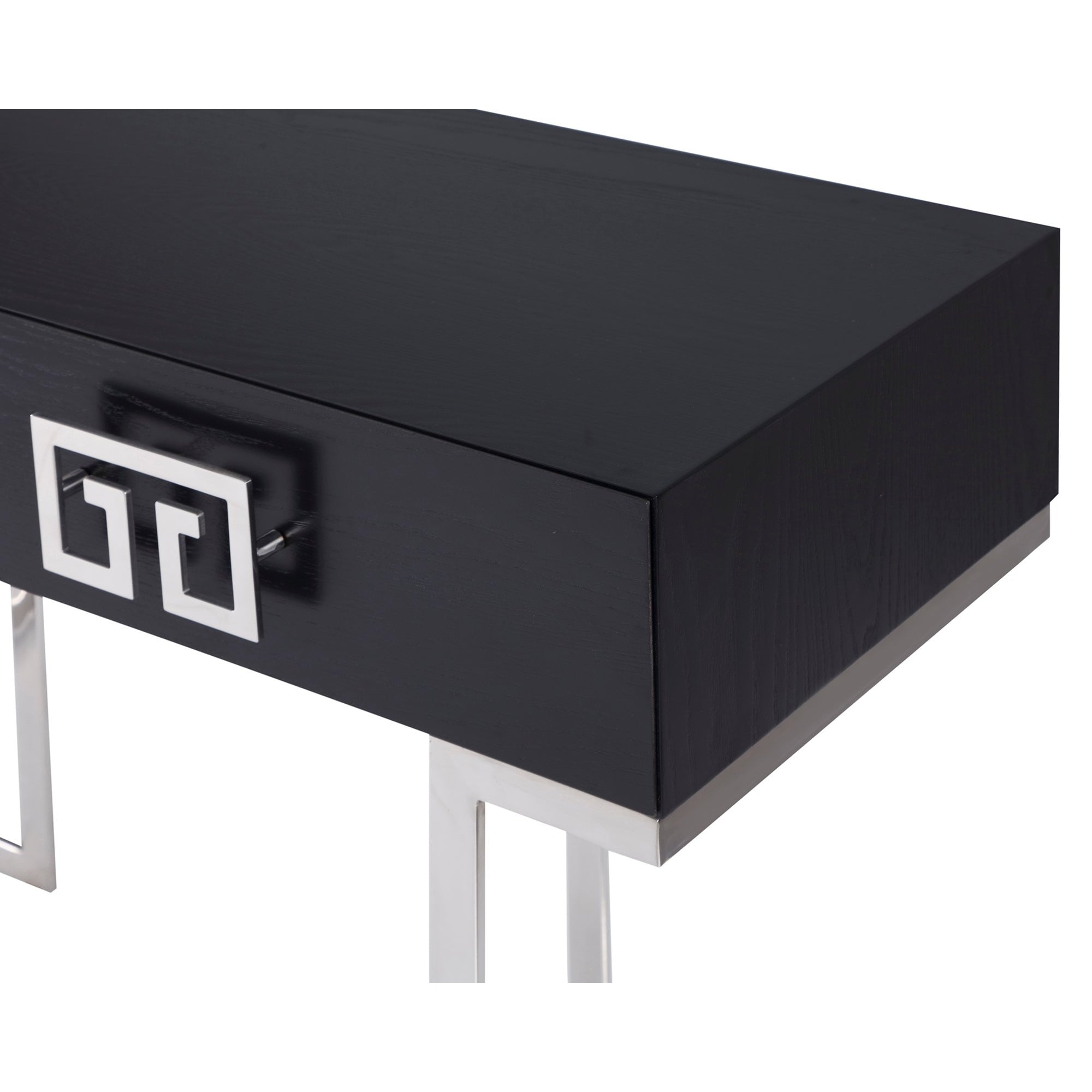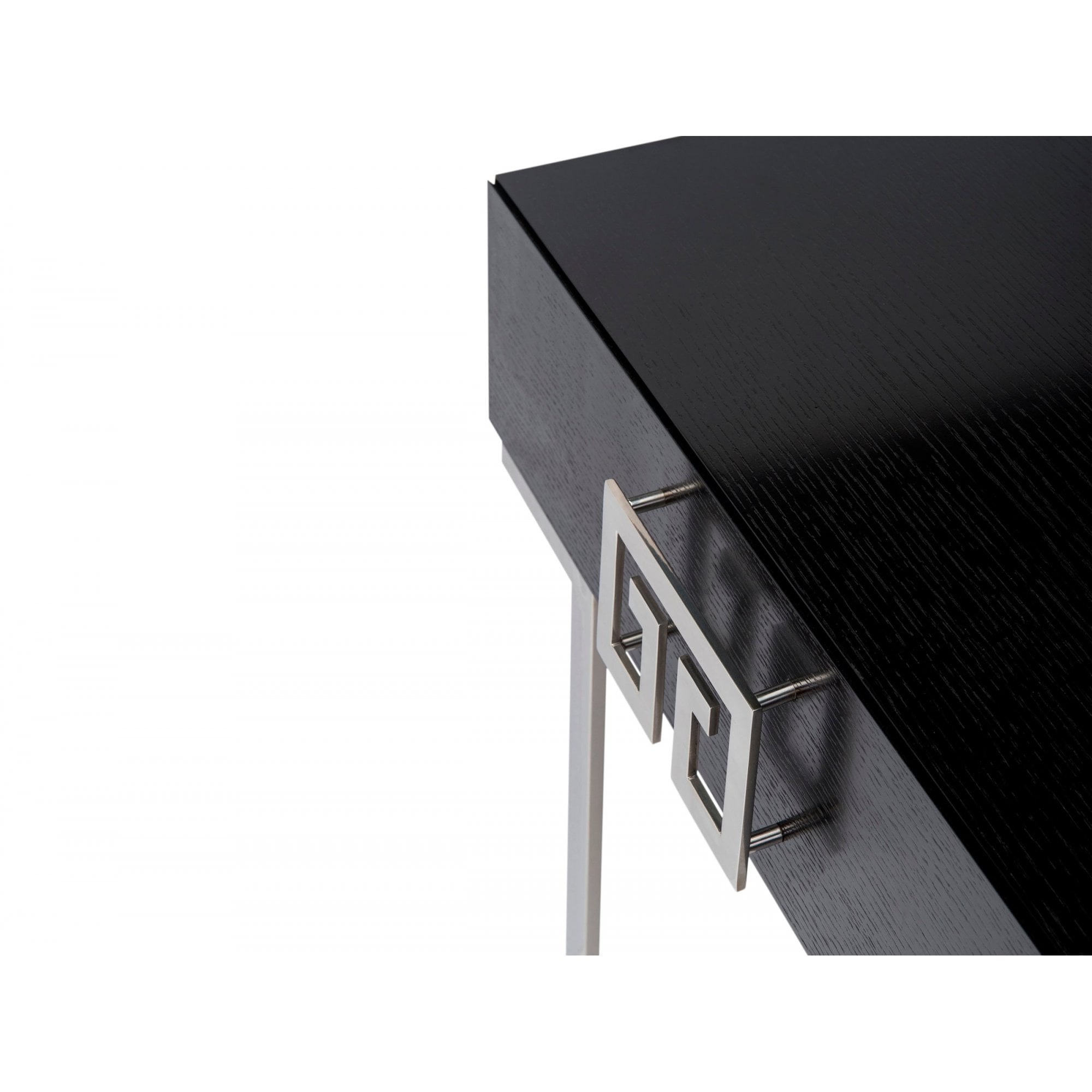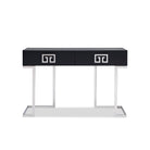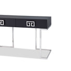A bold statement in modern luxury, this black console table features sleek chrome legs and striking Greek key handles -ideal for sophisticated entryways or living spaces.