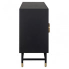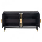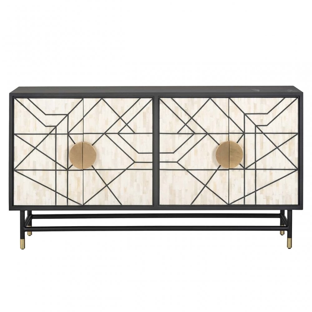 The Novas Sideboard from Richmond Interiors exudes luxurious style, bringing a touch of refined beauty to your space. Crafted from rich black mango wood and supported by sleek iron legs, this elegant piece is a statement of both strength and sophistication. The front is adorned with animal bone inlay, creating a striking geometric pattern that makes it a standout feature in any room. With ample storage behind four doors, it offers both practicality and style. Brass-capped feet and semi-circular handles add an opulent finishing touch. The Novas Sideboard’s lavish design instantly elevates any room, adding a strong sense of presence and grandeur.