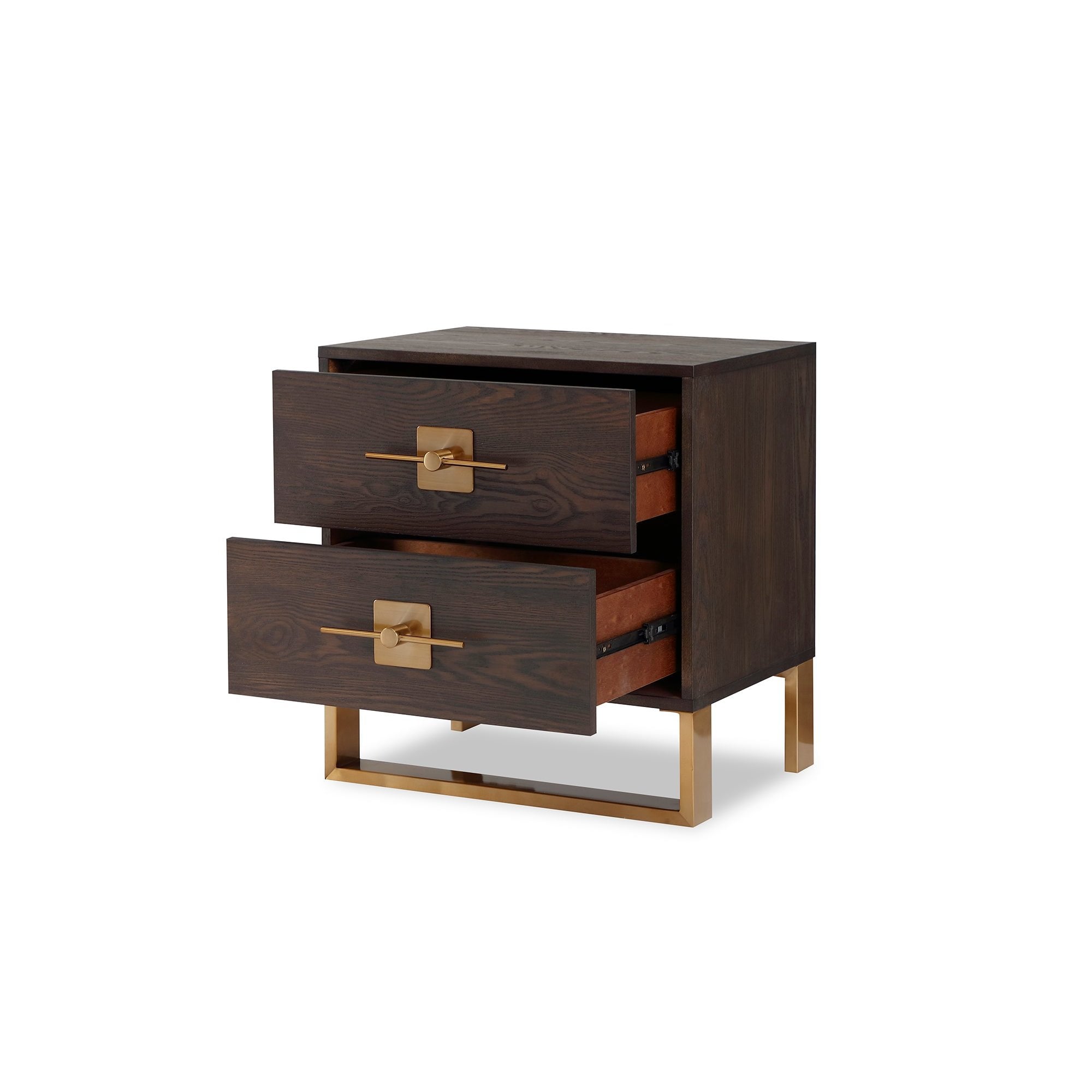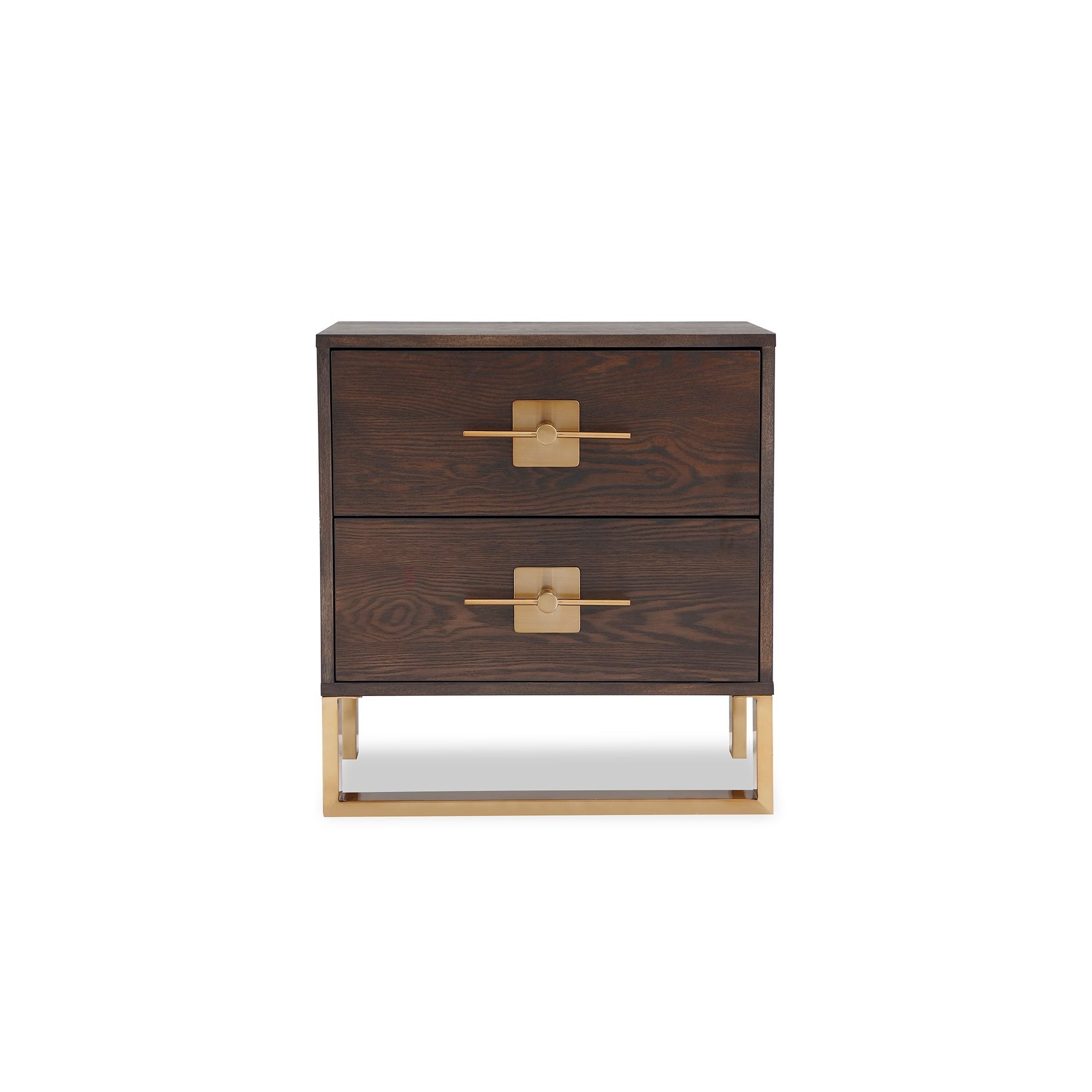 Enhance your space with the Ophir Bedside Table, handcrafted from dark brown ash veneer and accented with brushed brass fittings. Featuring two essential drawers with geometric handles, this piece offers stylish storage while adding sophistication to any bedroom. Ideal for residential and boutique hospitality settings alike.