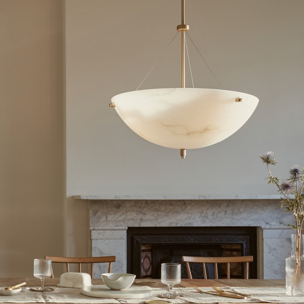 The Oren pendant features a solid alabaster dome, hollowed out and lit from within to cast a warm, diffused light that highlights the natural beauty of the stone. The dome is elegantly suspended from a Satin Brass frame, adding a modern touch to the fixture's timeless appeal. Decorative knurled satin brass screws not only secure the alabaster in place but also elevate the design.