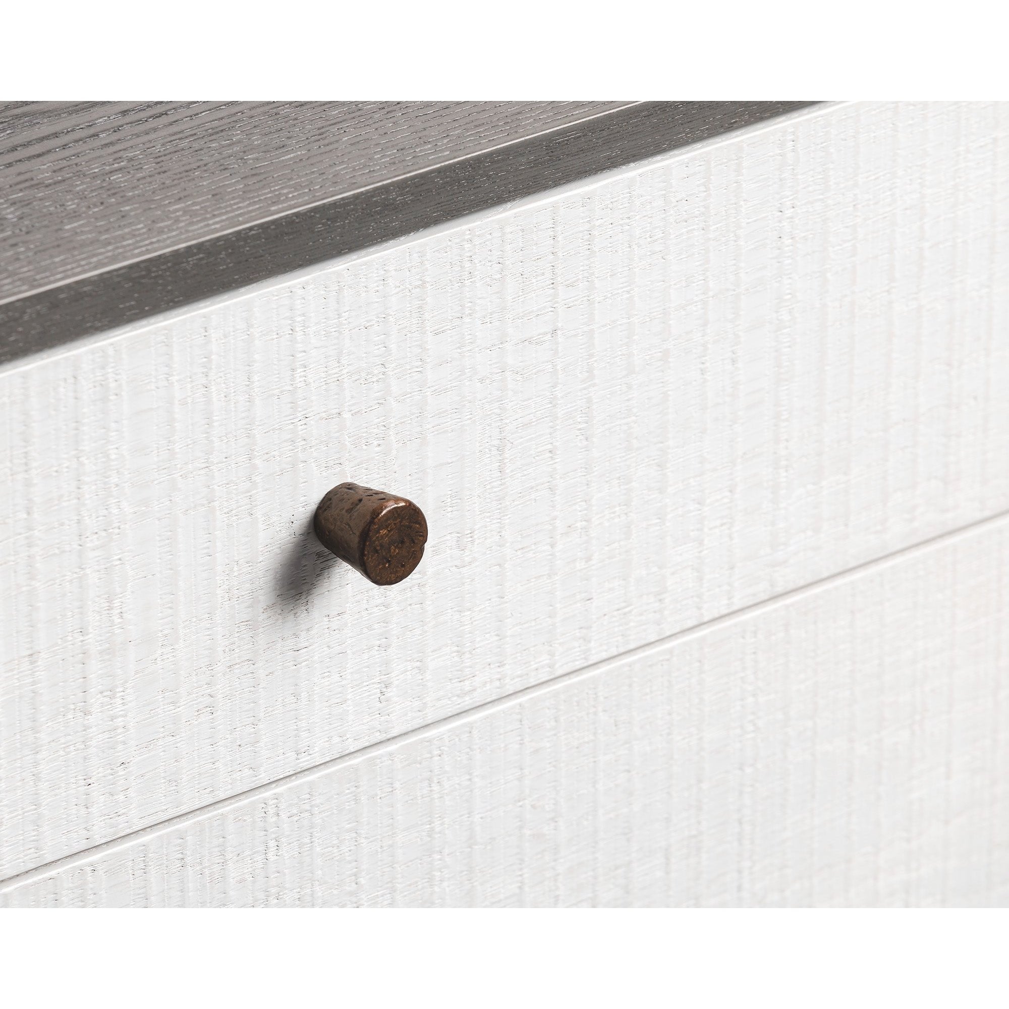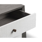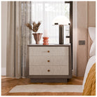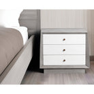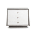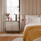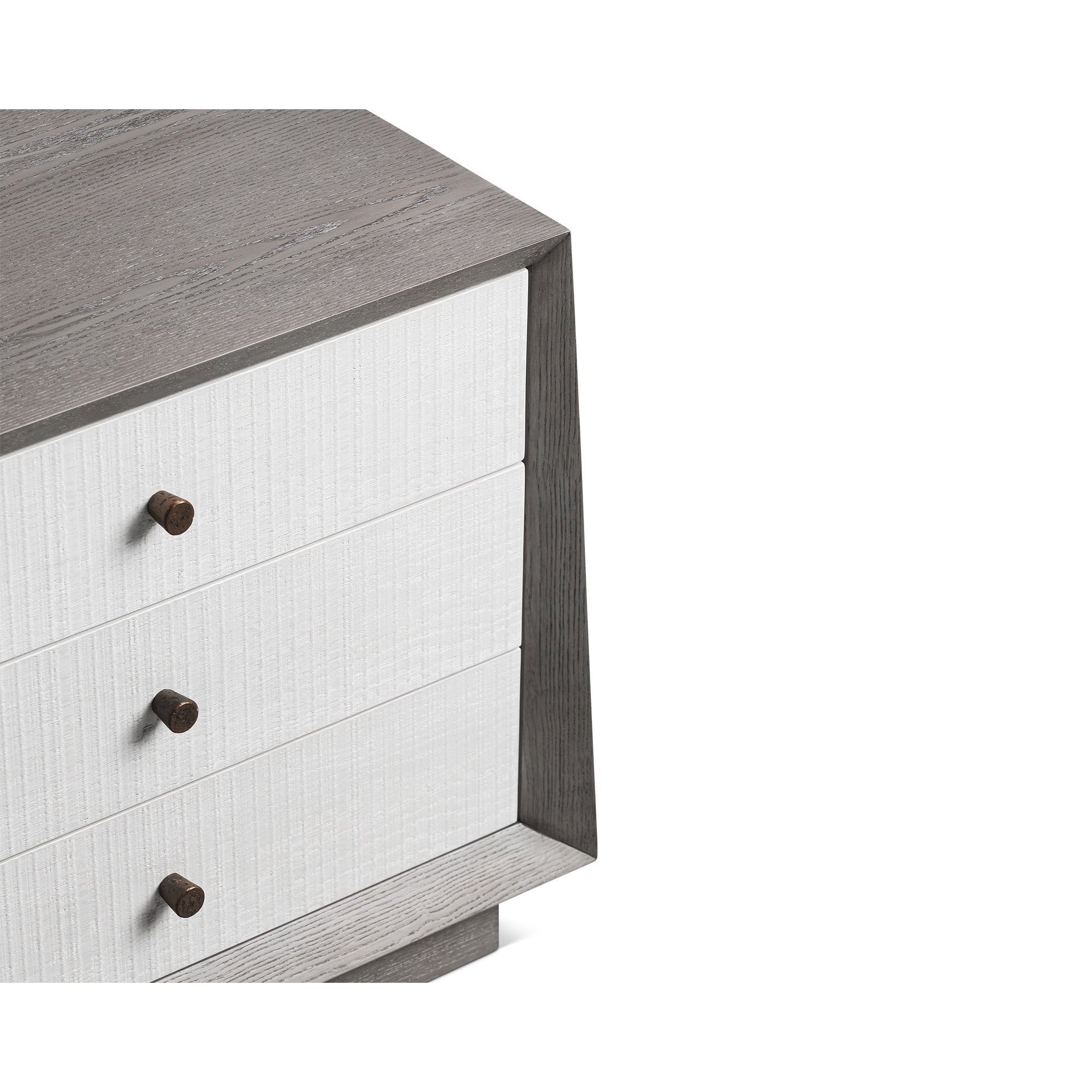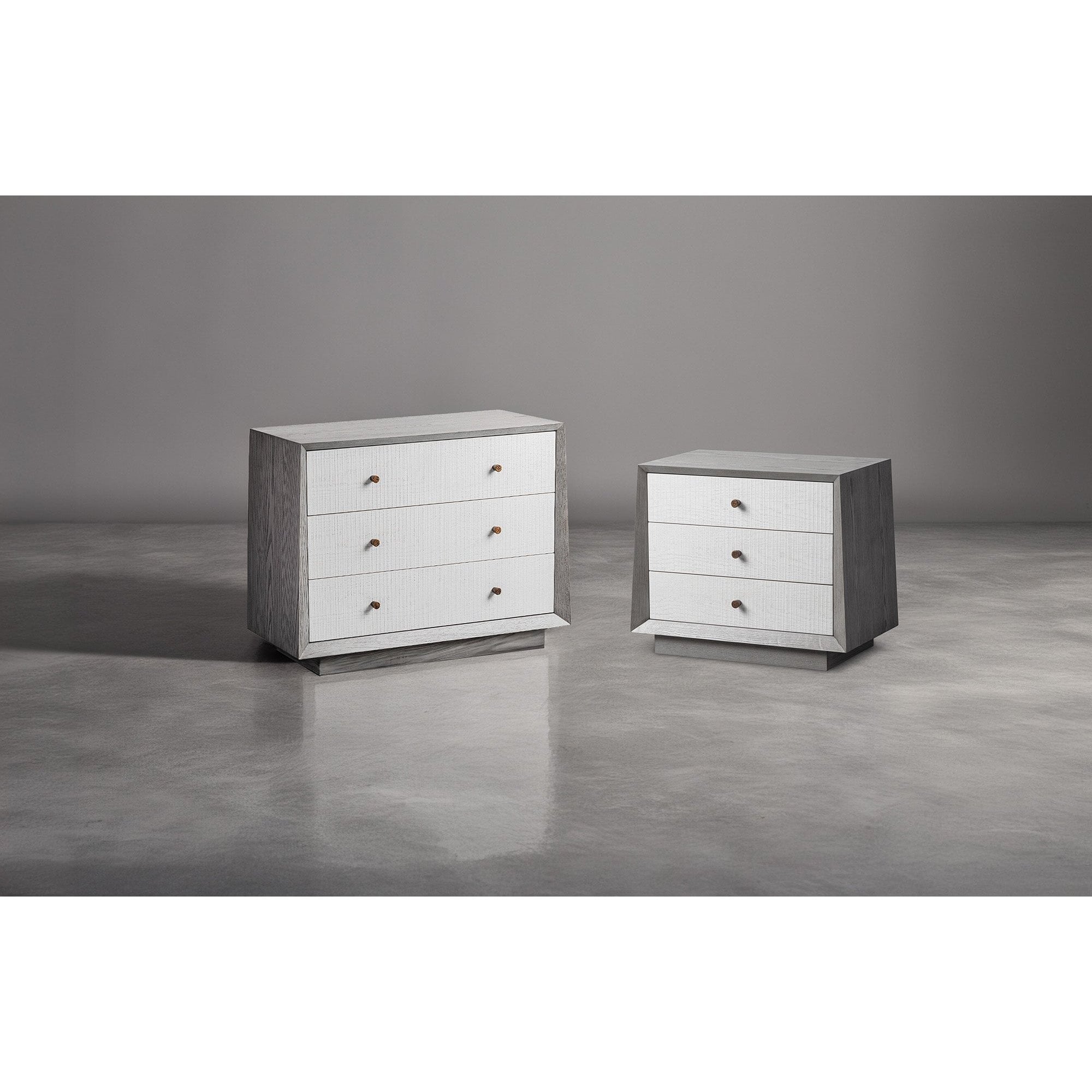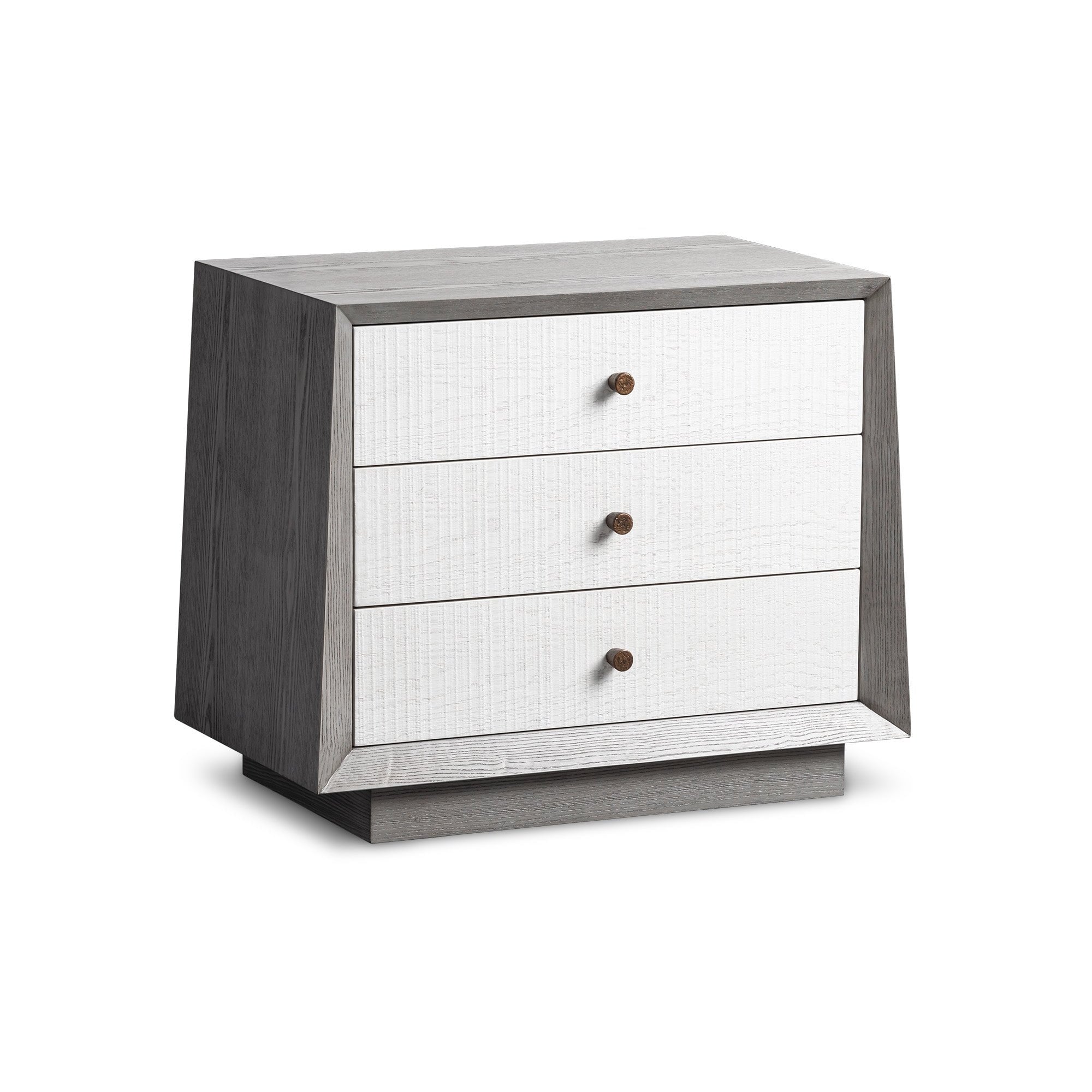 Introducing the Otilia Bedside Table, a stunning combination of style and practicality. Crafted from silver grey ash veneer with a unique tapering base, it features three spacious drawers adorned with a textured white oak front. This table complements various interiors while providing essential storage, making it a must-have for any bedroom setting.
