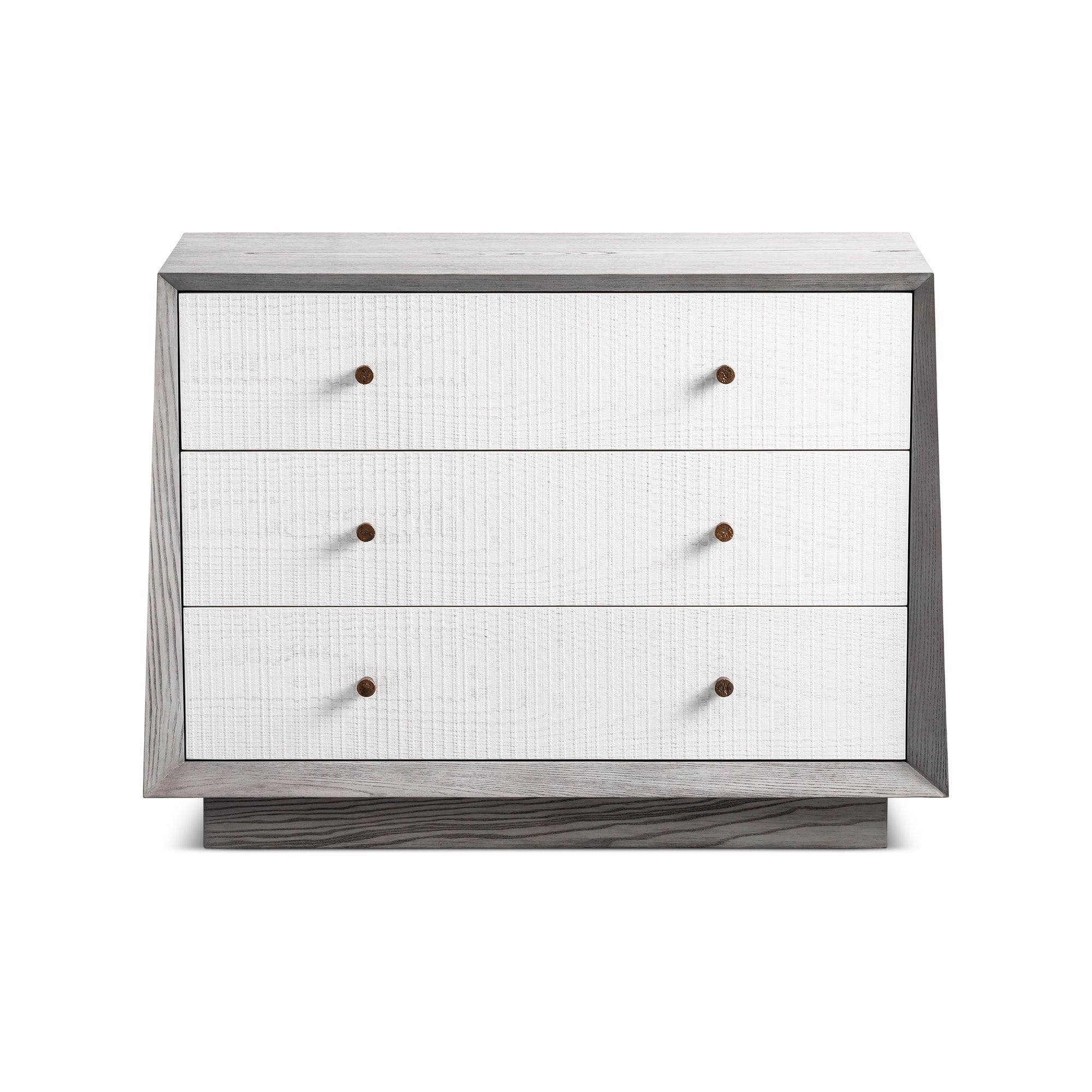 Unveil the Otilia Chest of Drawers, a harmonious fusion of style and utility. Showcasing a silver grey wood hue with a distinctive tapered edge, each of its three spacious drawers features a rough white texture. Crafted from durable ash veneer, it is perfect for both residential and hospitality environments, offering sophistication with ample storage.