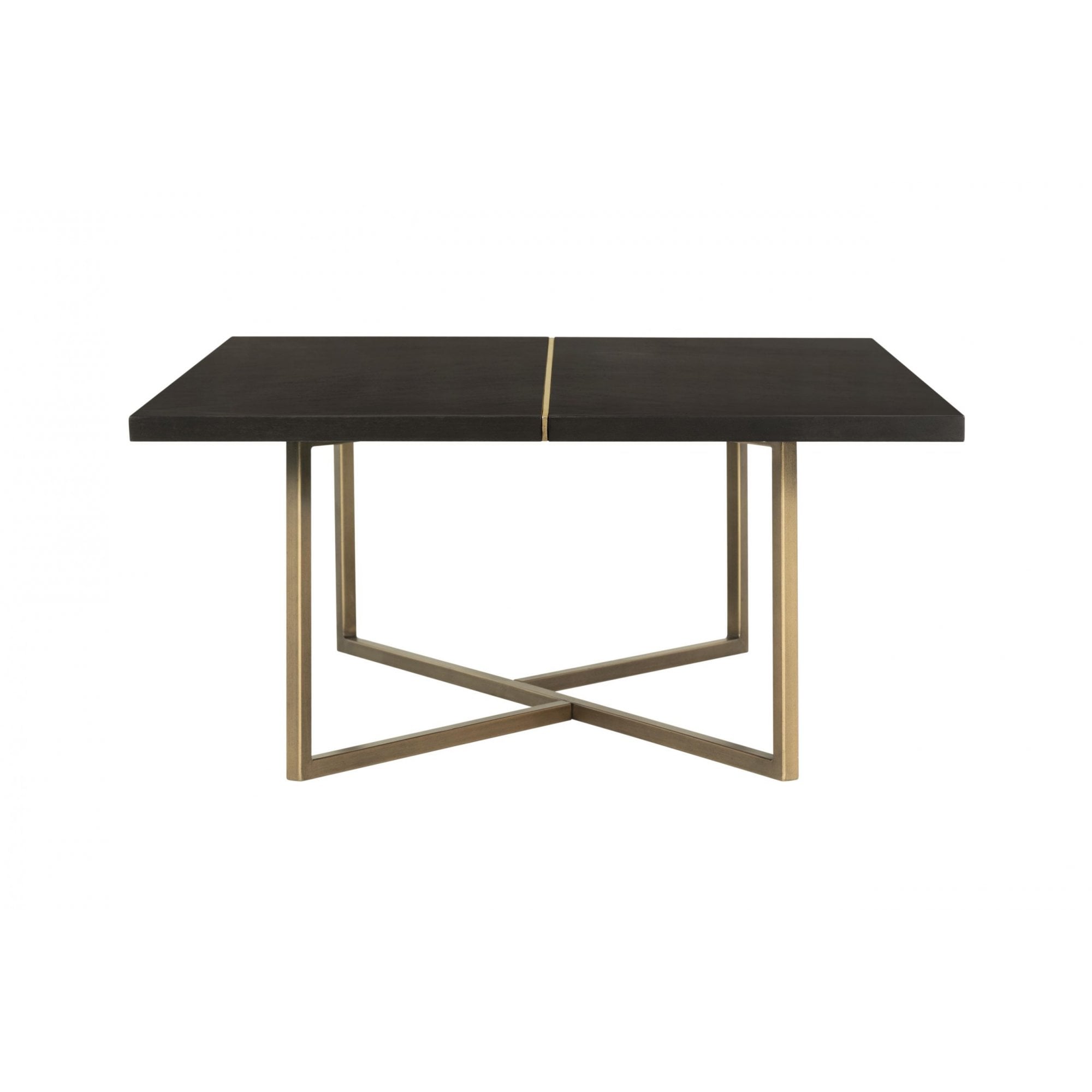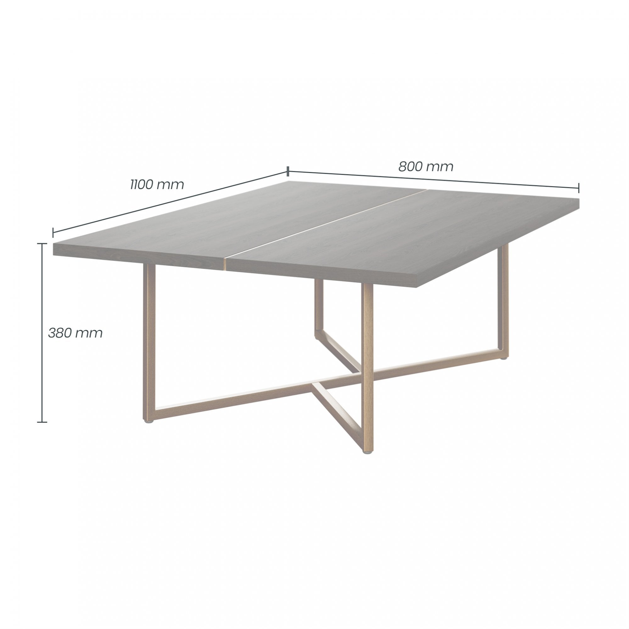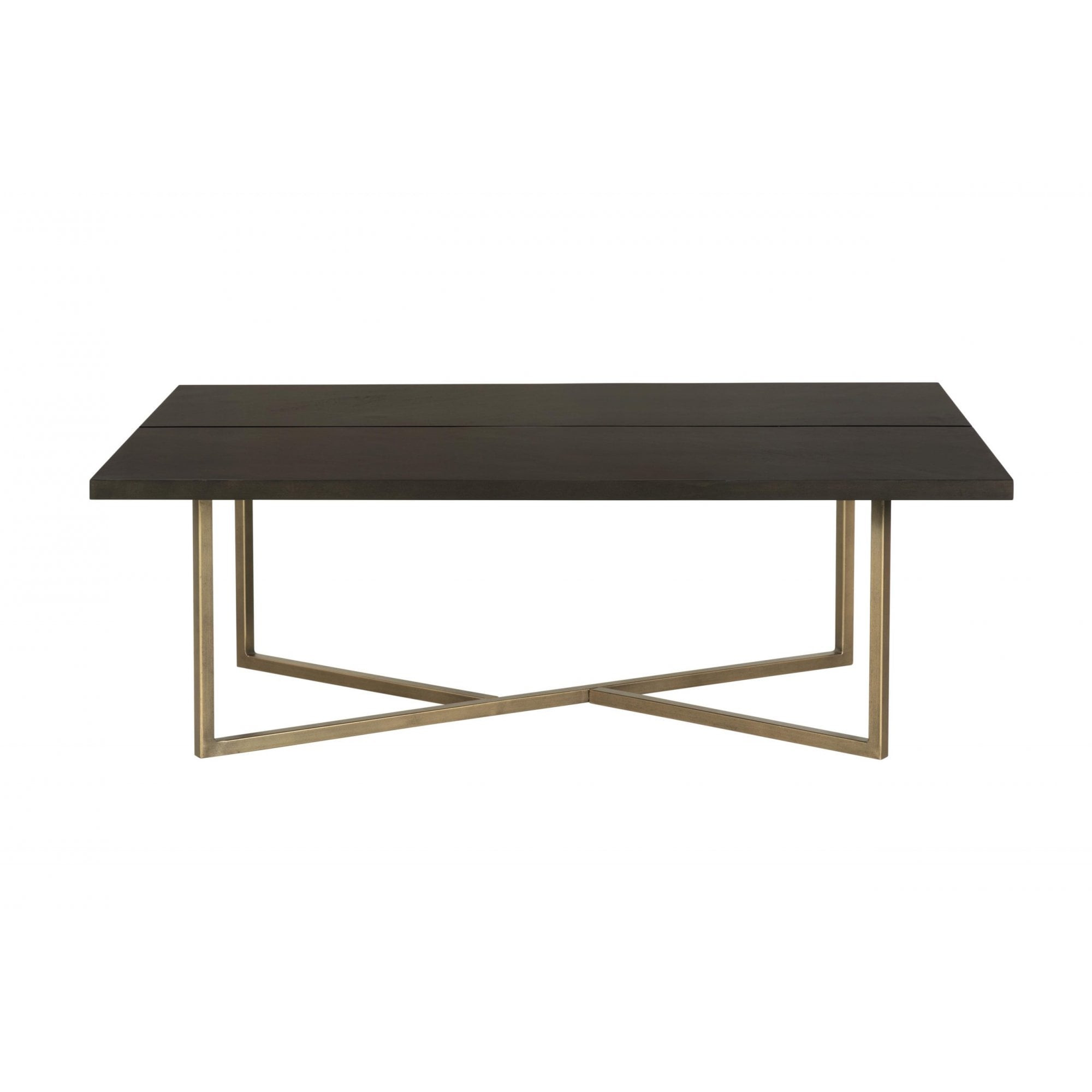 Rectangular chocolate brown coffee table, mdf and veneer, gold seam and gold painted steel base.