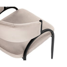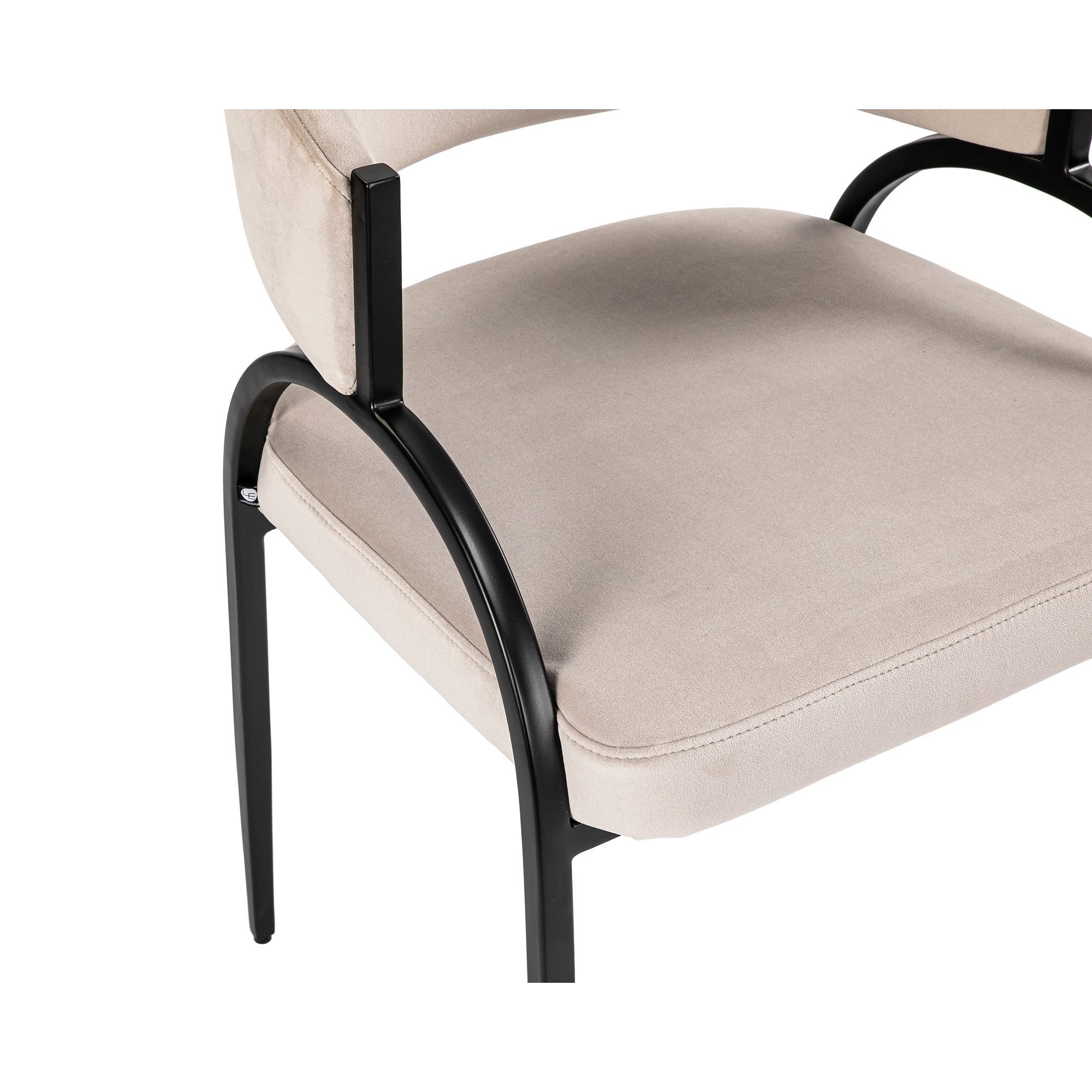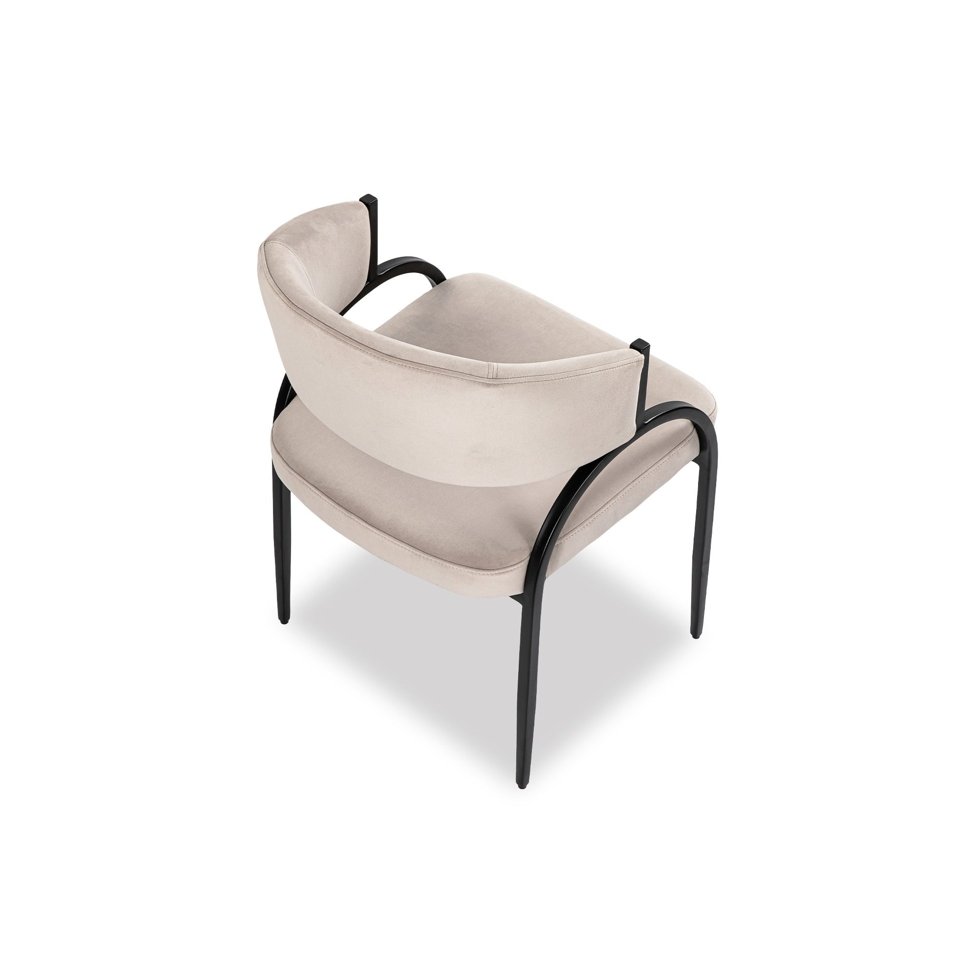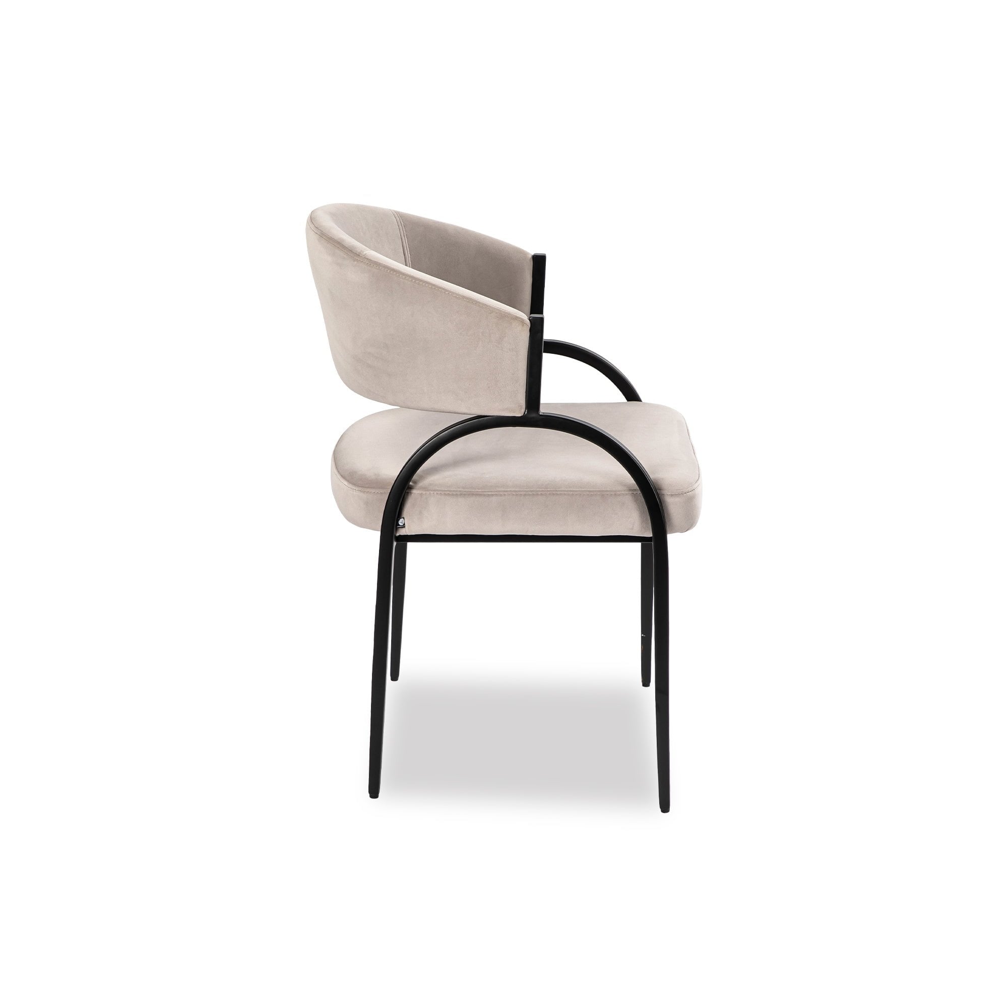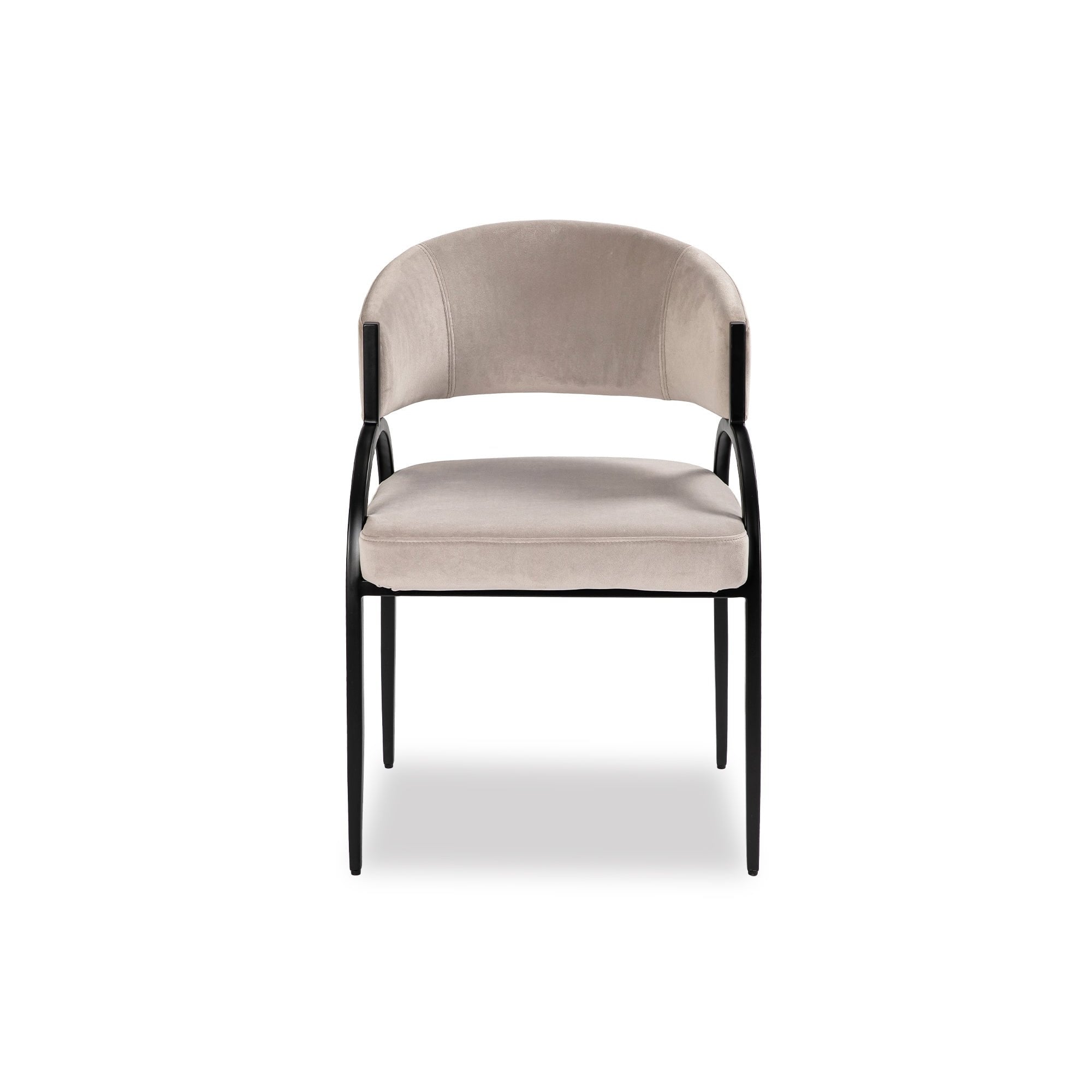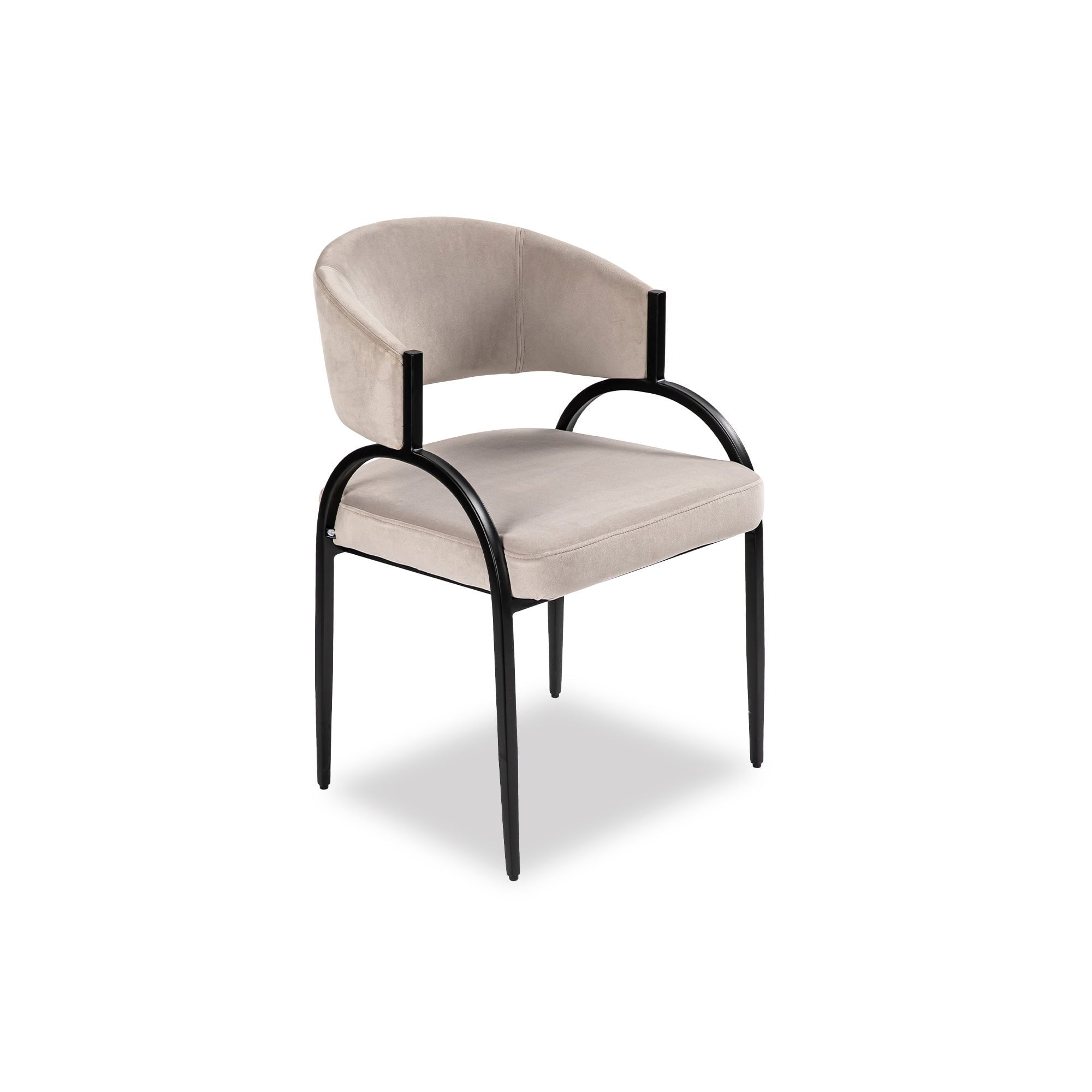 Sleek and sculptural, this modern dining chair features a soft taupe upholstered seat with bold black metal arches—striking the perfect balance between comfort and contemporary design.