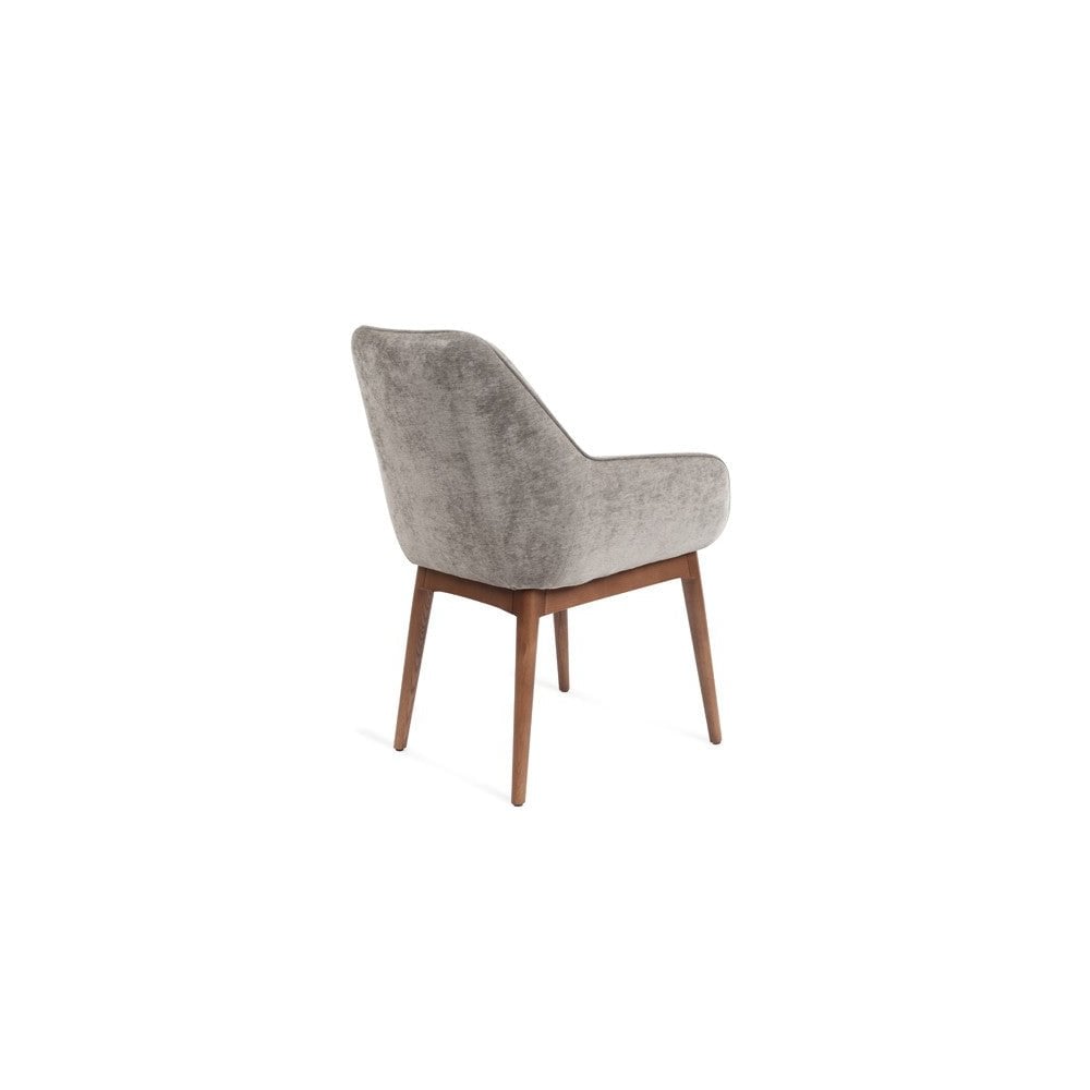 Upholstered in Giselle Seamist fabric, this chair is incredibly comfortable and stylish. Its solid birch frame construction and legs detailed in a smooth walnut finish make it a sturdy and reliable piece of furniture. The curved comfort of its backrest and armrests provide a luxurious experience, while its graceful lines add an elegant touch to any dining room décor.