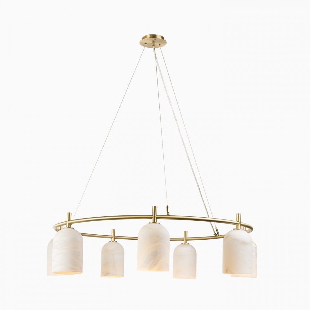 The Rae Chandelier features seven alabaster shades suspended from a Satin Brass frame, creating a warm, welcoming glow that beautifully diffuses light. Perfect for above a dining table or as a statement piece in your living area or bedroom, this elegant pendant effortlessly transforms any space into a relaxing atmosphere as day turns to night.