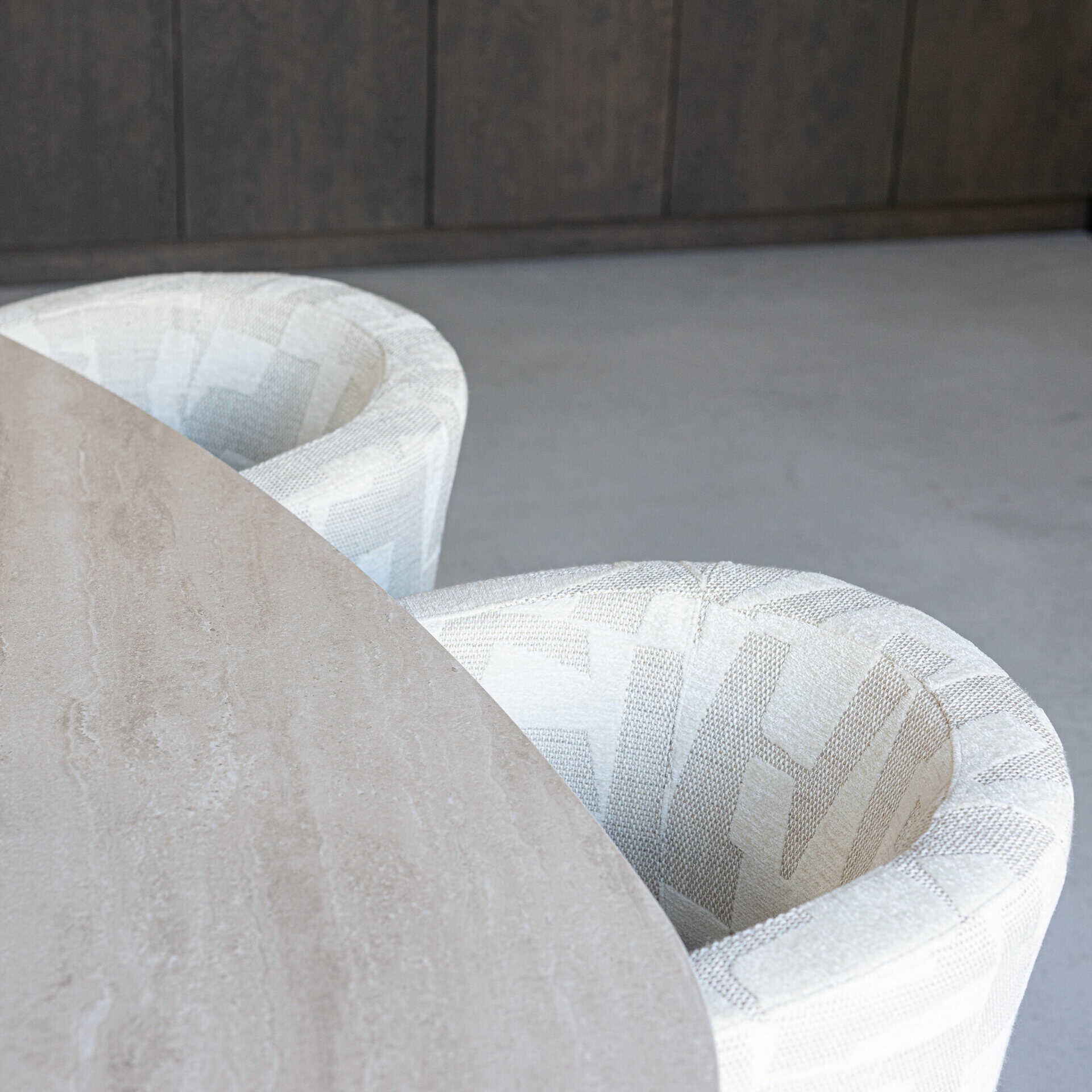 At the heart of the design is a unique pebble-shaped travertine top, which introduces a sense of earthy refinement to any room. The travertine’s smooth, natural texture radiates warmth and authenticity, while its flowing curves soften the overall look, fostering a welcoming and intimate atmosphere. This one-of-a-kind design feature elevates the table from a functional dining piece to a true work of art.