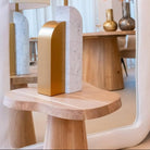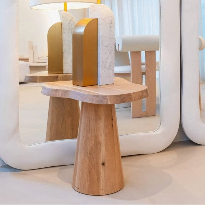 The Riva is crafted from solid oak imported from the United States and handmade in India. The organic shapes and column bases are entirely hand-sawn and glued, clearly showcasing the craftsmanship. This Indian craftsmanship gives the collection a unique and authentic look.