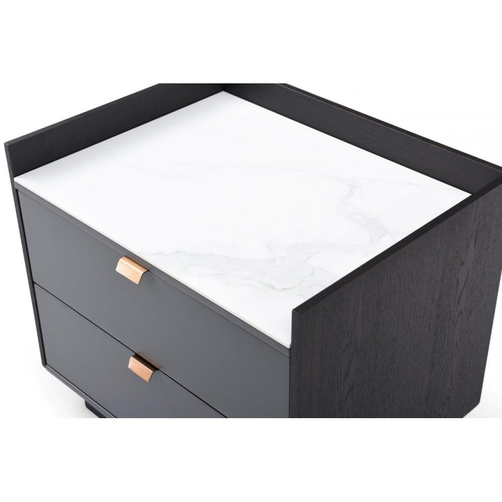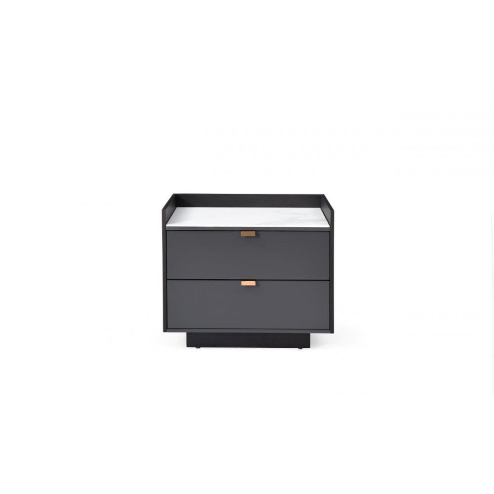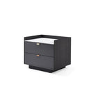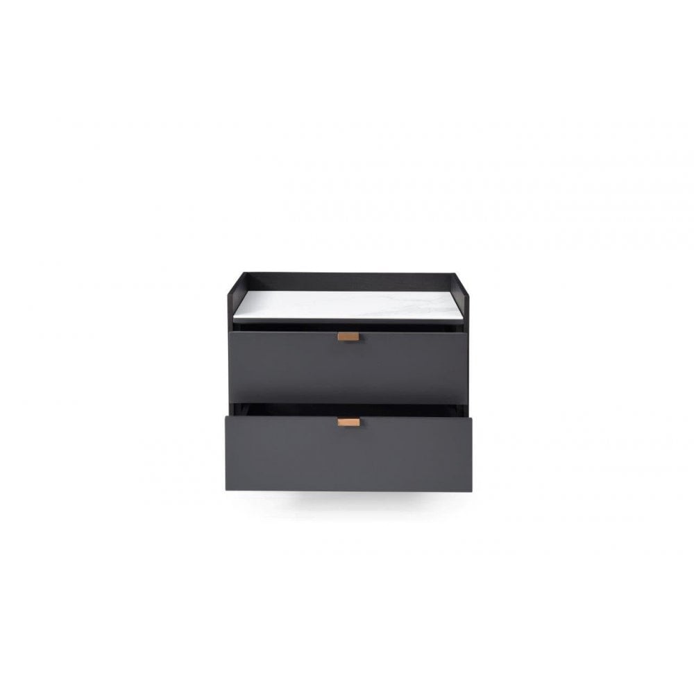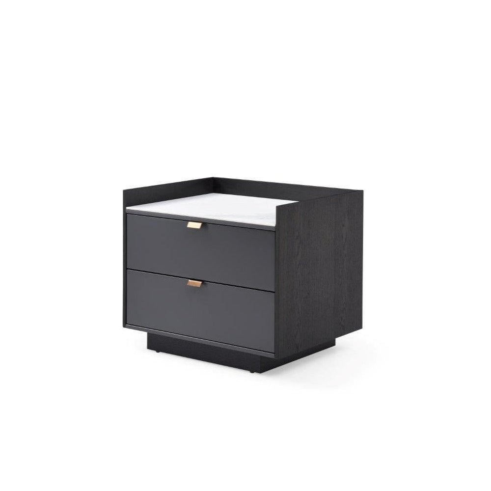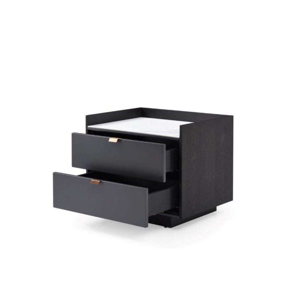 Enhance the elegance of your bedroom with the exquisite Saviour Bedside Table. This stunning piece showcases a unique design that effortlessly combines sophistication and functionality. The white matte marble ceramic top adds a touch of luxury, while the dark grey washed oak timber veneer outer and anthracite fronts exude a sense of timeless beauty.