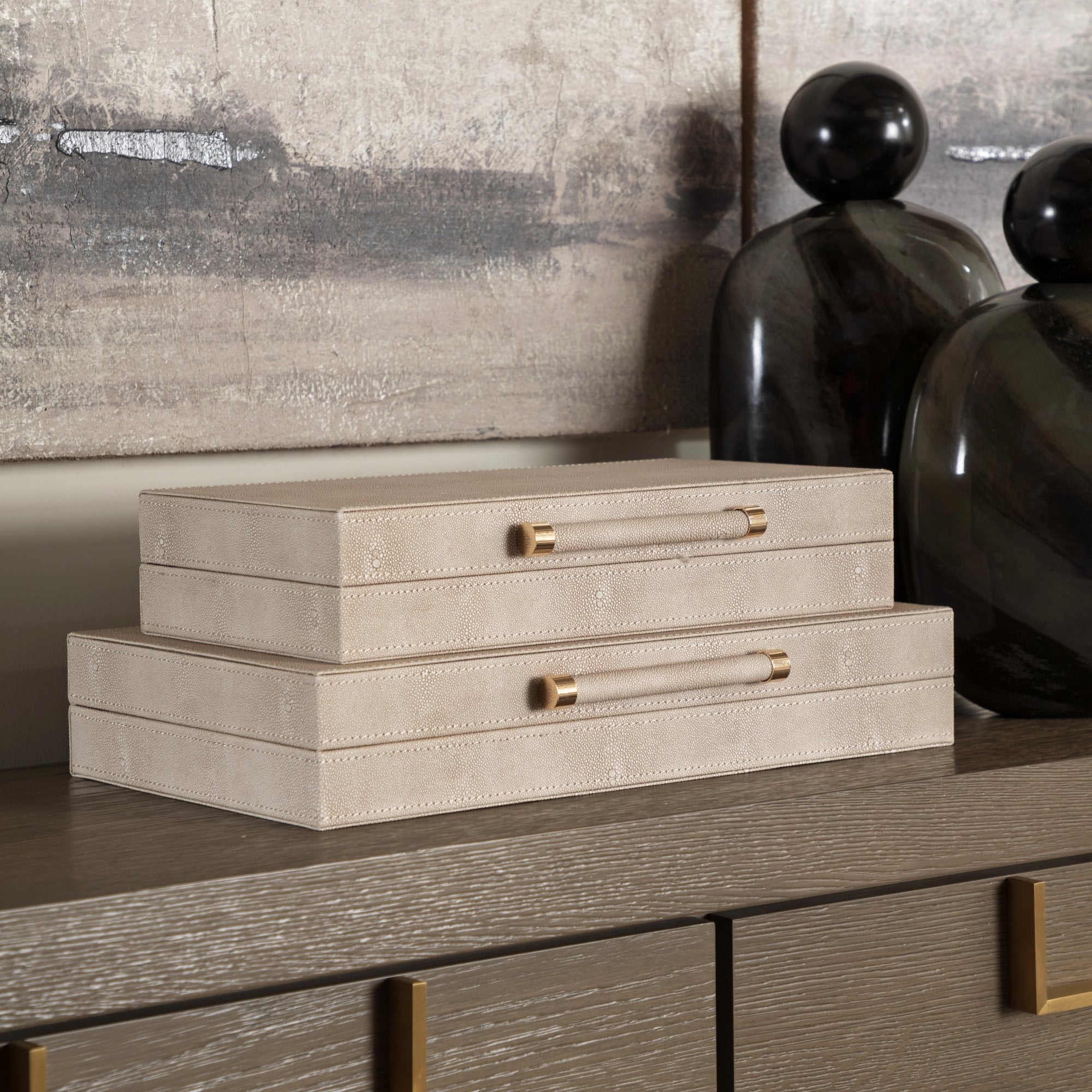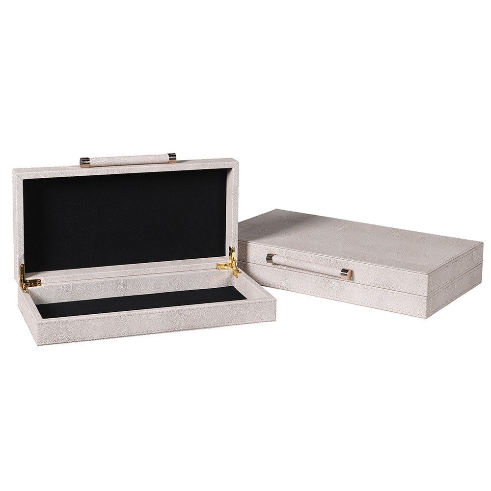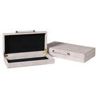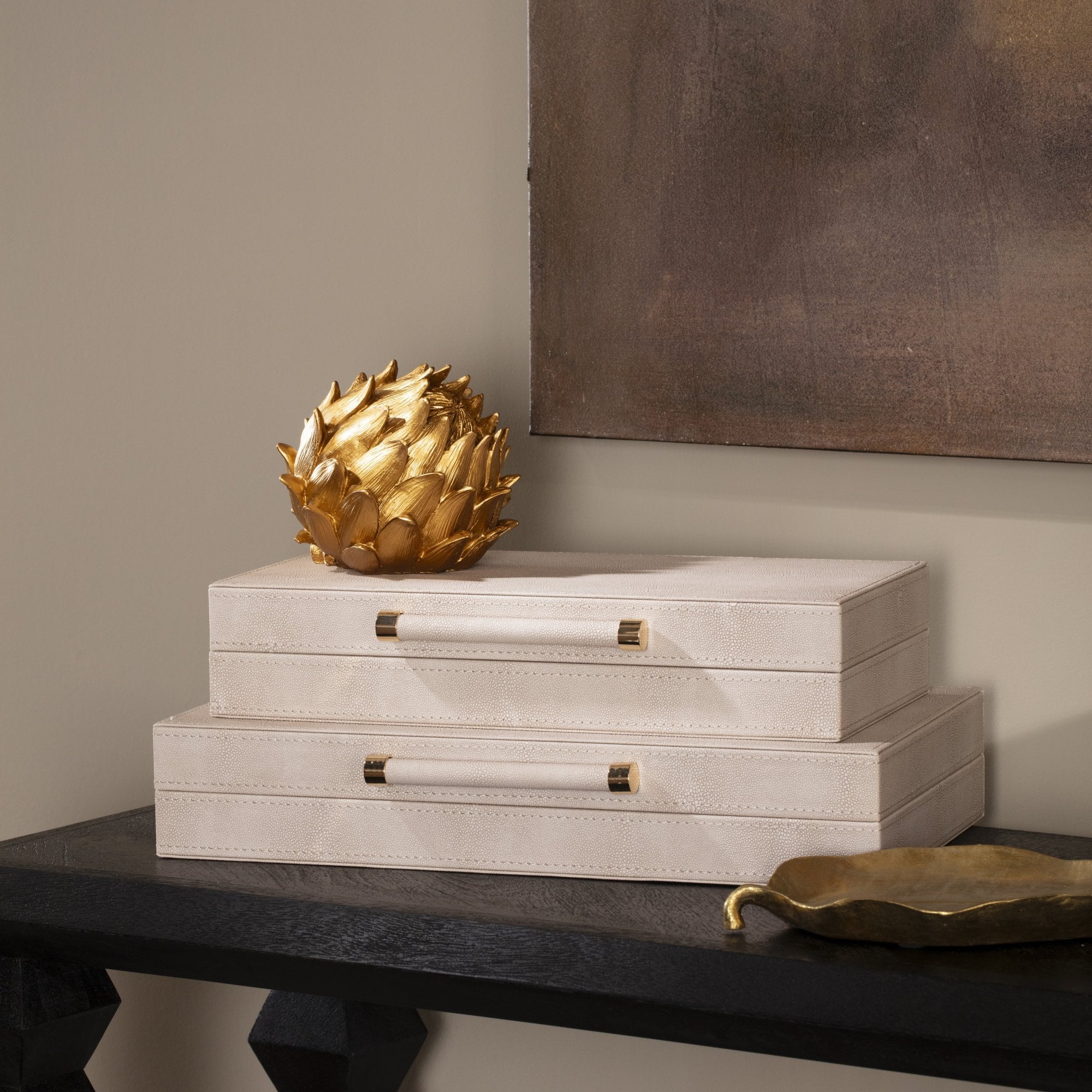 This Set of 2 Ivory Faux Shagreen Boxes exudes timeless elegance and sophistication, these boxes feature a luxurious ivory shagreen exterior, known for its exquisite texture and durability.