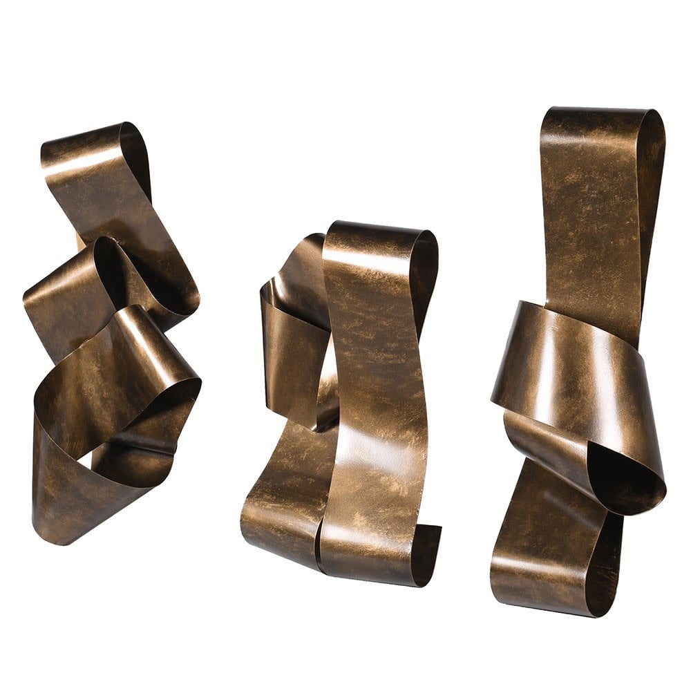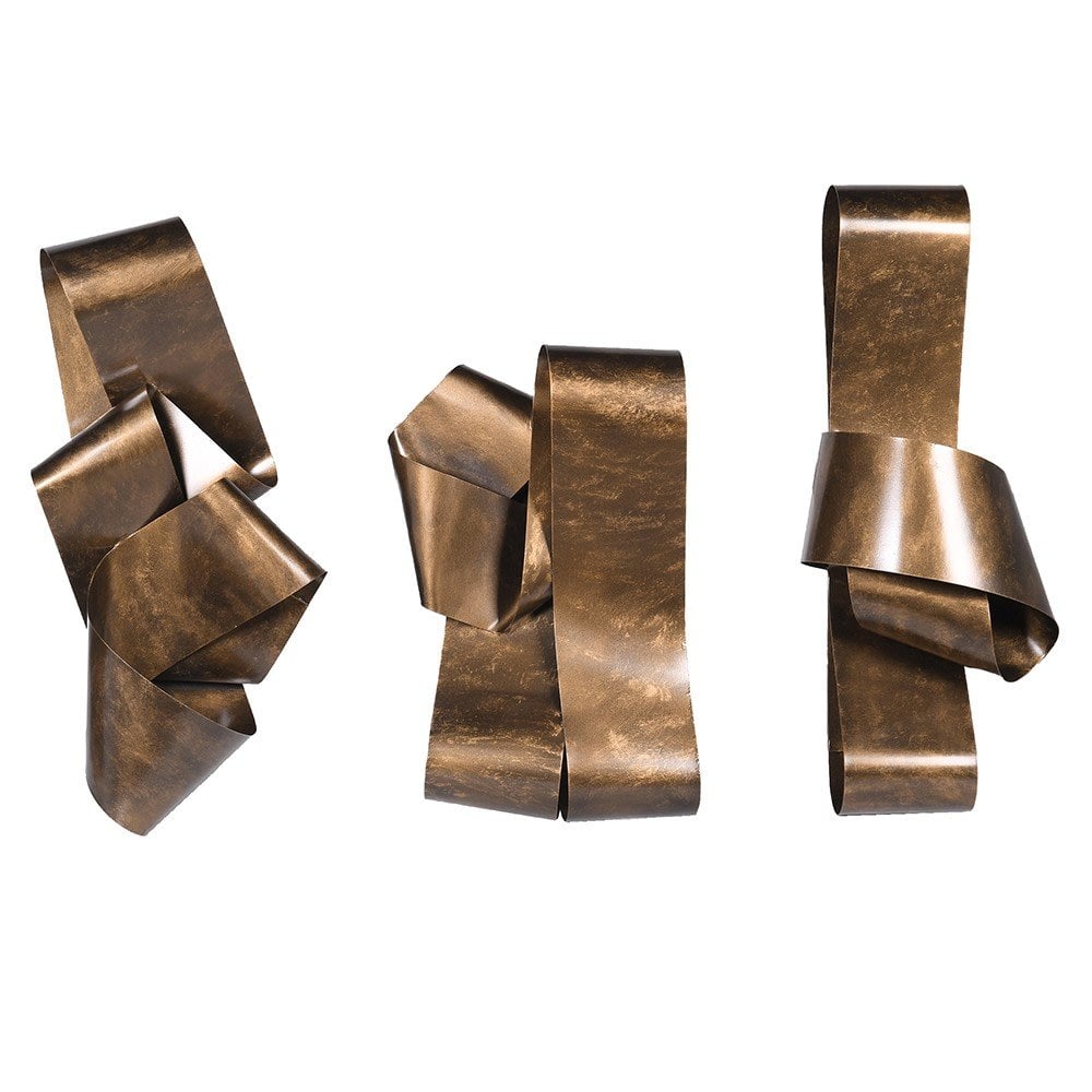 A set of three antique brass wall knots would exude a timeless and contemporary charm, perfect for adding a touch of abstract flair to any space. Each knot, crafted in a metal for durability, features a rich bronze, aged patina that highlights its history and craftsmanship.