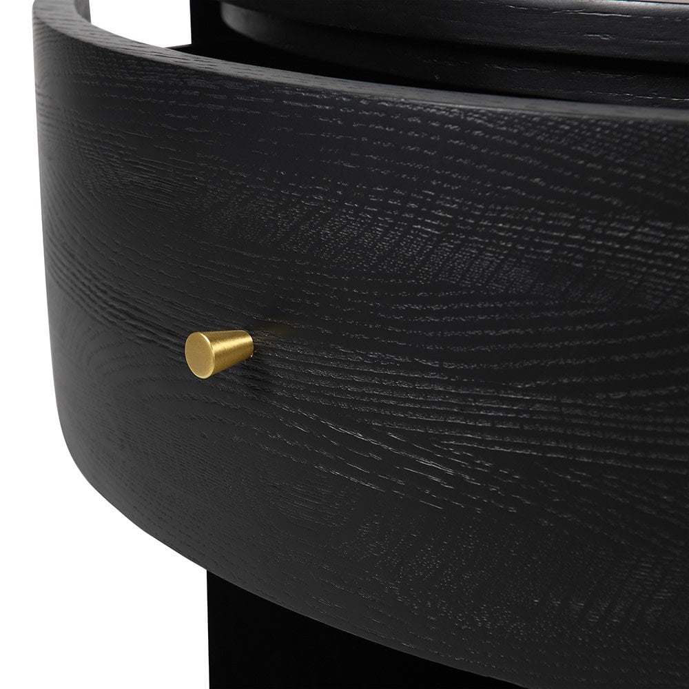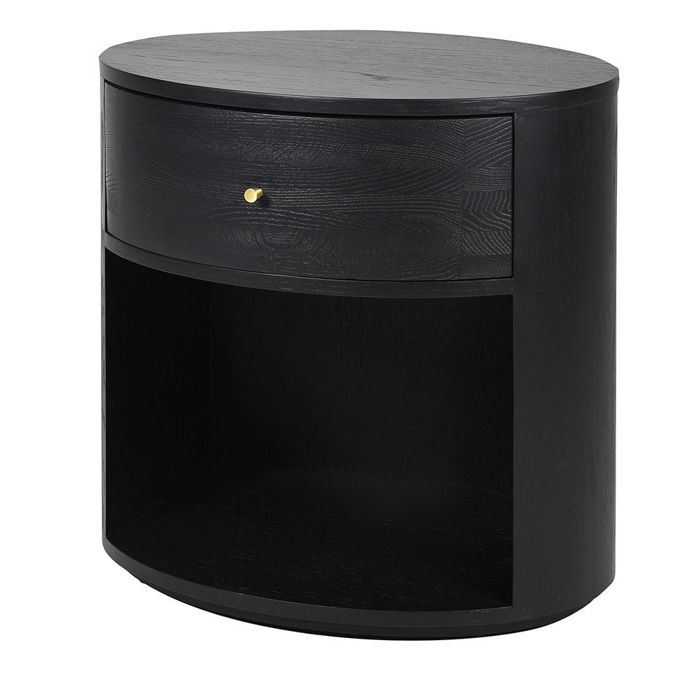 Elevate your bedroom décor with our sleek Black Oval Bedside with Brass Handle, a contemporary and functional addition to your home. Crafted from oak with a sleek black finish and featuring brass handles, this bedside table offers a spacious drawer and shelf for styling. Ideal for your bedroom, guest room, or even the living room, it adds both style and practicality to your living space.