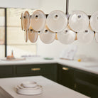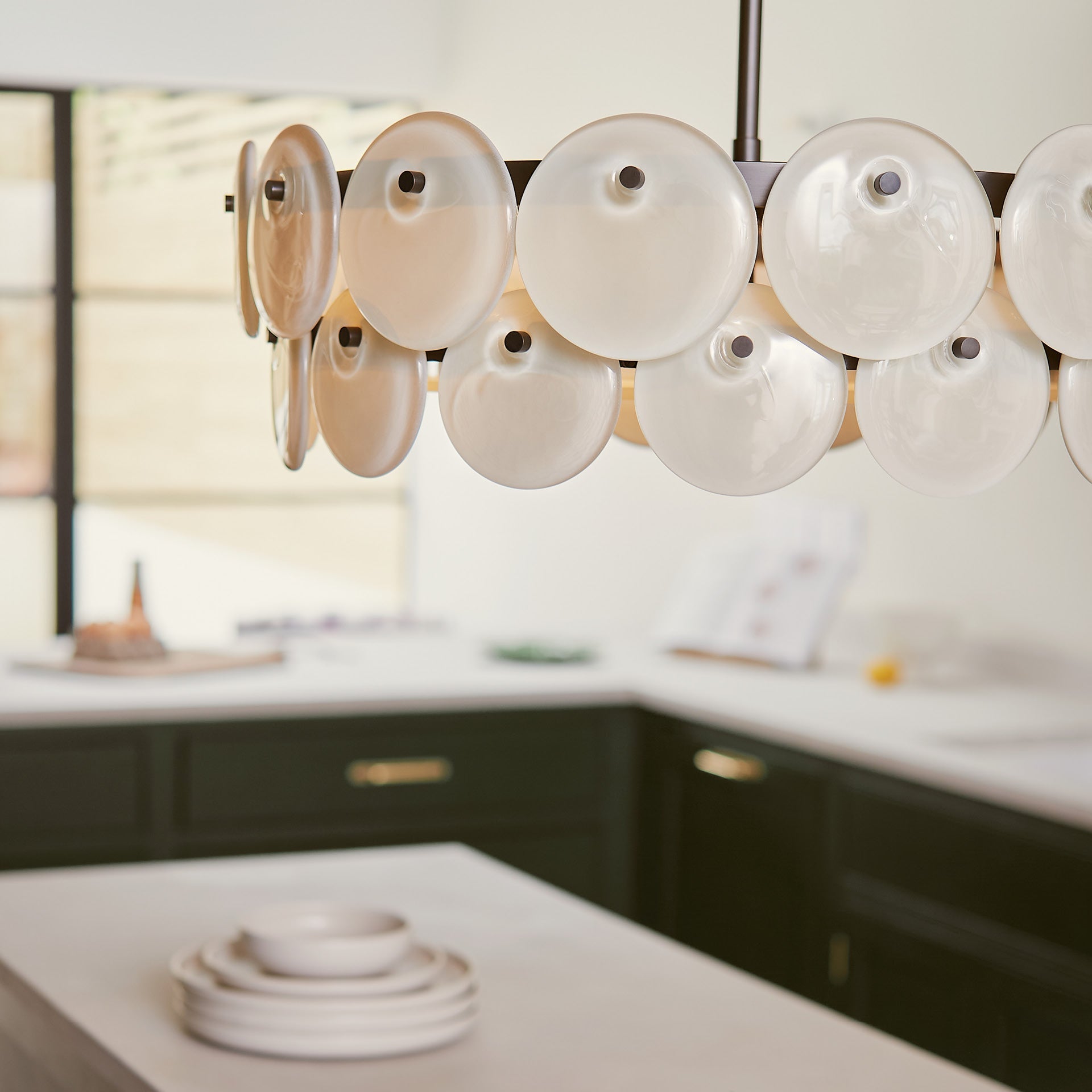 The Sierra Large Double Chandelier features sleek Blackened Bronze metalwork paired with hand poured glass discs in a two-tier design, adding a modern touch to any dining or sitting room. The Chalk and Olive glass finish provides a soft light, adding ambience to any interior.