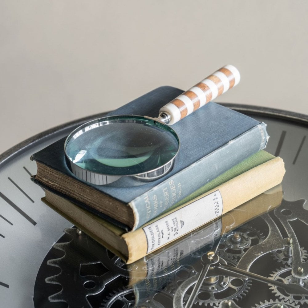 Introducing our Resin and Brass Striped Magnifying Glass, a delightful fusion of materials and design that adds character to any space. The handle is crafted from wood effect resin and brass to create a charming stripe design. Measuring W22.5 x D10 x H2cm, it’s compact yet practical and perfect for adding a touch of vintage-inspired charm to a desk or table.
