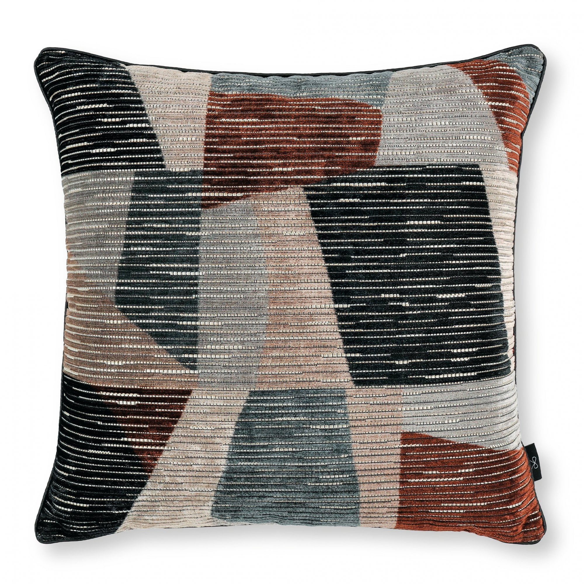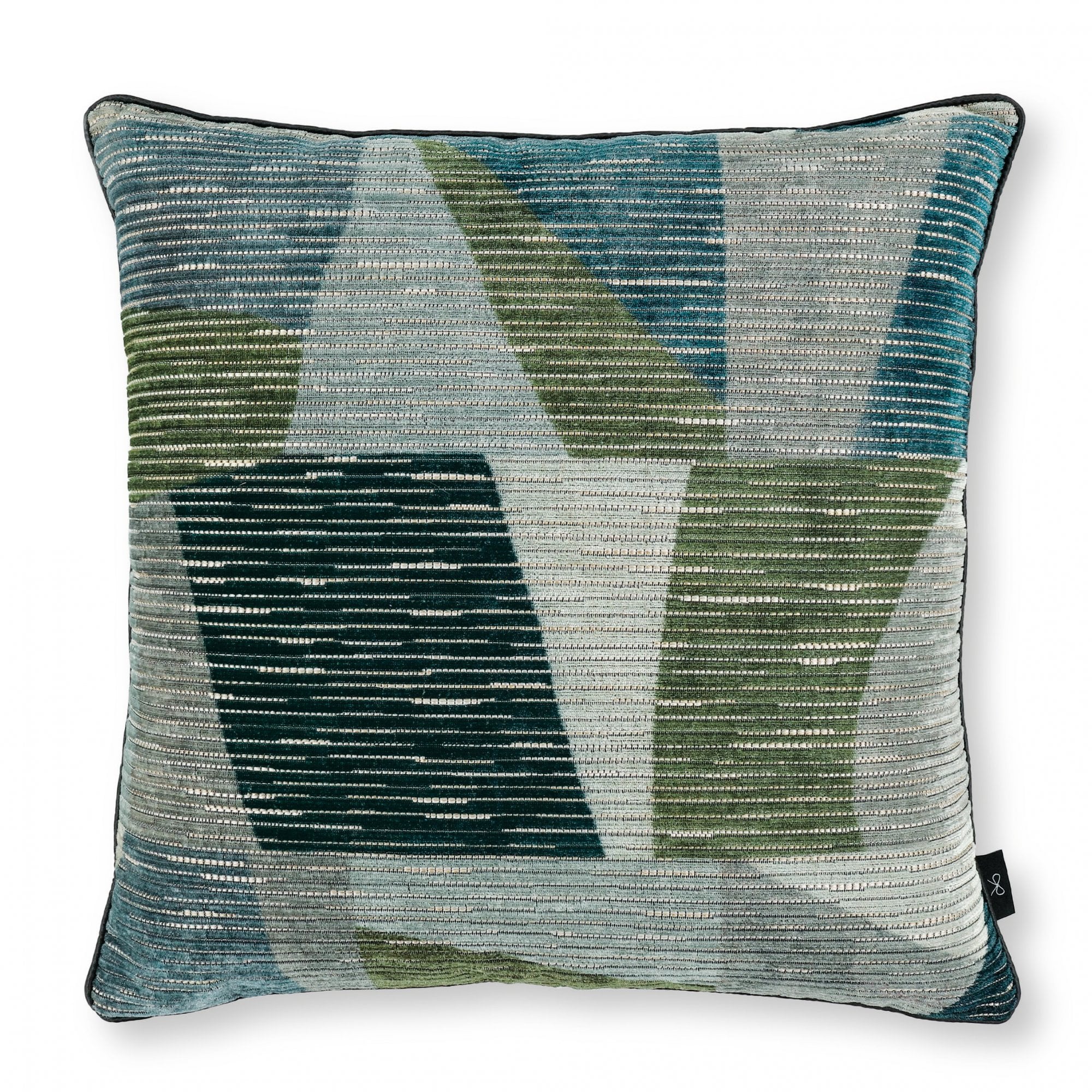 Beautifully bold, this statement cushion features a contemporary geometric of overlapping painterly shapes, printed on an elegant jacquard-woven velvet with glimpses of shimmering metallic.