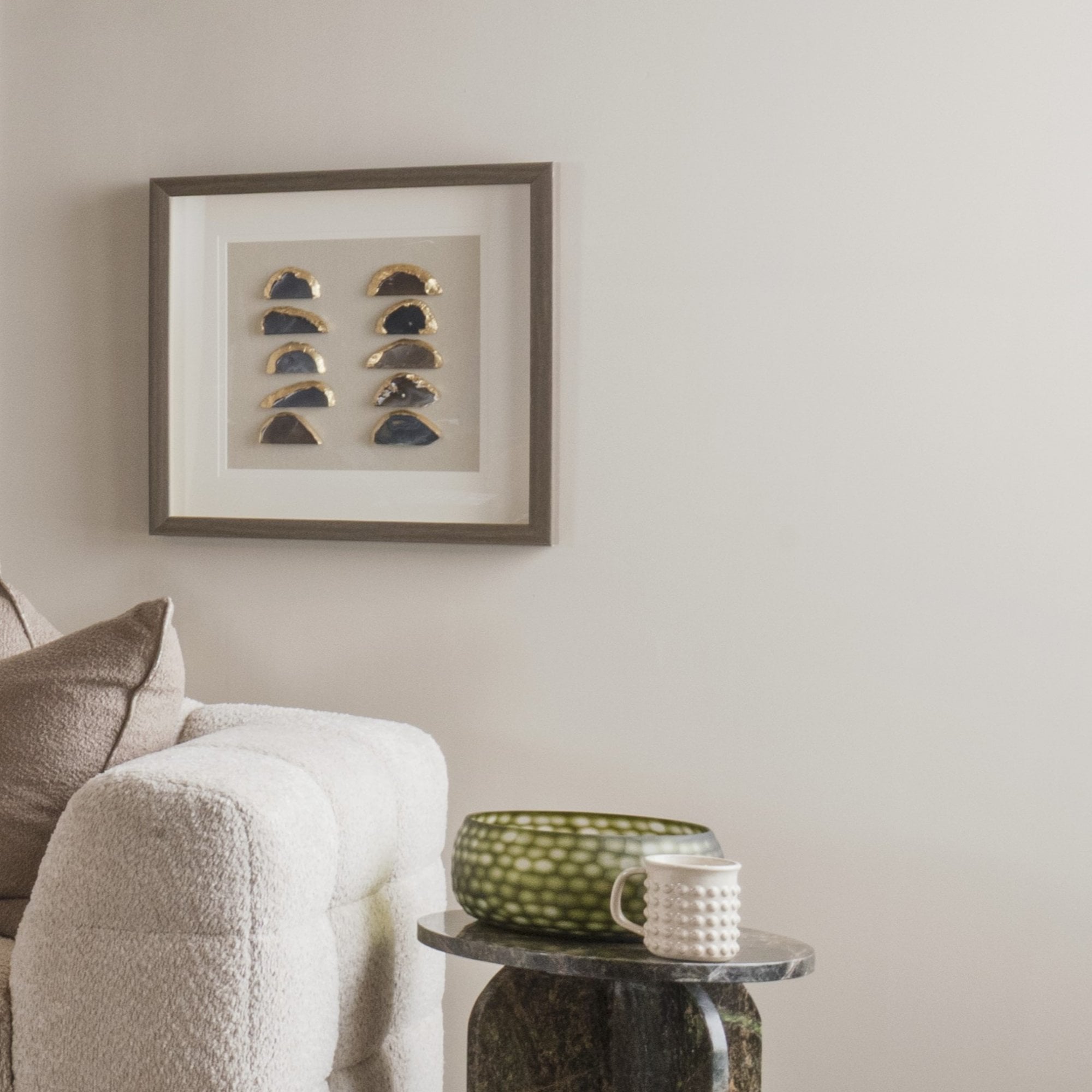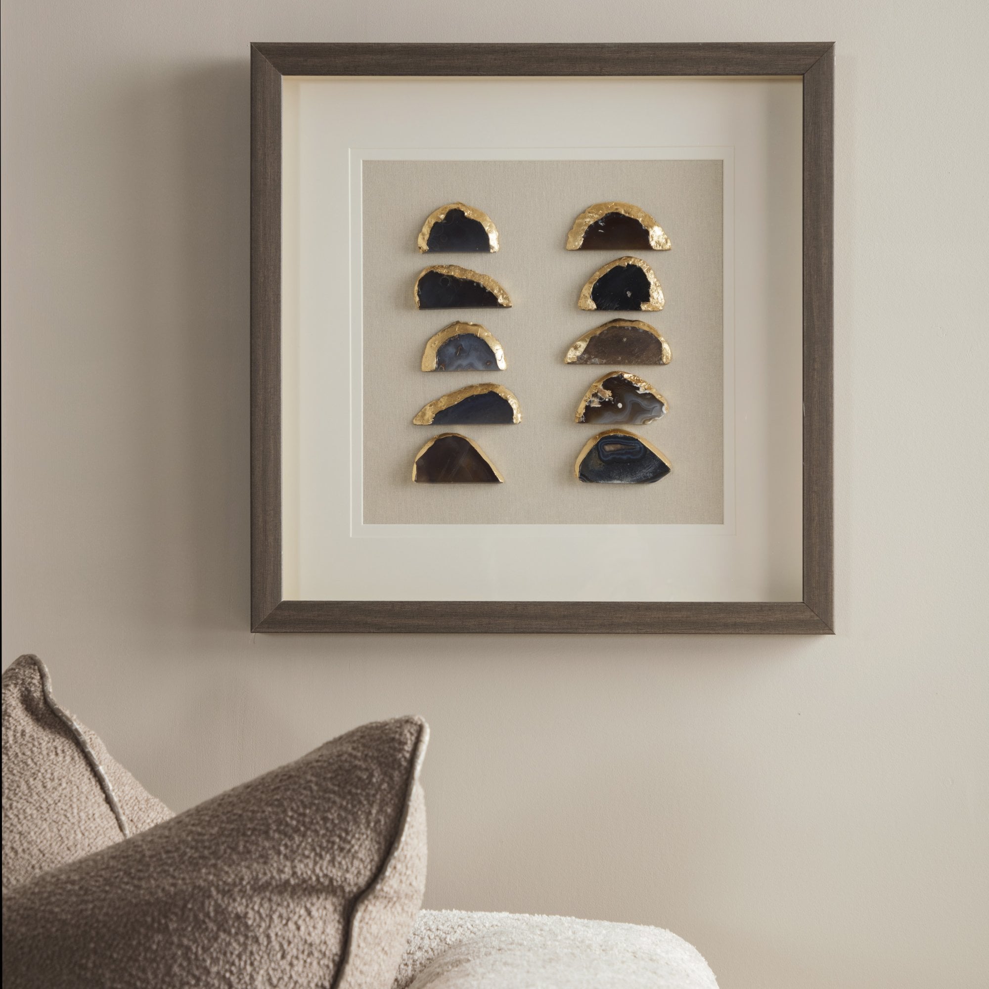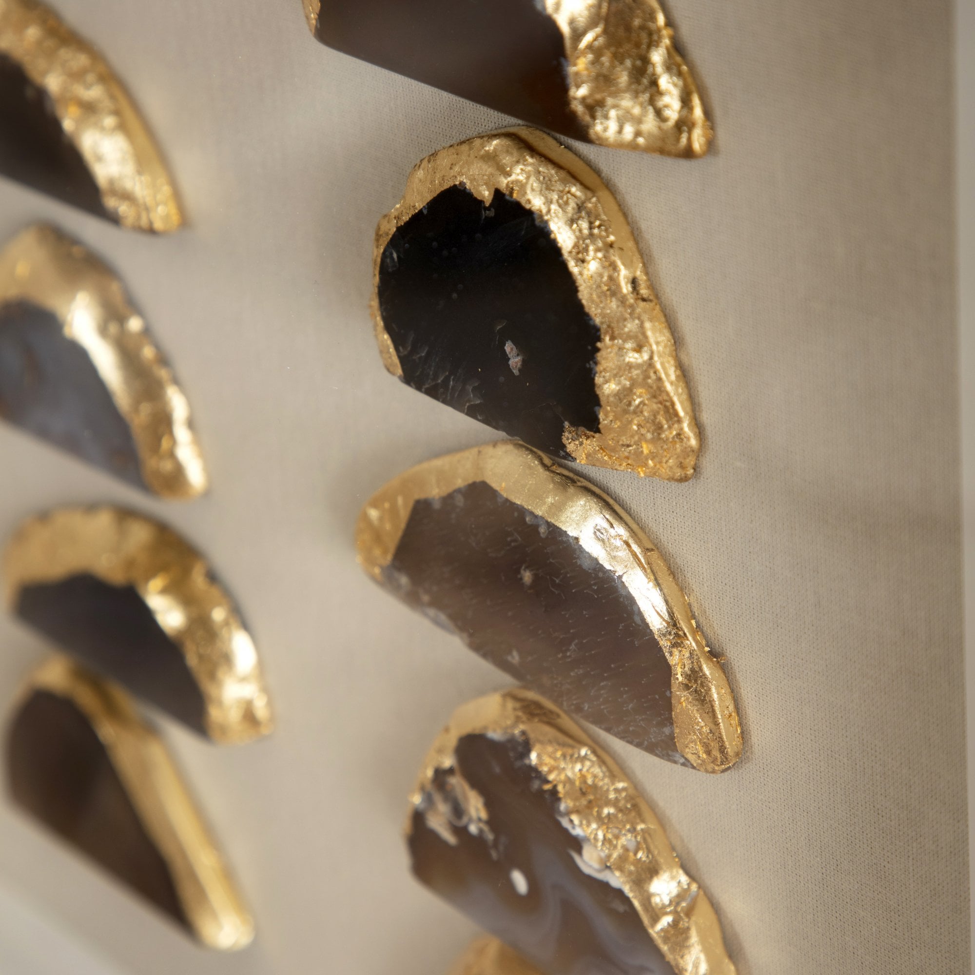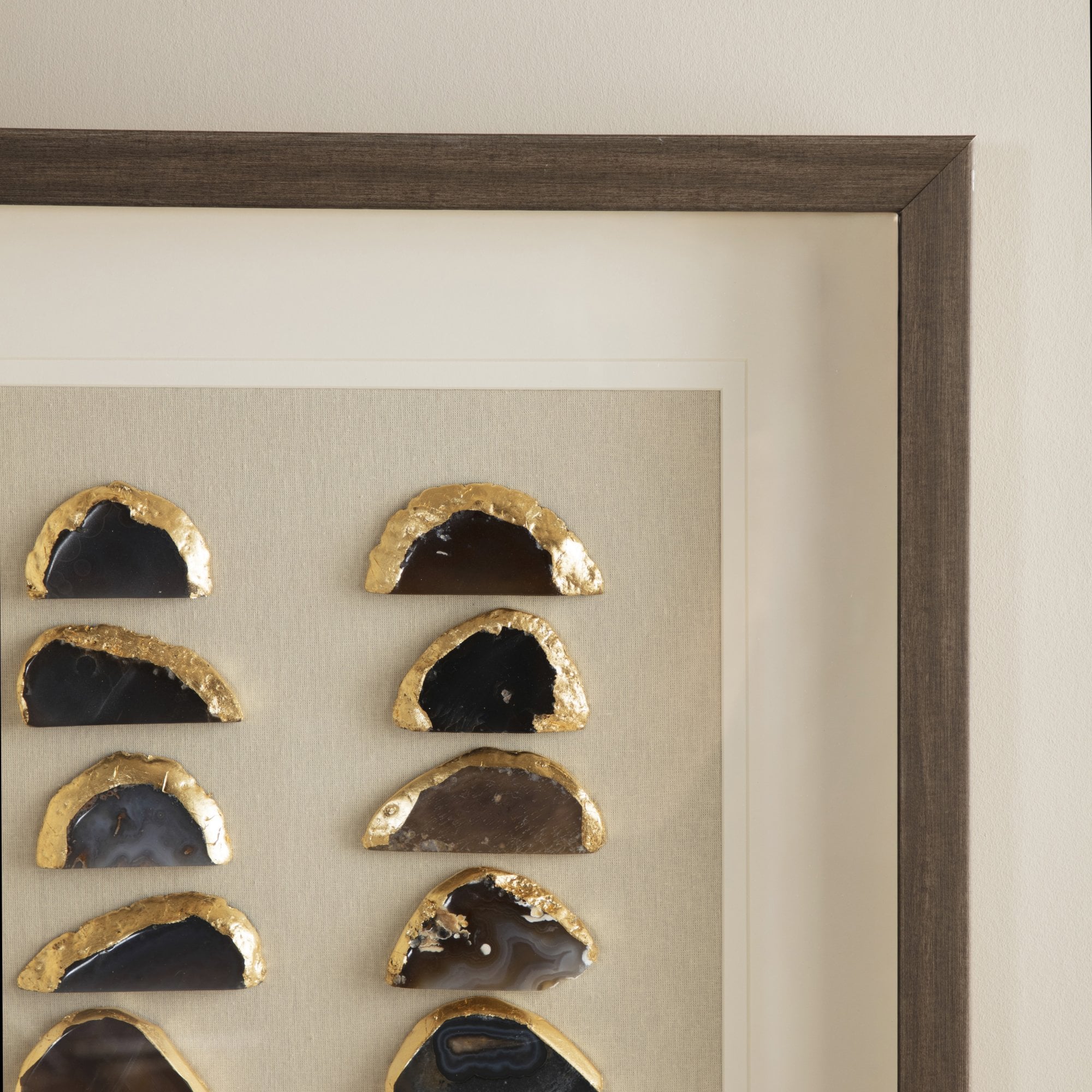 An exquisite wooden frame showcasing 24 naturally shaped Agate pieces, elegantly mounted on a neutral linen canvas—a harmonious blend of earthy tones and organic beauty.