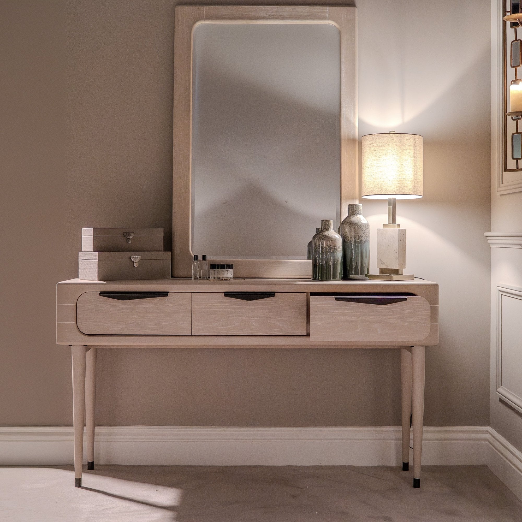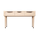 Elevate your entryway or living space with this beautifully designed console table. Featuring three drawers for organized storage, it is crafted from premium light oak wood with a smooth matte finish. The slim profile makes it ideal for narrow spaces like hallways, while the rounded corners and tapered legs give it a refined yet approachable look. Its black handles provide a modern contrast and add a touch of boldness. Use it as a display surface for décor or as a functional table for everyday essentials.