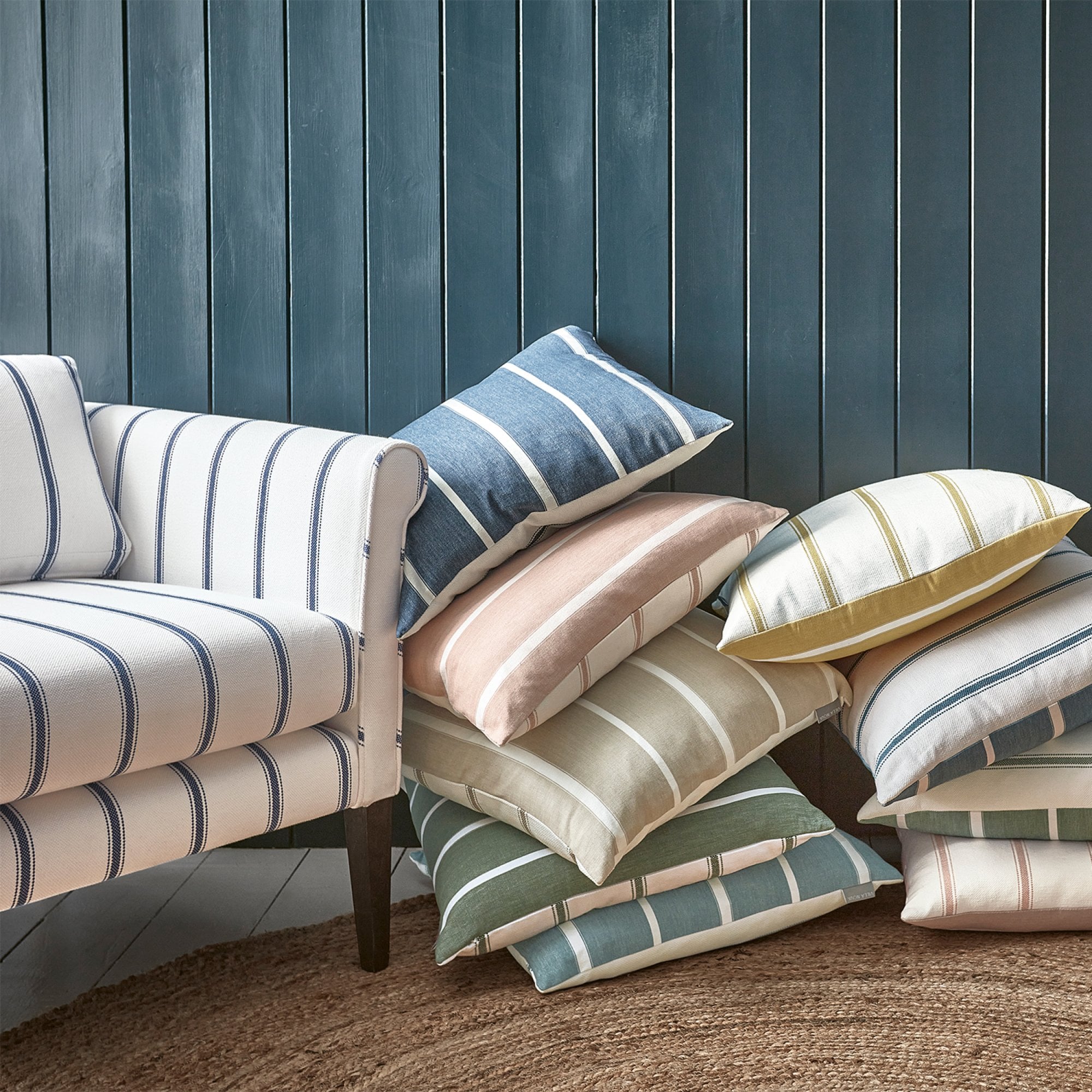 Featuring the Tiber and Reno stripes in contrasting colours from the Marne collection, this smart cushion makes a simple statement of elegance.