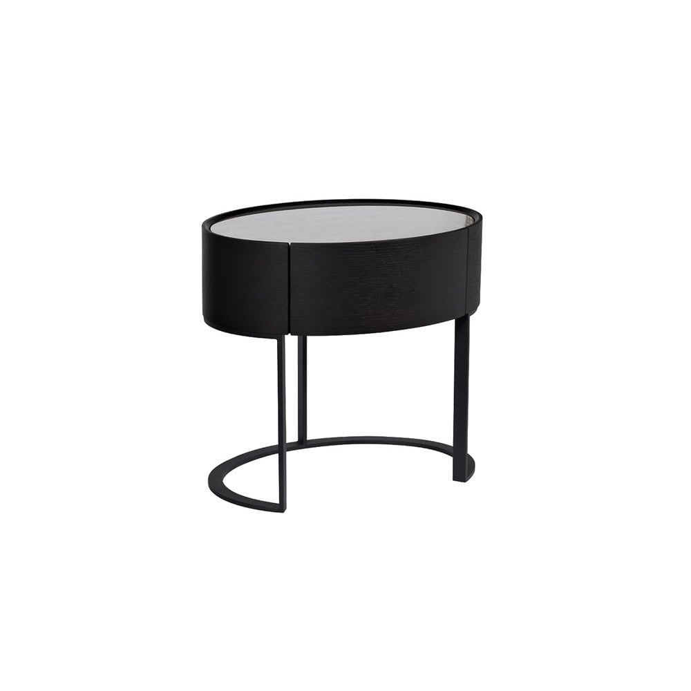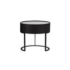The Verge Bedside Table effortlessly blends functionality and contemporary aesthetics to complement any modern bedroom setting. Crafted with a sleek black oak veneer finish, its sophisticated taupe glass top adds an elegant touch while ensuring durability. The table's design is further accentuated by its powder-coated black metal legs, which offer stability and a stylish contrast.