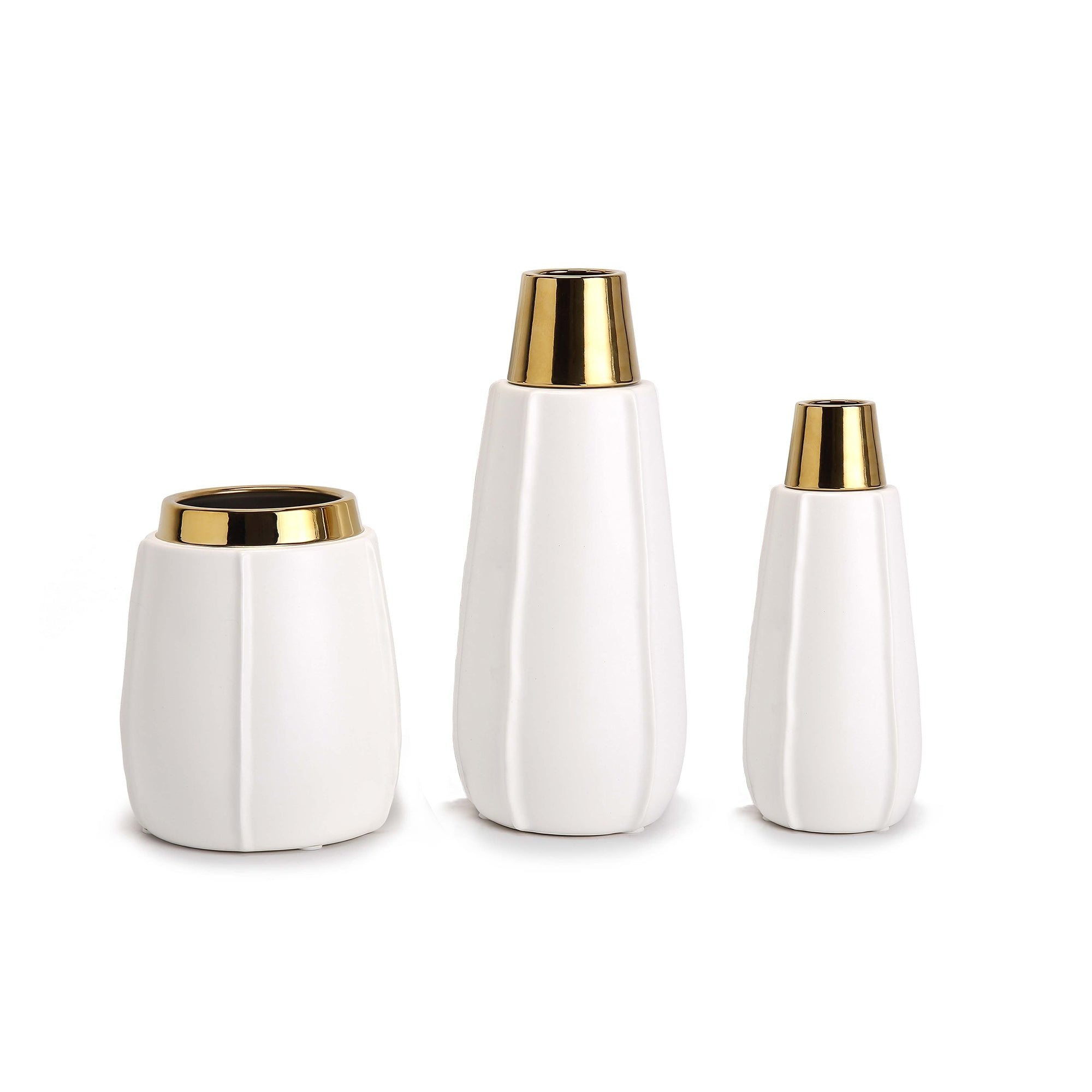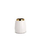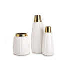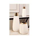 The small Vicar Vase exudes elegance with its simplistic white ceramic design and polished gold accents. Whether used to showcase flowers or in an artistic grouping, this charming piece brings a touch of sophistication to any space. Available in three sizes, it’s ideal for both homes and hospitality environments. Remember to avoid prolonged exposure to liquid.