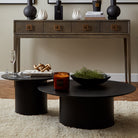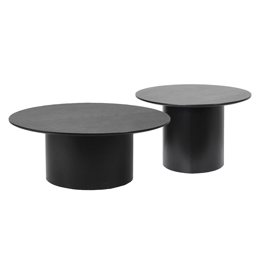 A set of 2 black wooden veneer round tables is a stylish and functional furniture ensemble. These tables feature a sleek black finish with a wooden veneer, giving them a modern and sophisticated look. Their round shape adds a touch of elegance and versatility, making them suitable for various spaces in your home. Whether used as side tables in the living room, nightstands in the bedroom, or accent tables in any room, this set offers both aesthetic appeal and practicality.