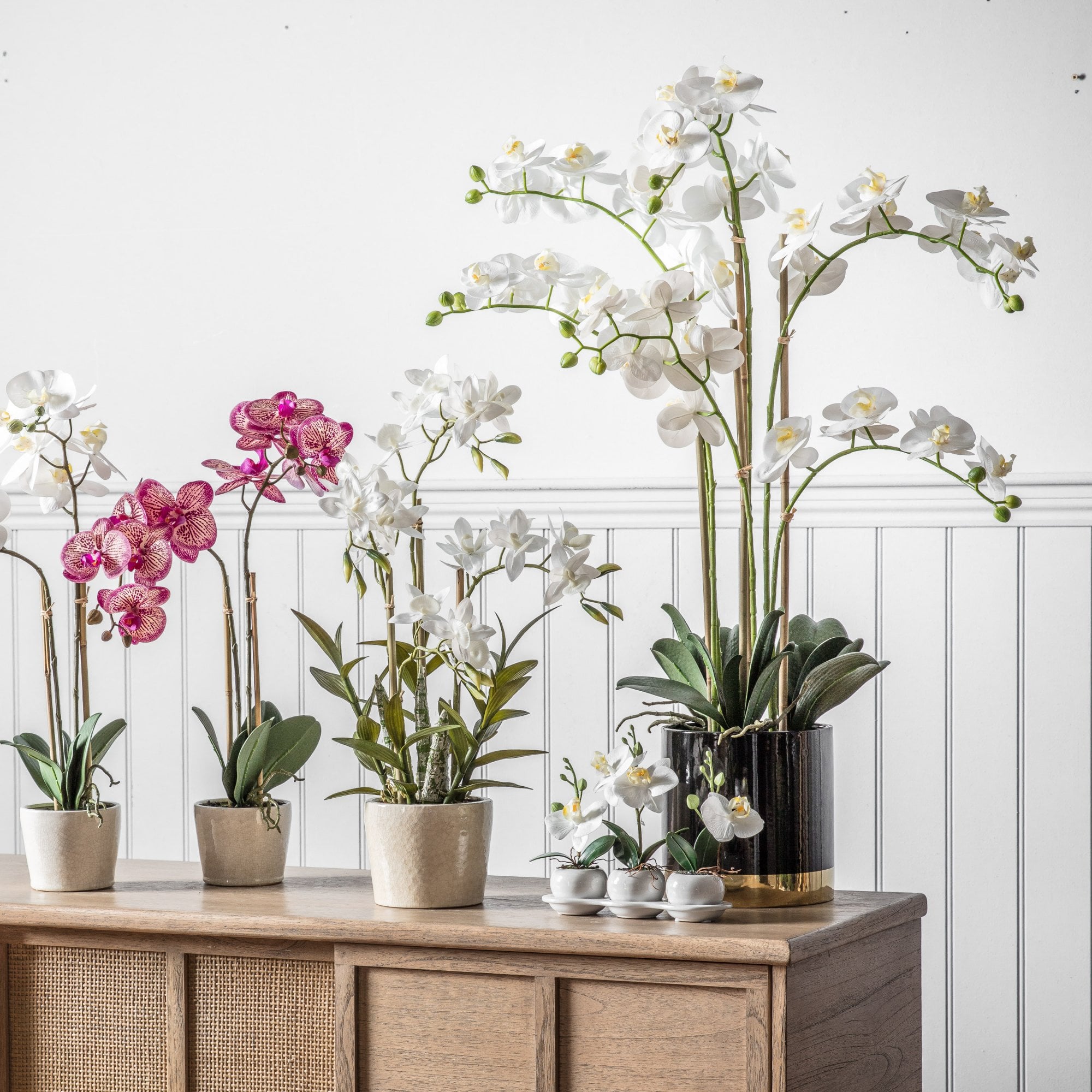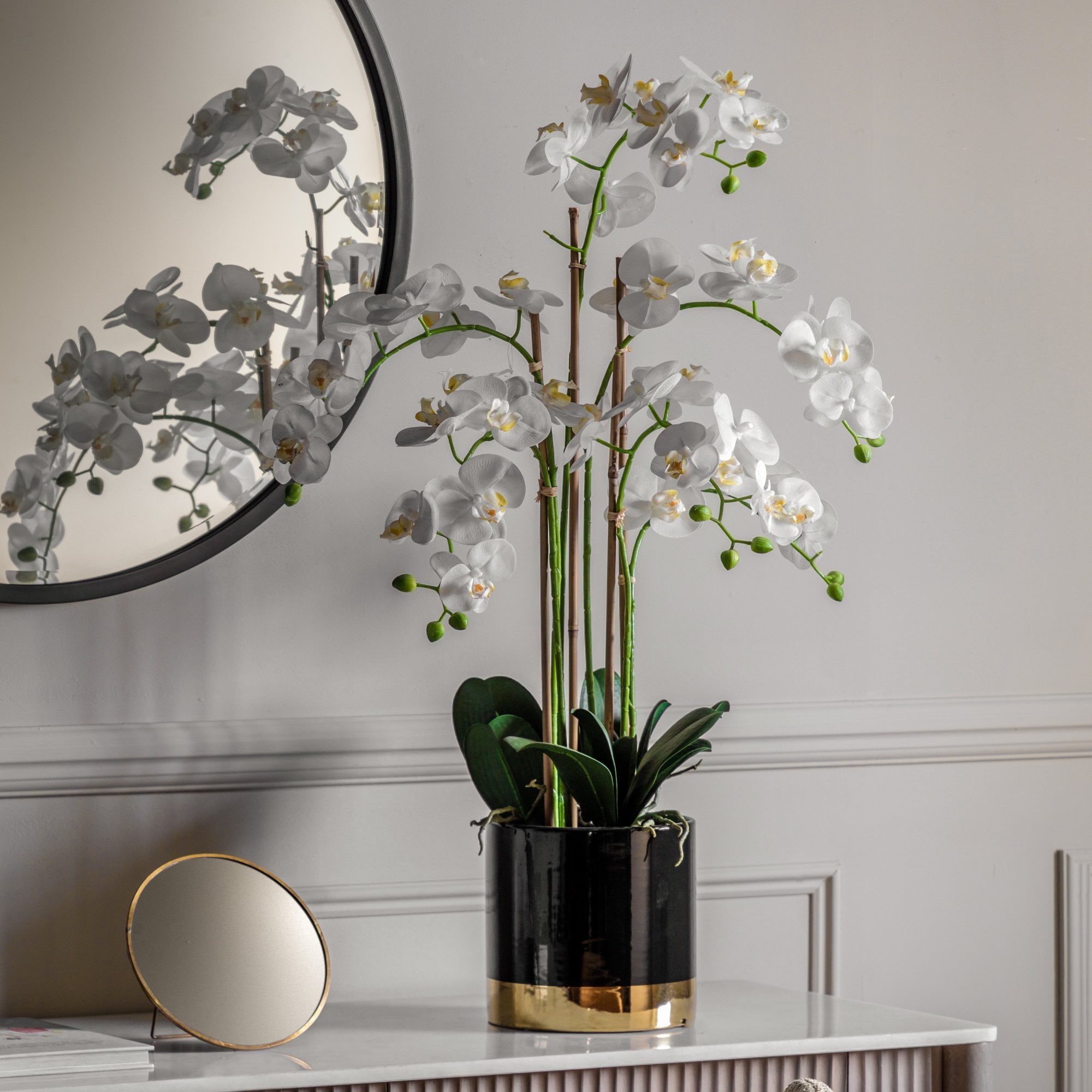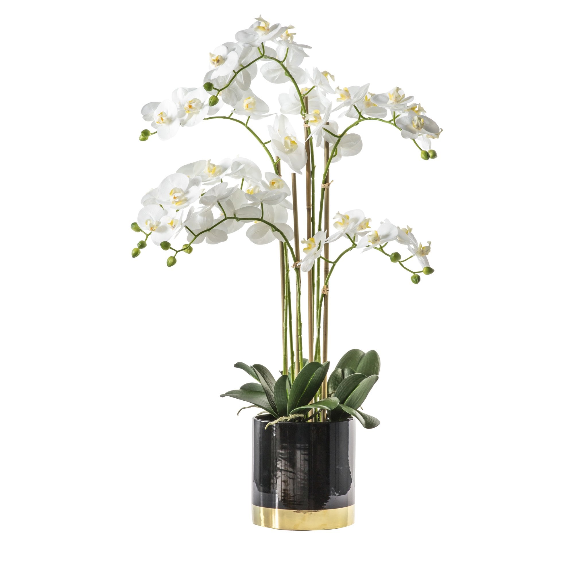 Add a touch of glamour to a room with this stunning Orchid in an eye-catching black and gold pot.