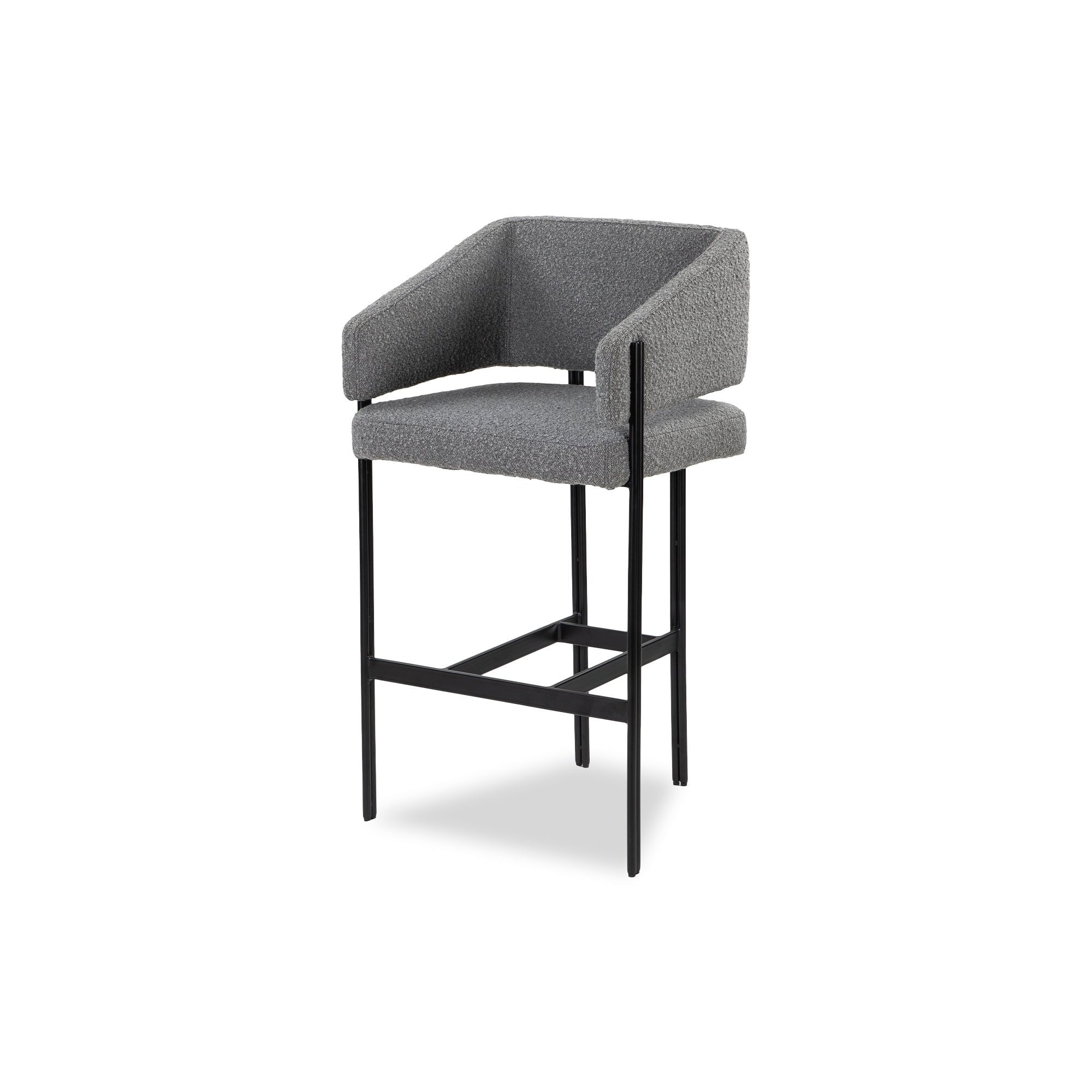 Embrace sophistication with the small Tatler Bar Stool, a modern twist on an elegant classic. Upholstered in luxurious boucle grey, its cosseting curved back provides exceptional comfort. Supported by sleek matt black coated steel legs, this bar stool perfectly fits smaller spaces while still delivering style and functionality, ideal for contemporary dining settings or stylish clubs.
