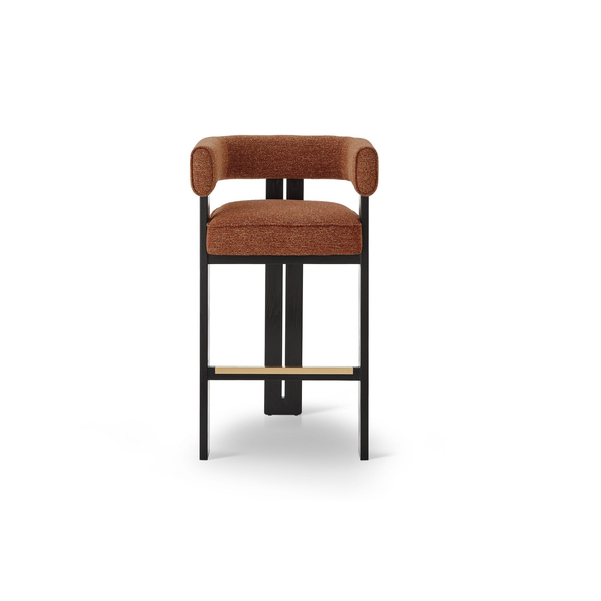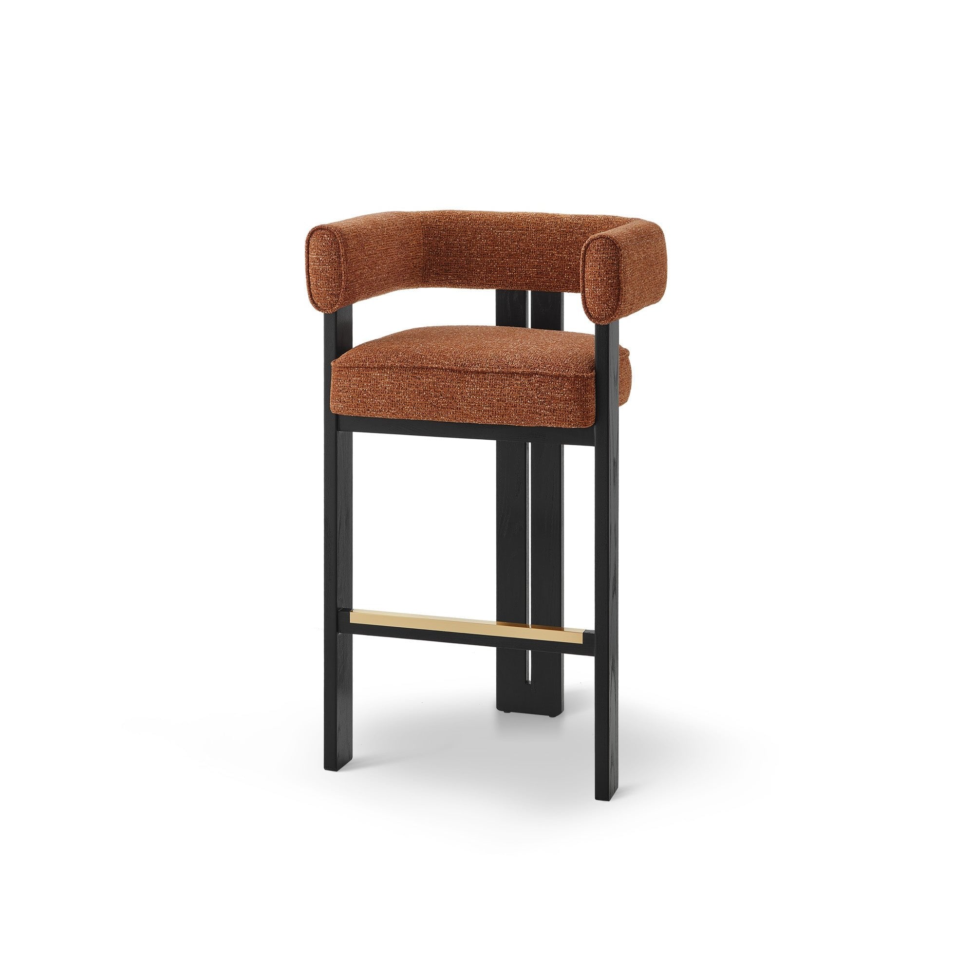 The Tilda Bar Stool in Bari Chestnut Red captivates with its vibrant upholstery, effortlessly merging comfort and style. Curved to perfection, it offers both aesthetic appeal and ergonomic support. Crafted from sustainable recycled fabric and sturdy Matt Black Solid Ash Wood, this stool suits both hospitality and residential settings, adding modern flair to lounges, dining areas, or your kitchen.